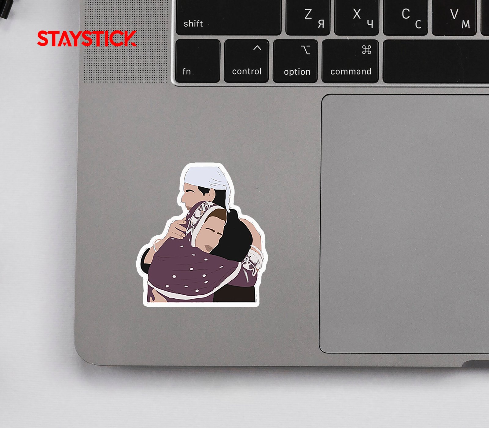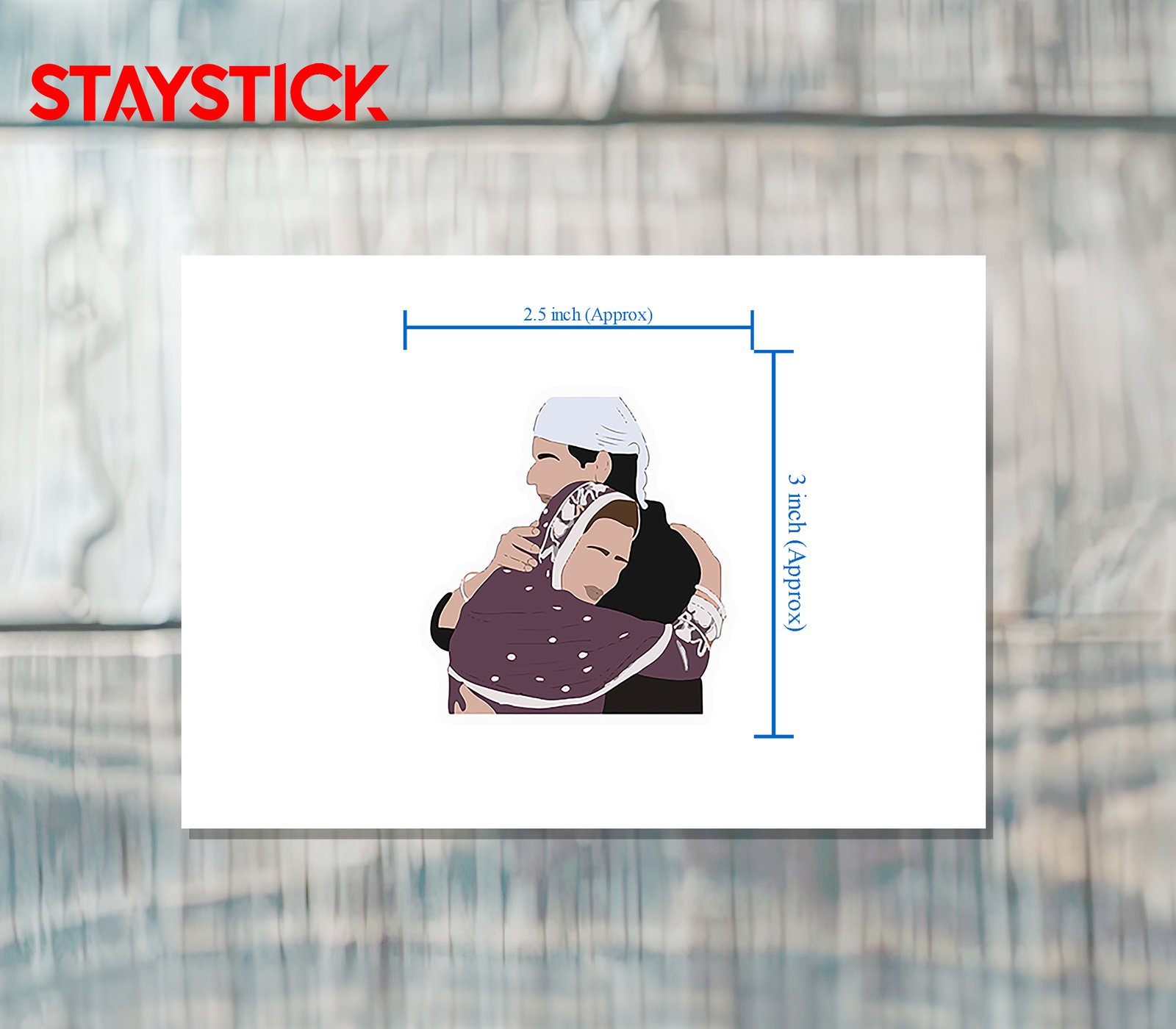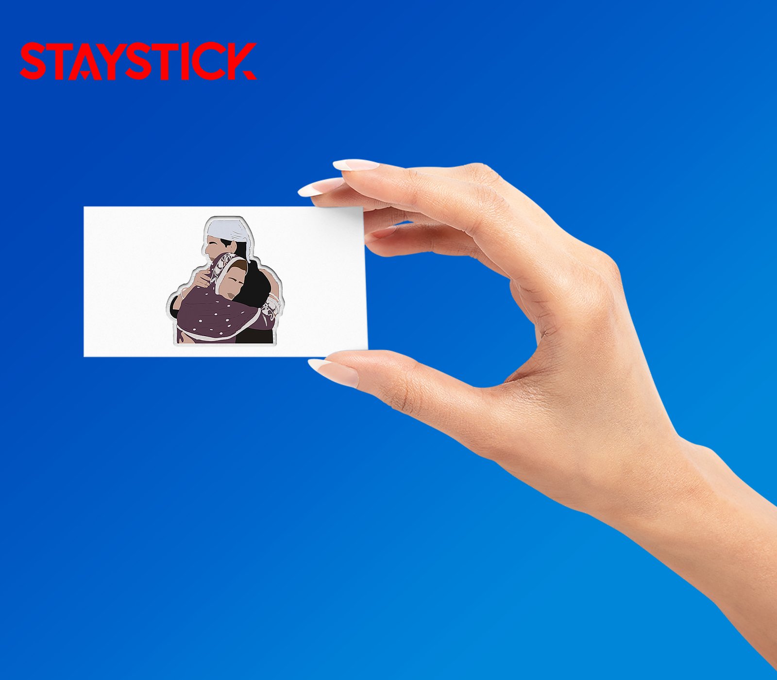 Ideal for messaging themes of family, support, cultural tradition, or welcome: the composition focuses on the embrace, folded hands, and textured scarf pattern. A white die-cut border ensures strong contrast on darker surfaces.