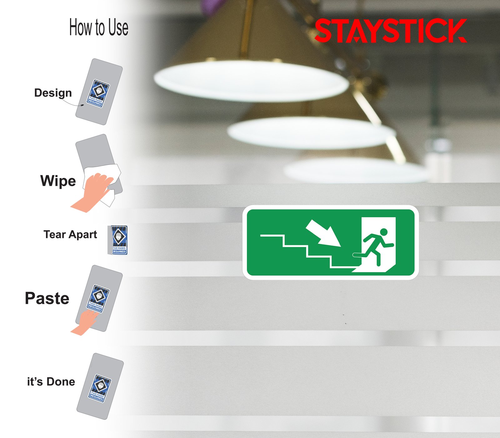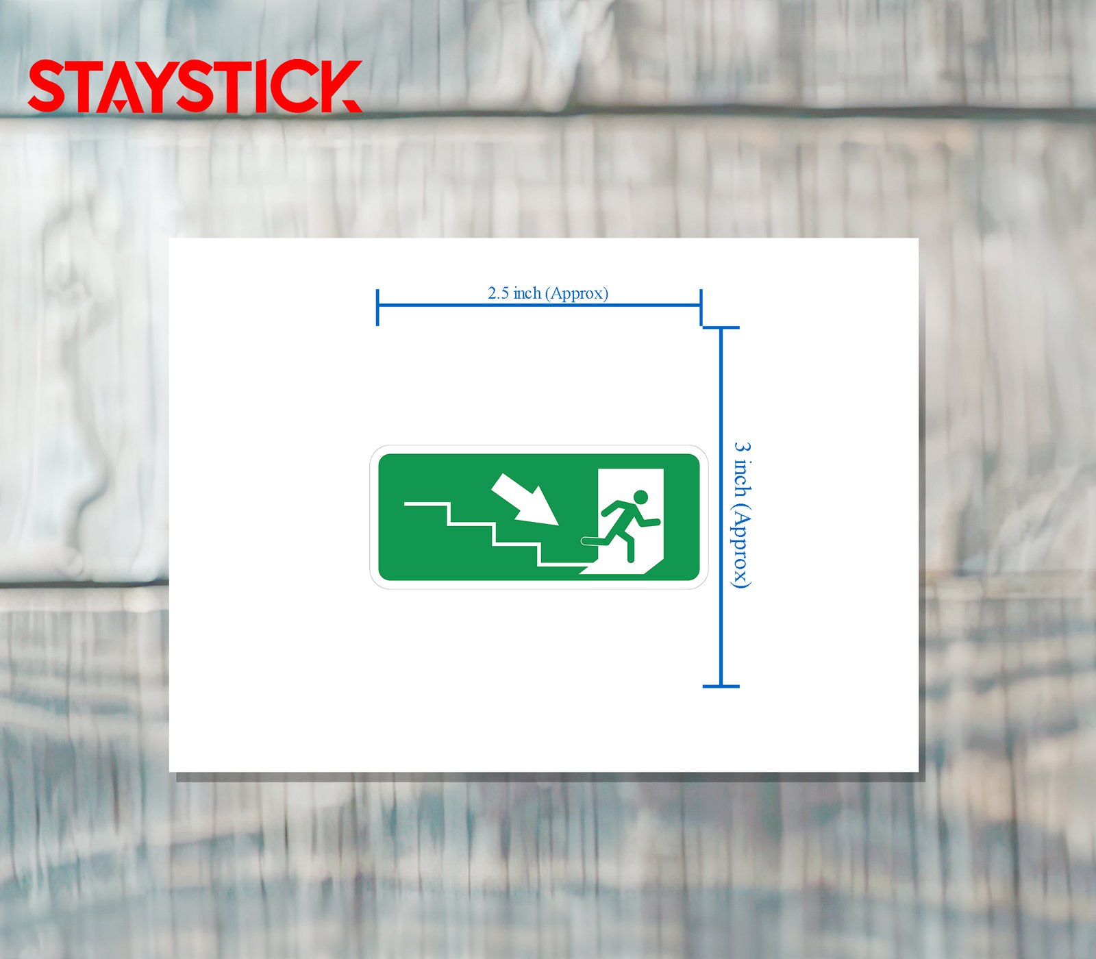 “Emergency exit with downward stairs sign.Fire escape route leading downstairs.Exit sticker showing staircase evacuation.”