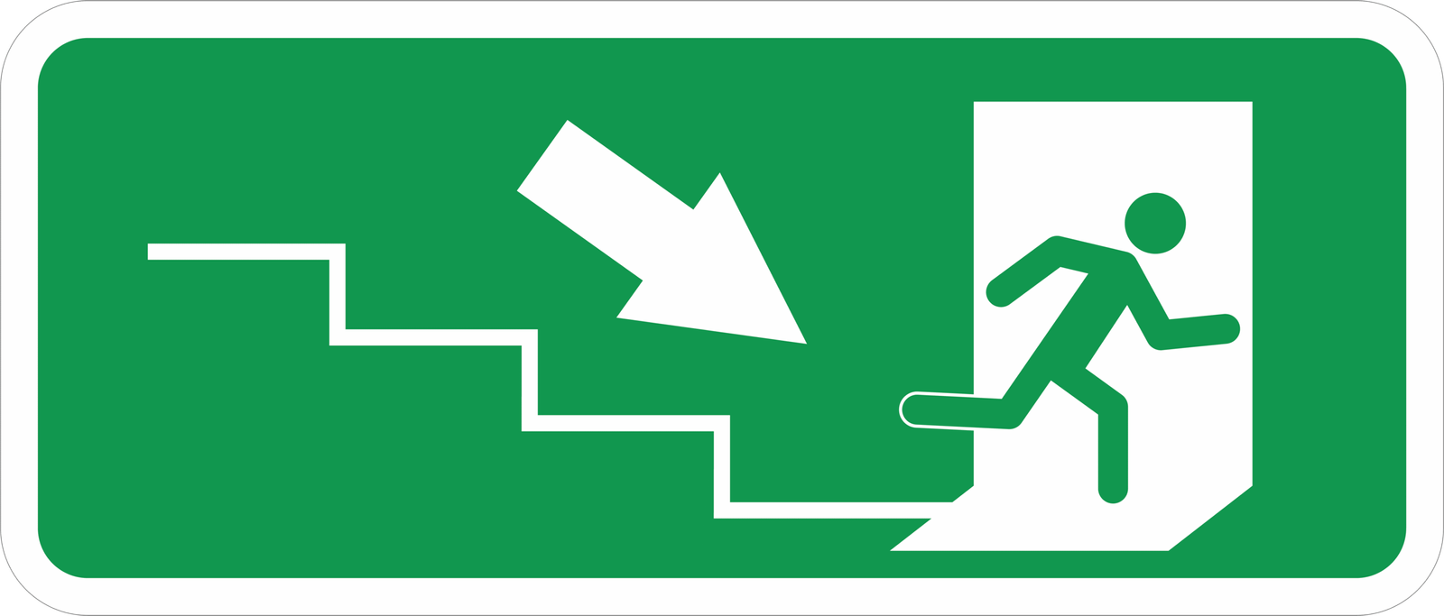 “This sticker features a green background with a white pictogram of a person running through a doorway and an arrow pointing diagonally downward towards stairs. It indicates a safe emergency exit route leading downstairs during evacuations.The emergency exit down stairs sticker is designed for safety signage in buildings. The running figure, open doorway, and downward arrow combined with a stair symbol clearly direct occupants to use the staircase to exit safely in case of fire, earthquake, or other emergencies.”