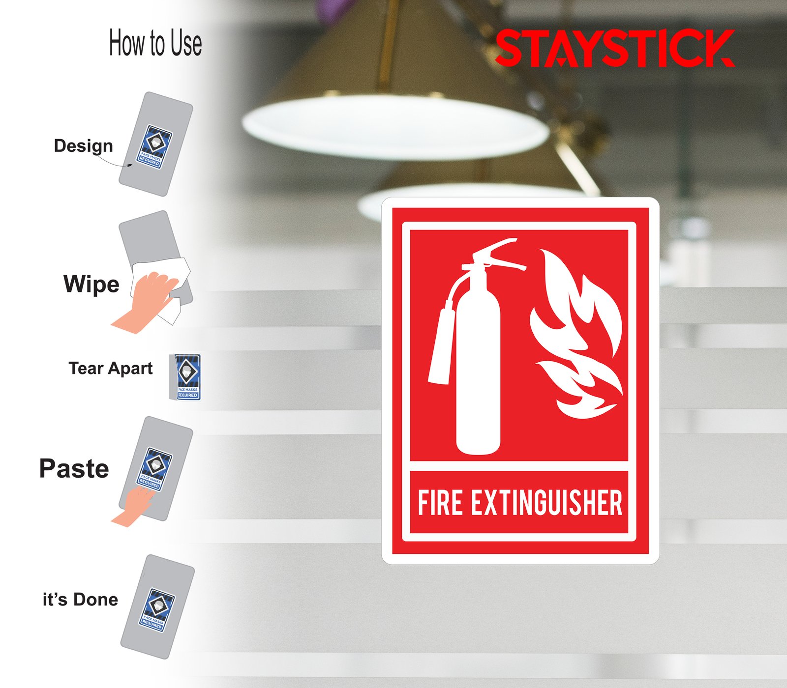 “Fire extinguisher location sticker.Red safety sign with extinguisher symbol.Emergency fire extinguisher marker.”