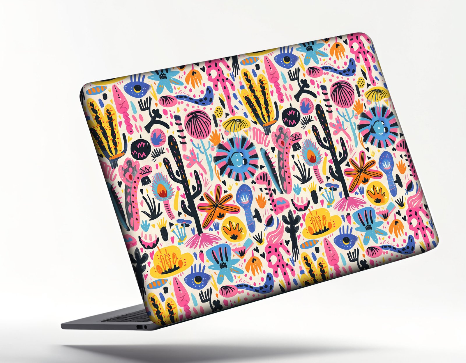 A colorful botanical laptop sticker with playful floral and cactus illustrations in bold, vibrant tones.