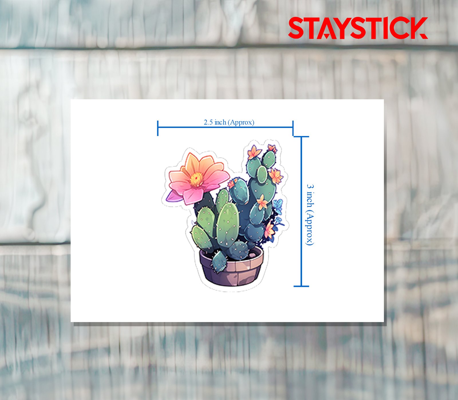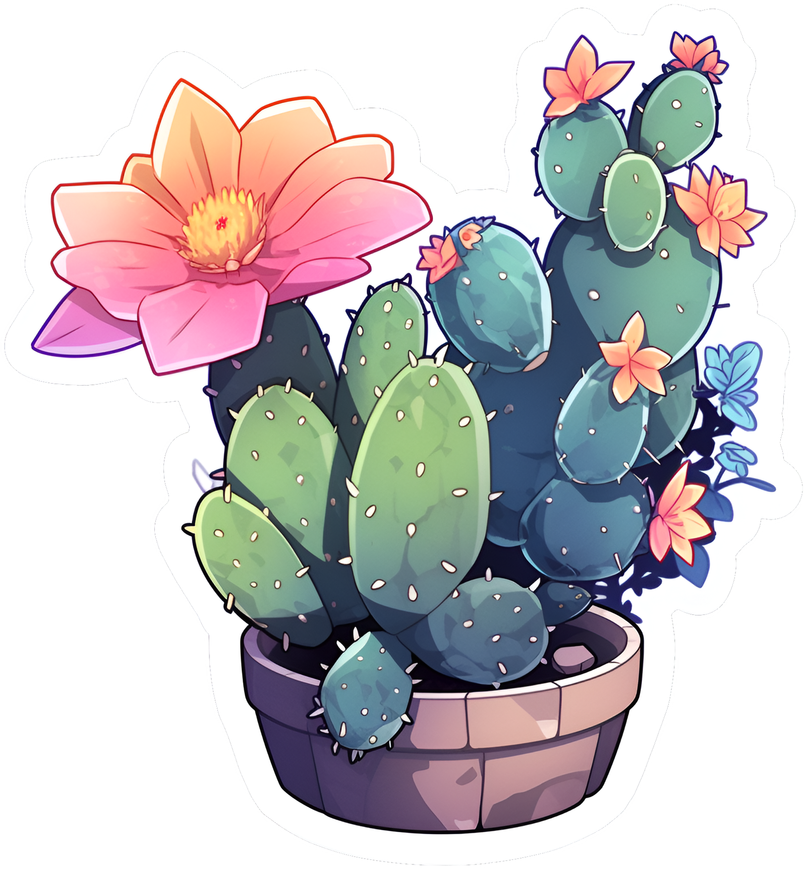 This sticker features a beautifully illustrated potted cactus, designed with a mix of vibrant colors and soft artistic details. The cactus pads are a lush green, covered with tiny white spines that add authenticity, while vivid blossoms in shades of pink, orange, and blue bloom gracefully across the plant. The large, striking pink flower stands out as the centerpiece, symbolizing resilience and beauty even in the harshest conditions. Placed in a simple clay pot, the cactus radiates warmth, charm, and life, making it both calming and uplifting to look at. This sticker is perfect for adding a splash of nature-inspired positivity and aesthetic elegance to journals, laptops, water bottles, or any collection.