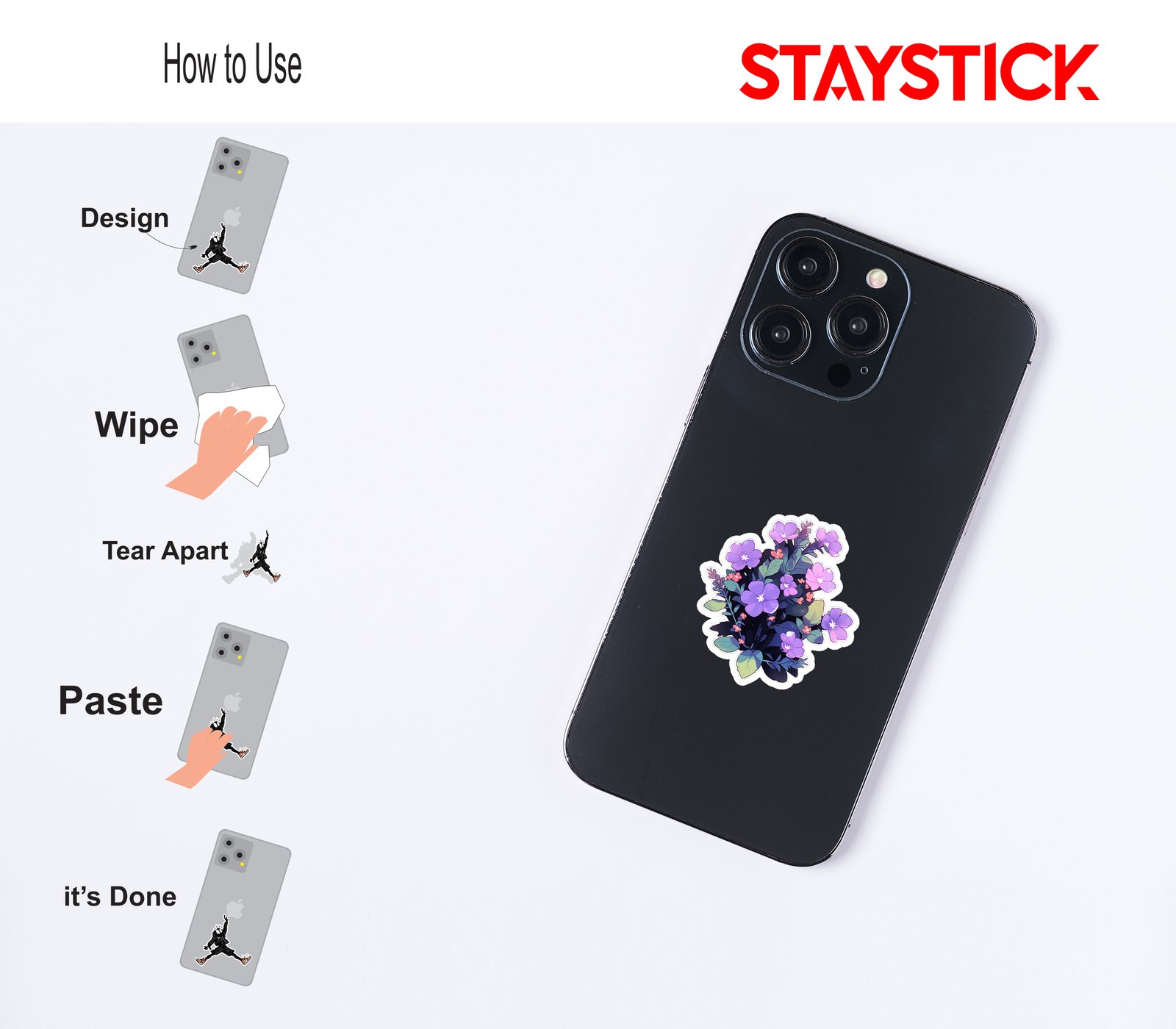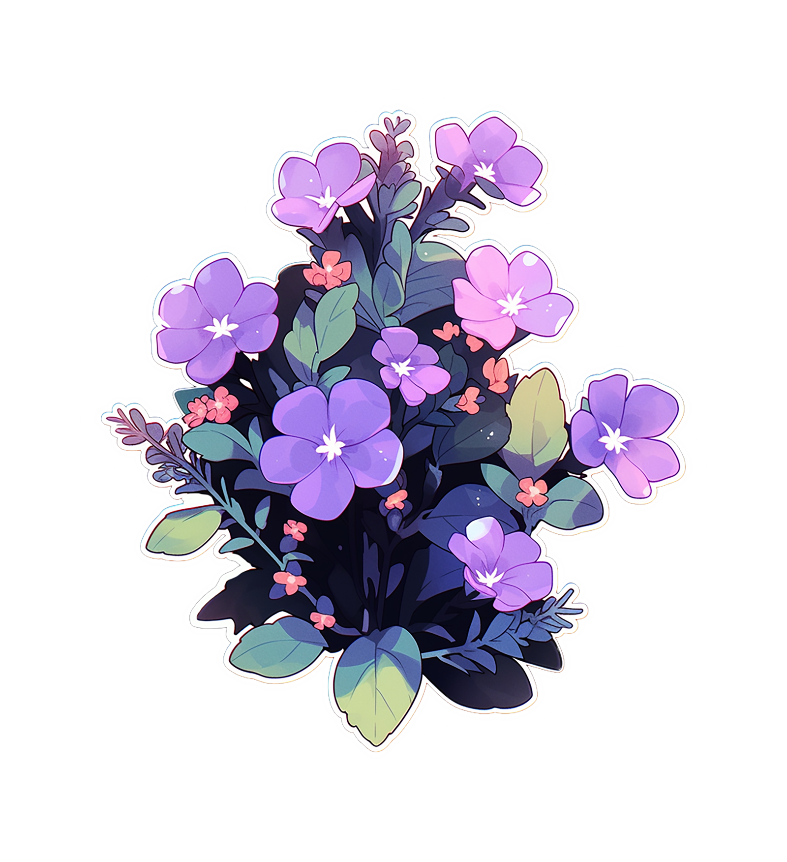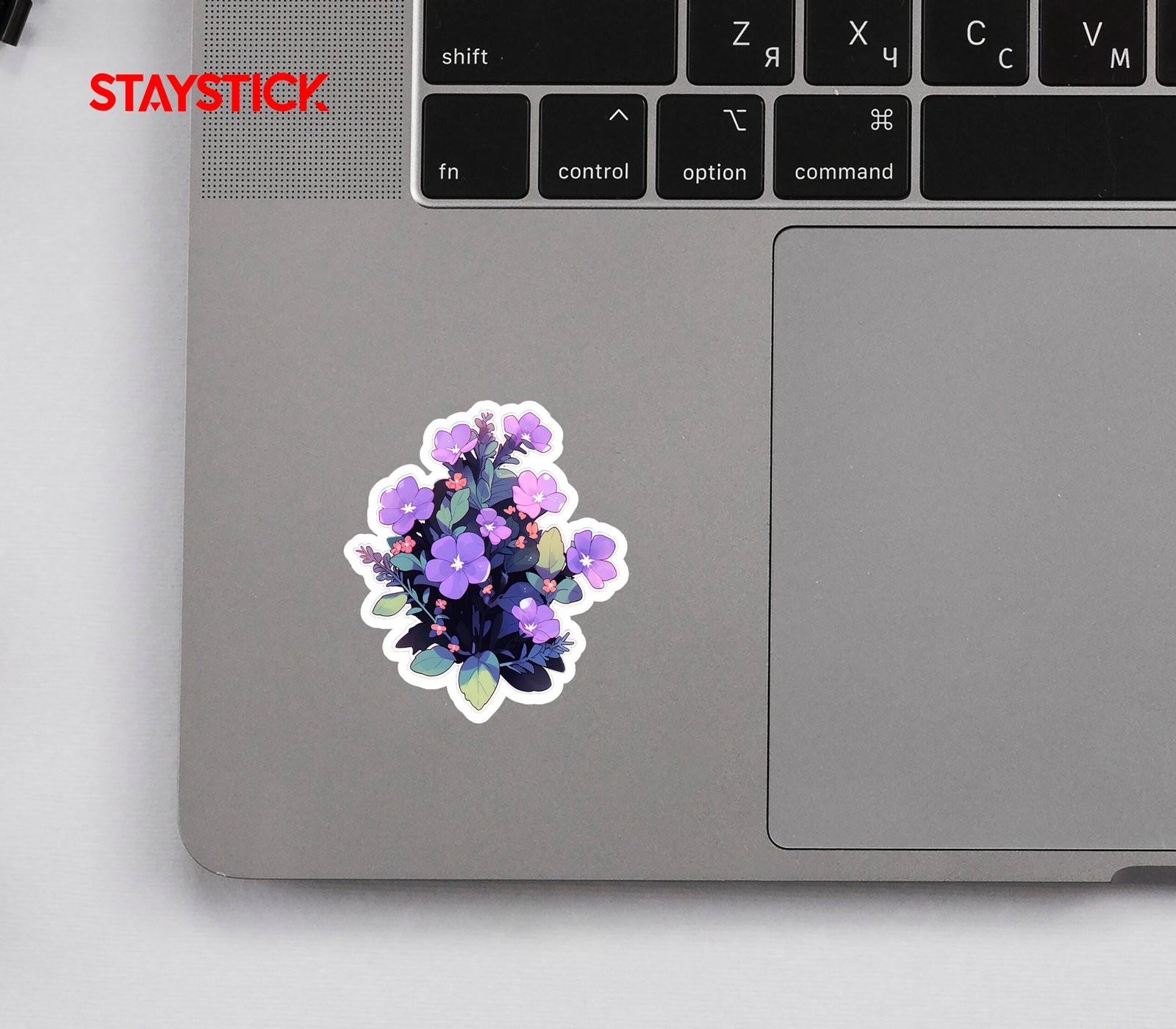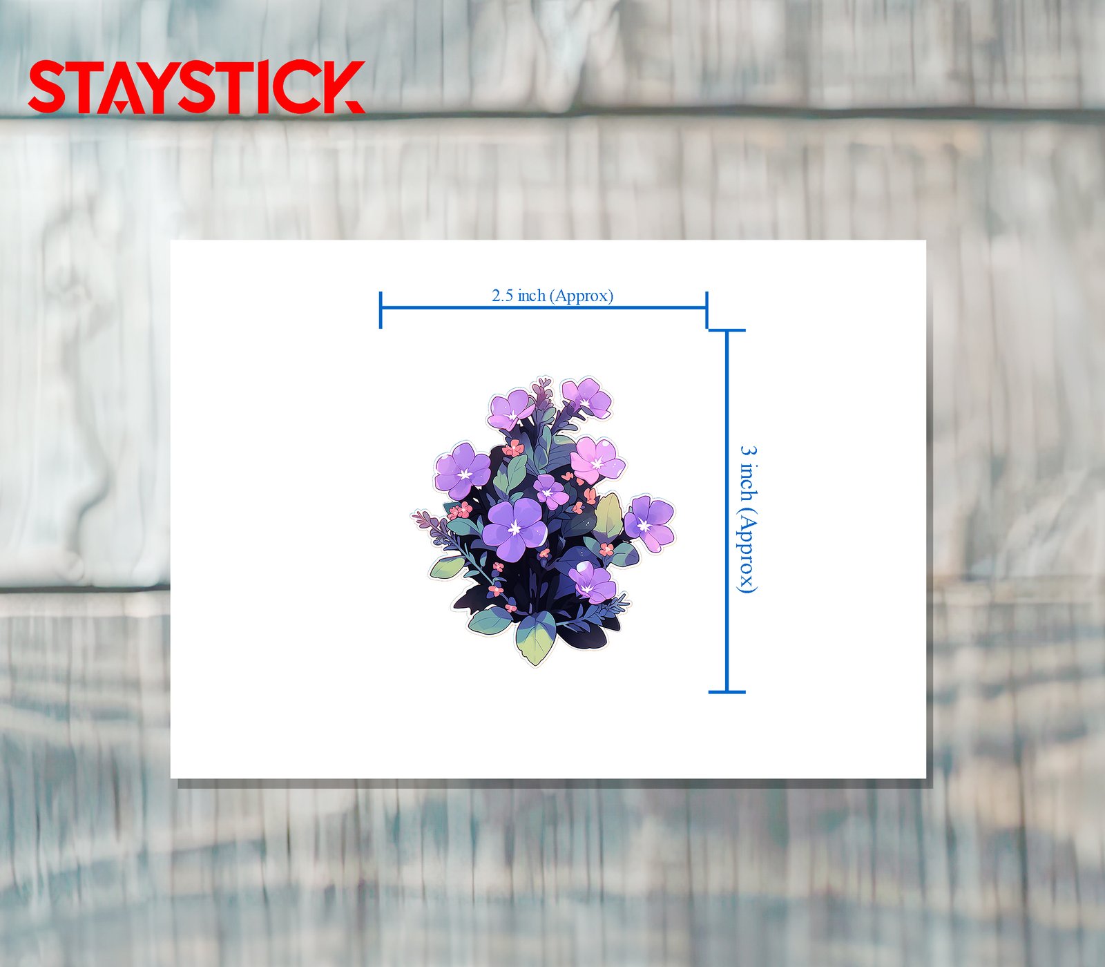 A charming sticker featuring a dense bouquet of stylized purple flowers and mixed green foliage. Soft cel-shading and subtle highlights give each petal a glossy, hand-illustrated look; tiny coral blossoms add contrast while a clean white sticker border makes it pop on dark or light surfaces.