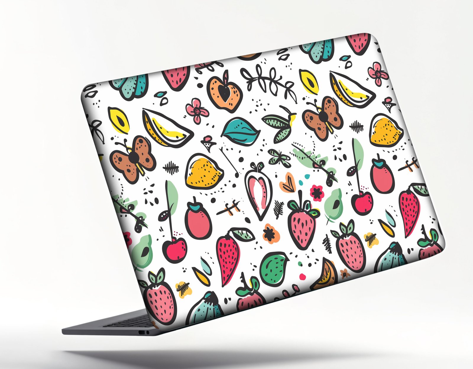 This laptop sticker brings a burst of freshness and charm to your device with its colorful, hand-drawn fruit and nature-inspired illustrations. The lively pattern features strawberries, cherries, lemons, butterflies, flowers, and whimsical leaves in a cheerful mix of reds, oranges, greens, and yellows. Set against a clean white background, the design pops with personality while maintaining a light, modern aesthetic. Perfect for anyone who loves nature, gardening, or fruity vibes, this sticker not only beautifies your laptop but also helps protect it from scratches and everyday wear.