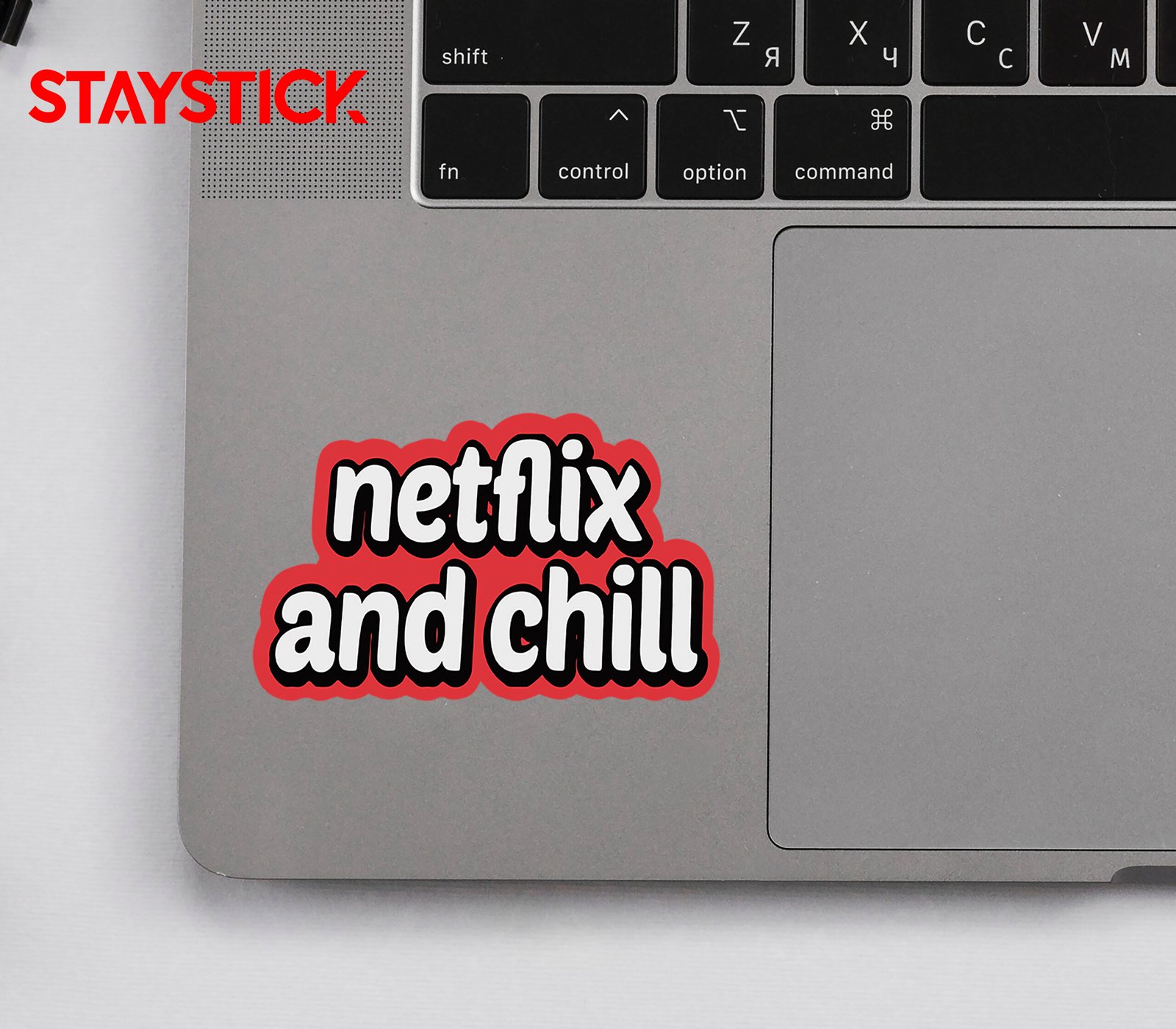 This sticker features the popular phrase “Netflix and chill” in bold, playful white text with a black outline and a red background, giving it a fun and eye-catching look.