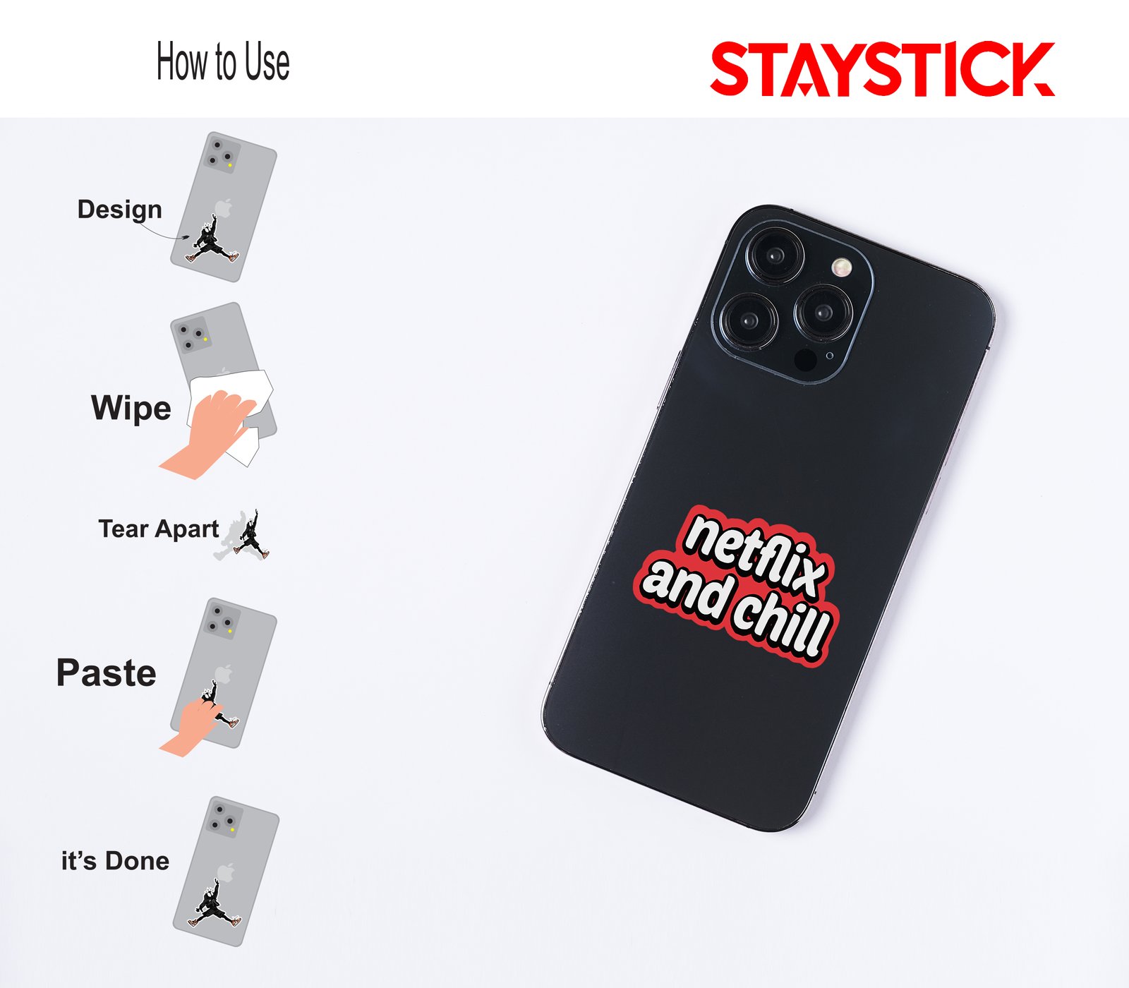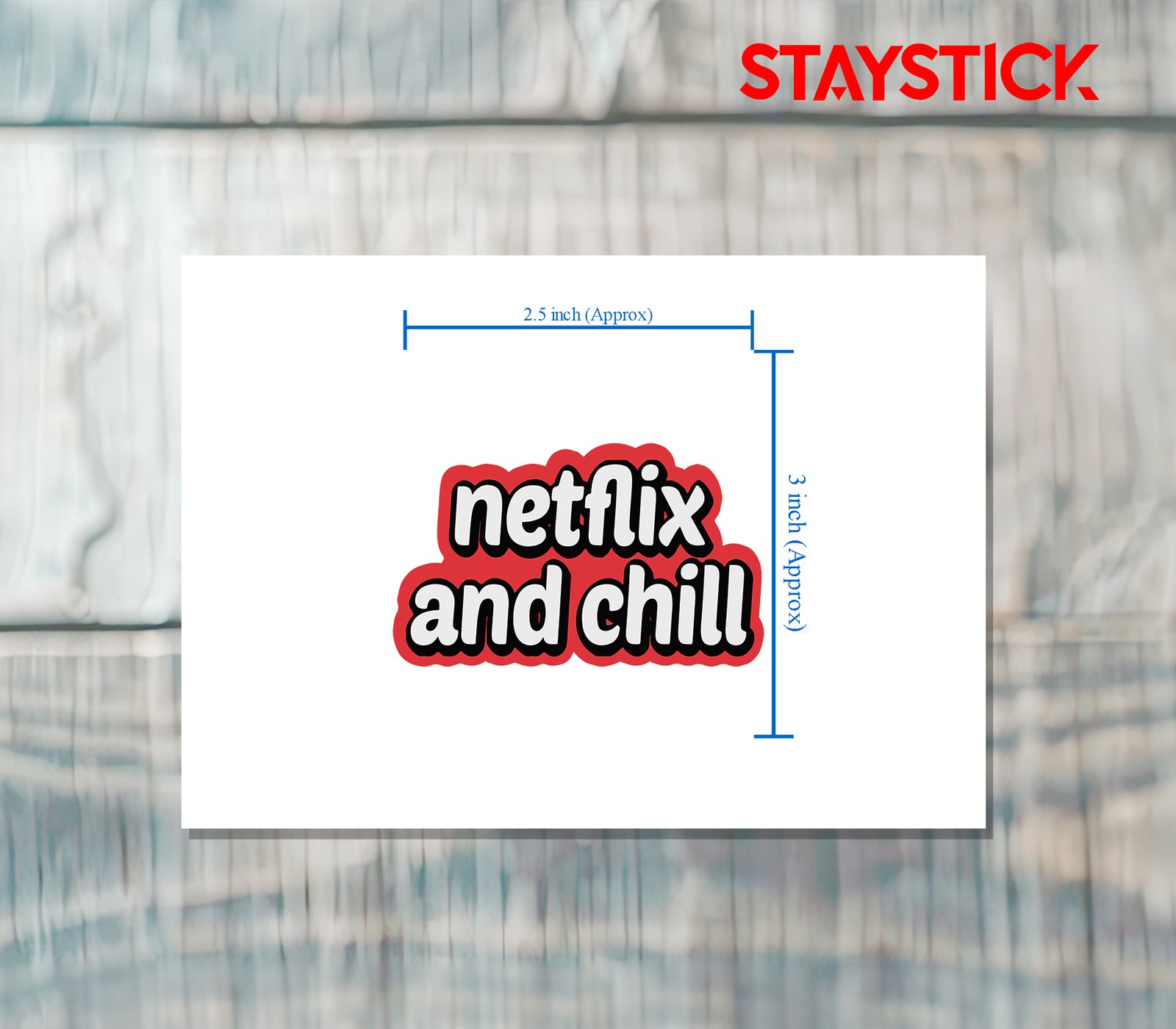 This sticker displays the trendy and widely recognized phrase “Netflix and chill”, styled in a bold and playful font. The words are written in white with a thick black outline, giving them a strong, clear contrast against the vibrant red cloud-like background that surrounds the text. The design has a fun, modern, and eye-catching look, making it perfect for laptops, water bottles, notebooks, or even walls. Beyond its literal meaning of relaxing while watching Netflix, the phrase has also become a cultural expression associated with hanging out and spending casual, enjoyable time with someone. The overall design of the sticker captures both a lighthearted and trendy vibe, appealing especially to fans of pop culture and internet humor.