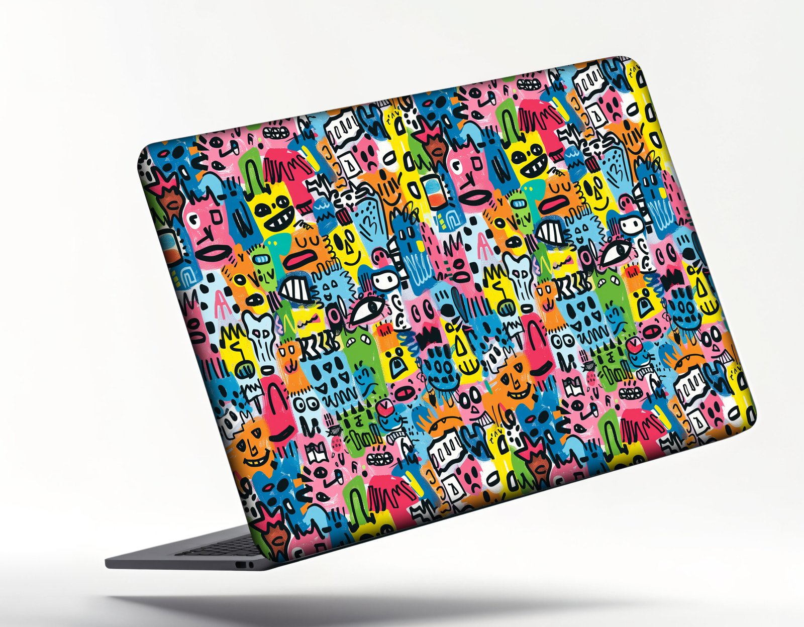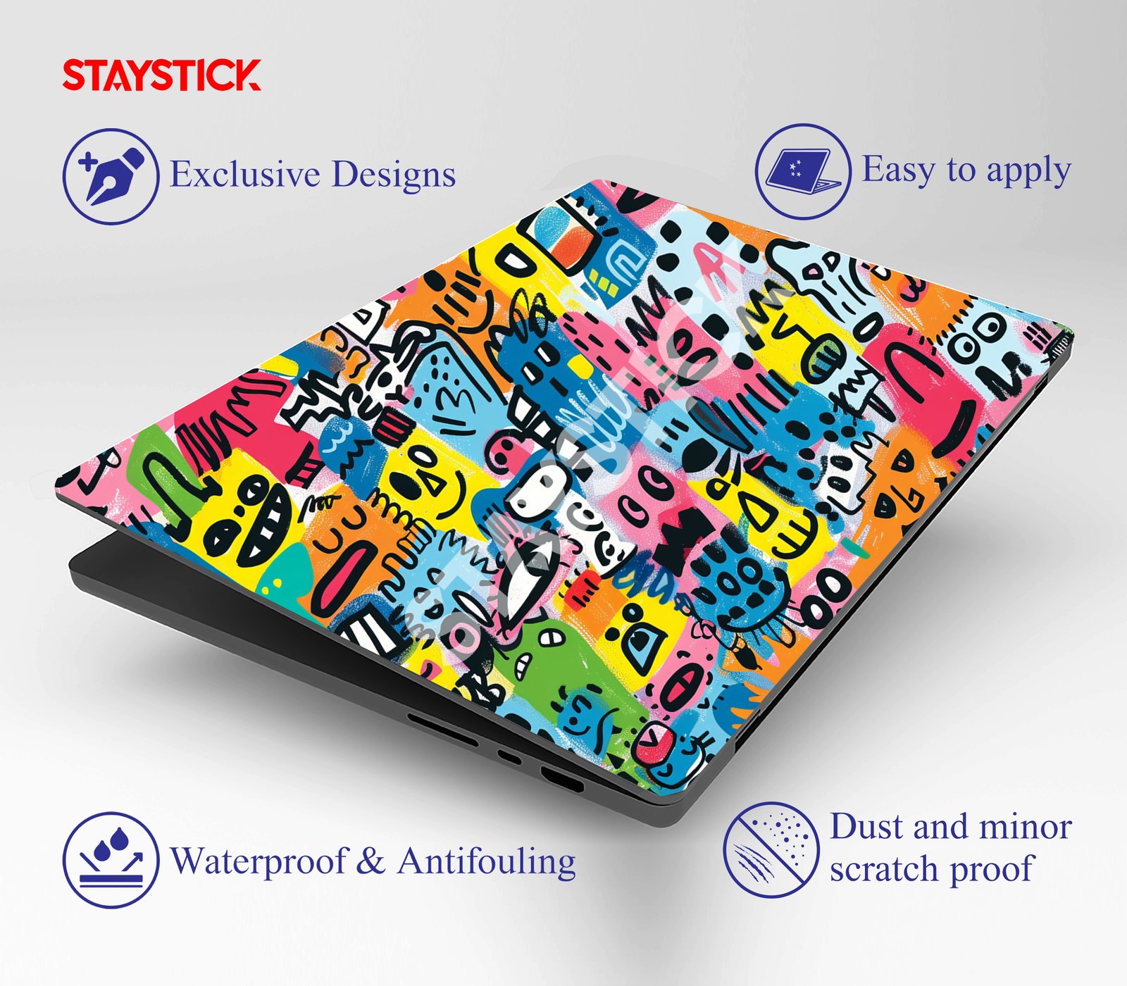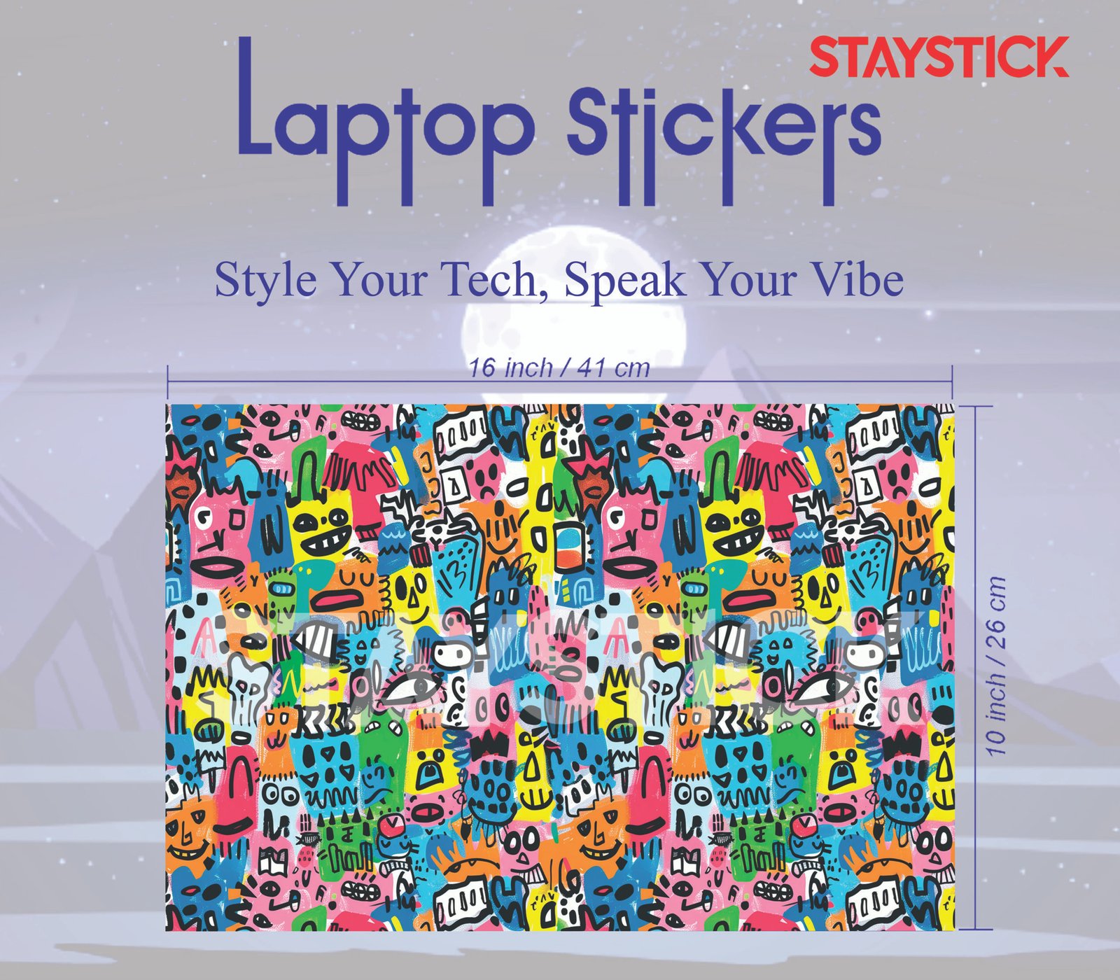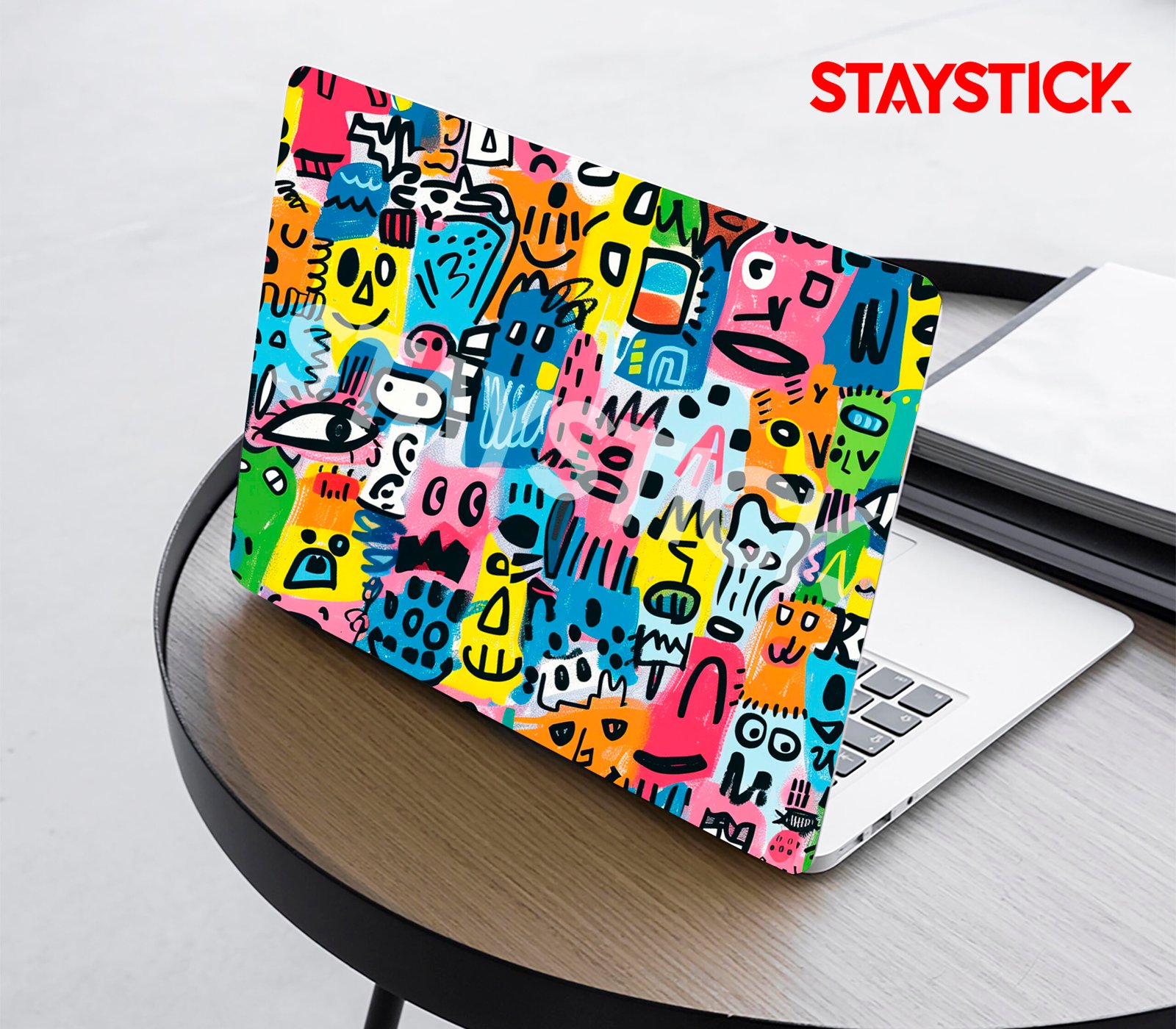 This laptop sticker bursts with life and personality, featuring a dense, graffiti-inspired collage of quirky doodle characters, bold shapes, and playful patterns. Its hand-drawn, street-art aesthetic combines vibrant colors — including yellow, pink, blue, orange, and green — with expressive faces, abstract forms, and edgy details that make your device look like a portable piece of urban art. Perfect for artists, trendsetters, and anyone who loves a bold, modern, and unconventional look, this sticker not only personalizes your laptop but also adds a layer of protection against scratches and everyday wear while making a loud, creative statement.