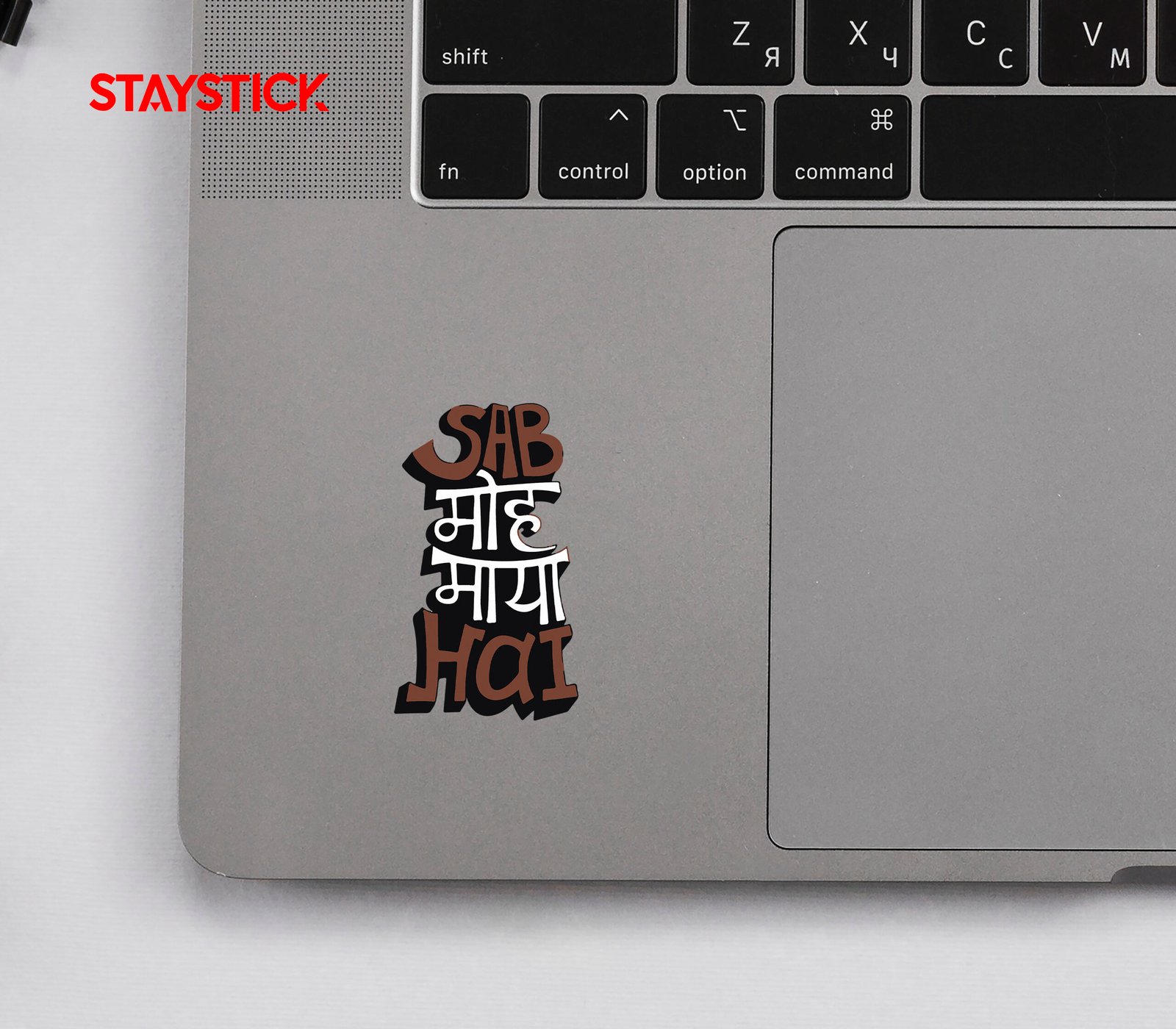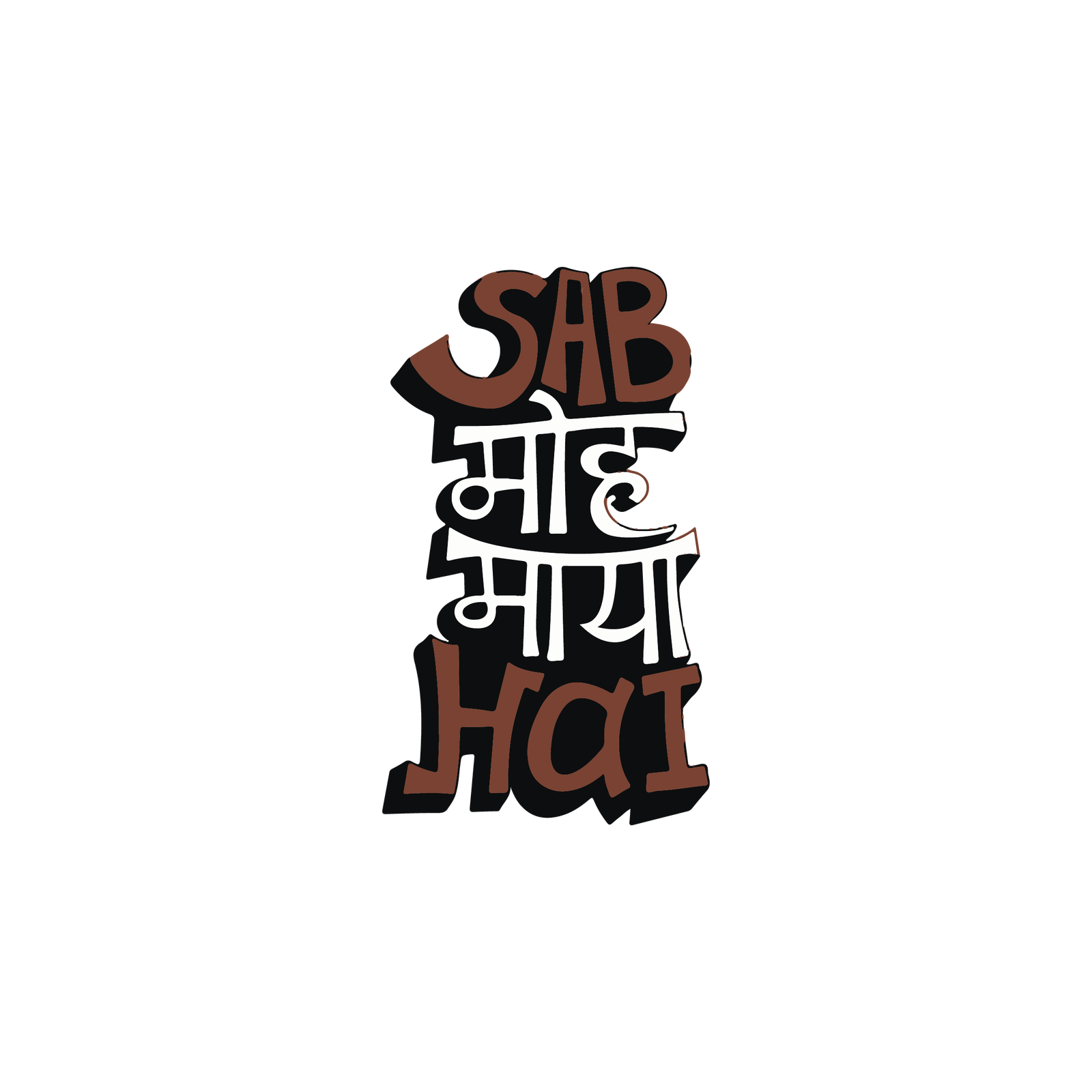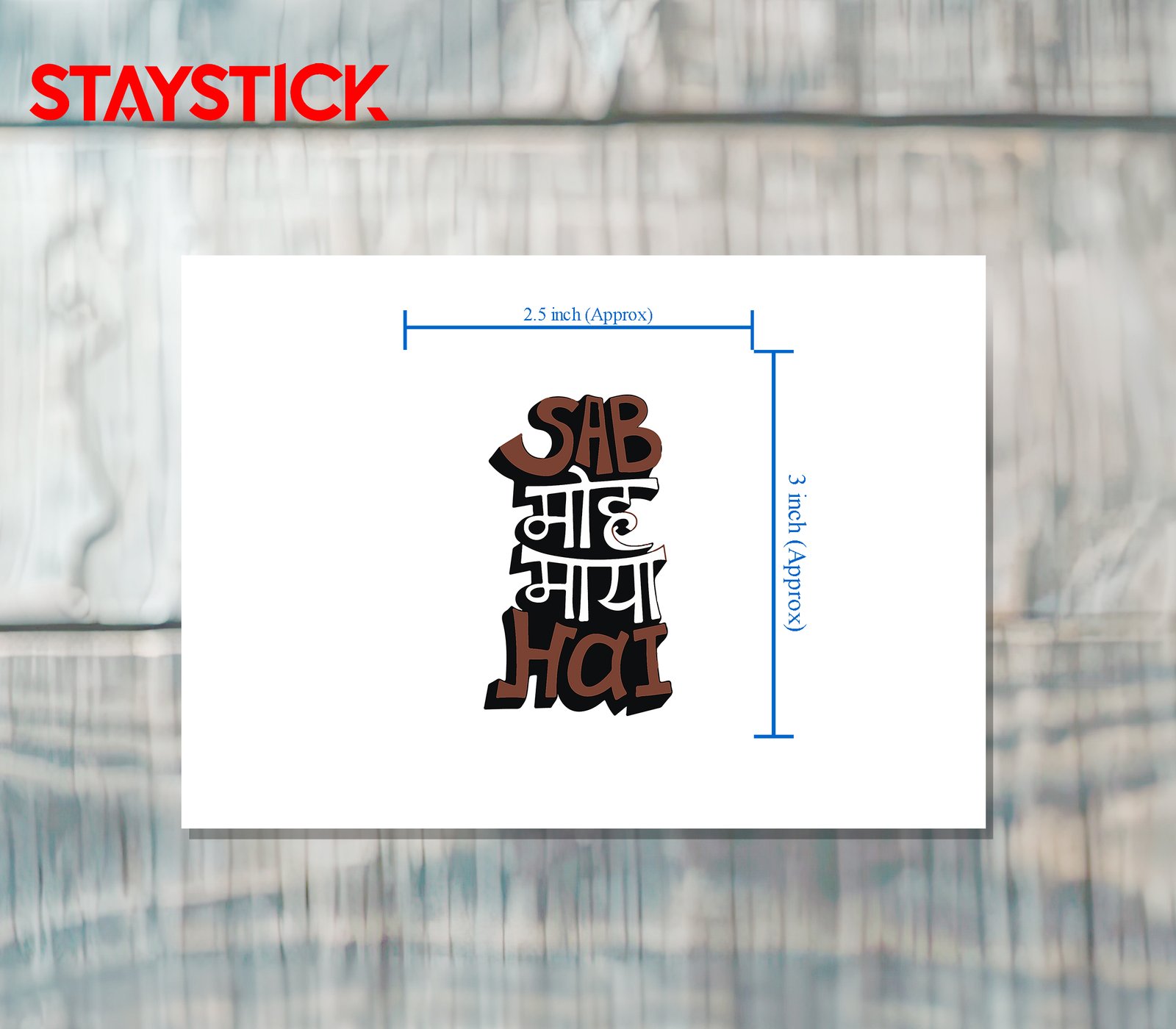 Vertical die-cut typographic sticker reading “SAB MAYA HAI” in stacked Devanagari+Latin mix.