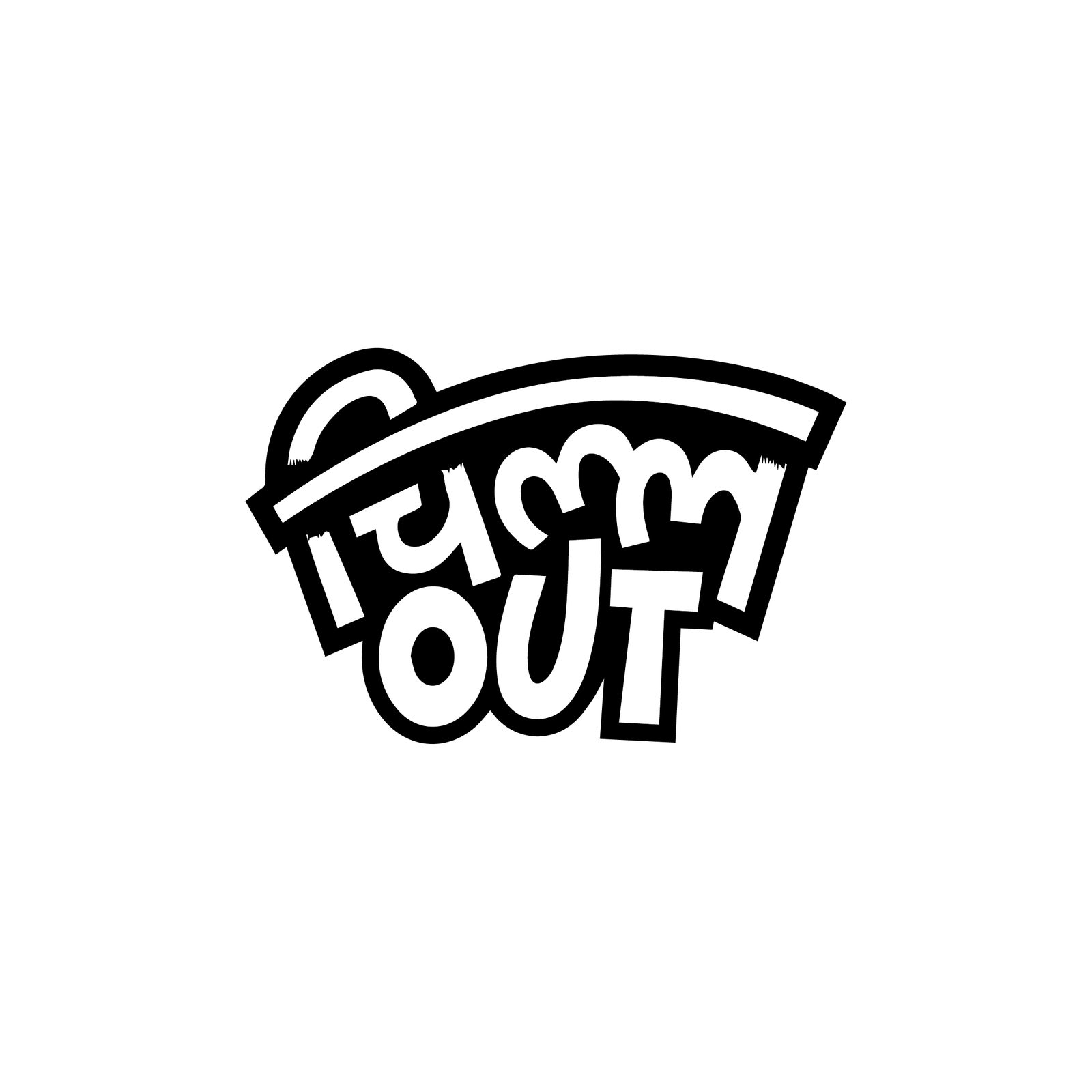 Striking typographic sticker that layers a curved Devanagari word over a large, rounded Latin “OUT.” The design uses thick, hand-lettered strokes and playful negative-space cuts to create a compact, badge-like silhouette.