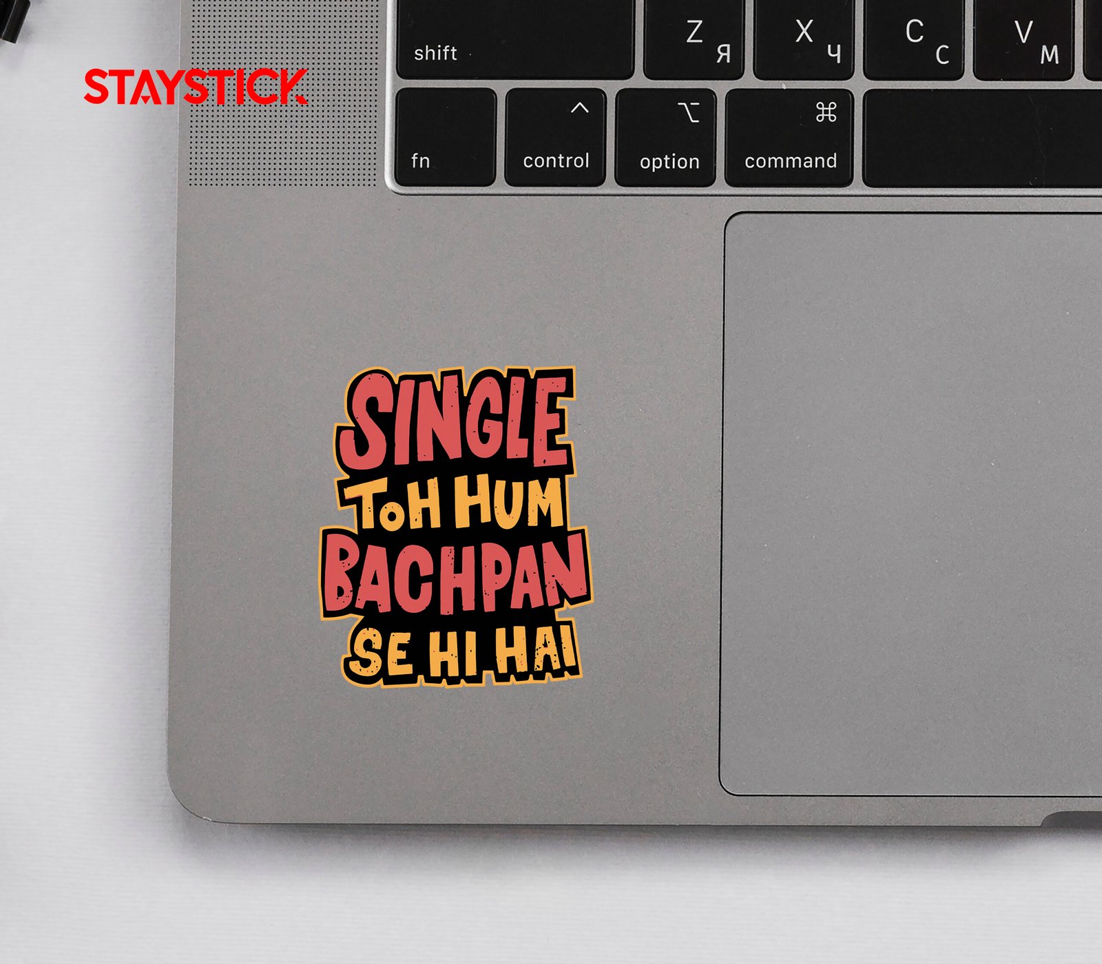 Vertical, hand-drawn sticker that stacks the phrase in chunky, slightly distressed letterforms. Alternate coral-red and mustard-yellow fills sit on a deep charcoal inner shadow and are trimmed with a thin bright-yellow outline, creating a strong die-cut silhouette that pops on dark backgrounds.
