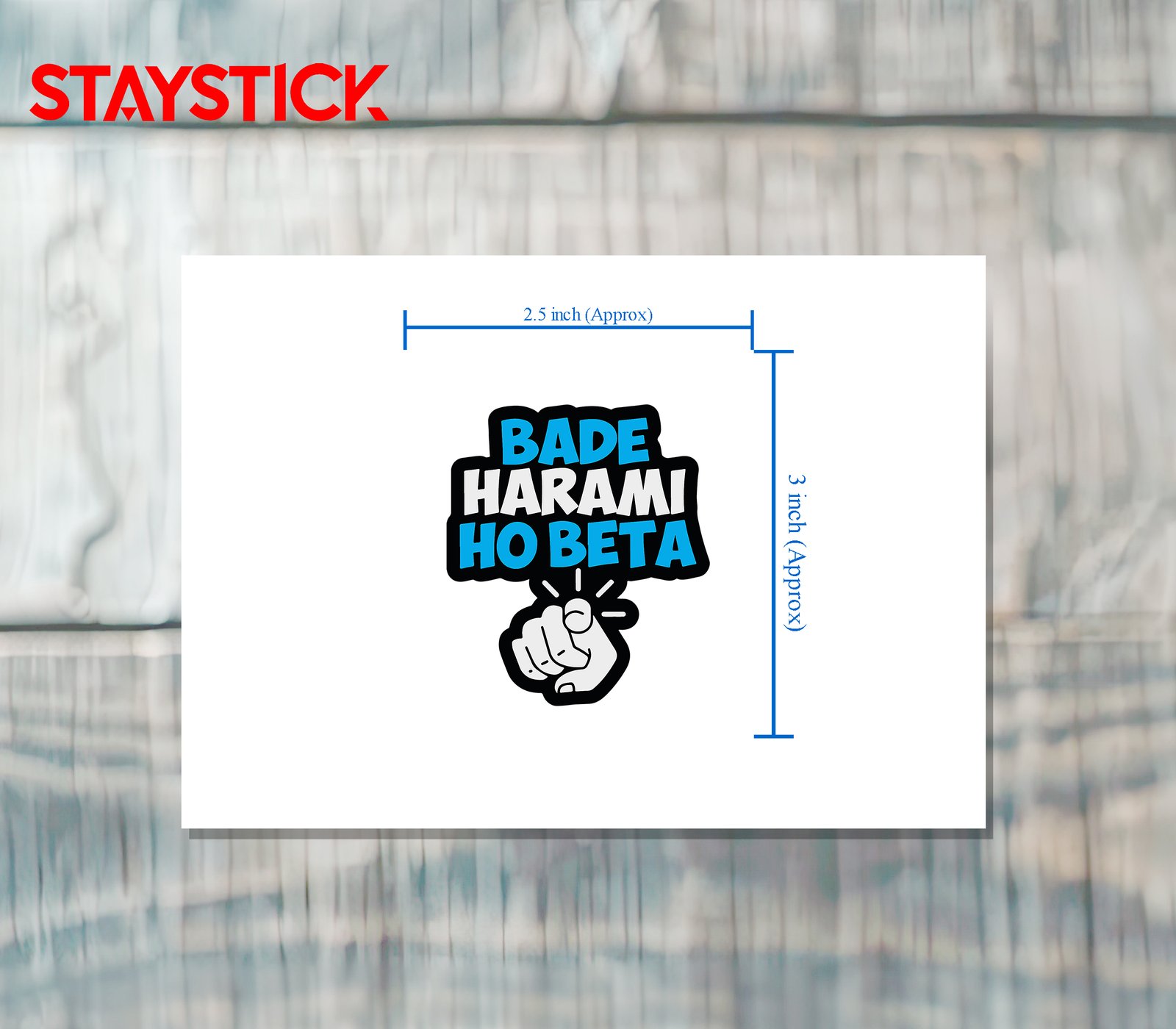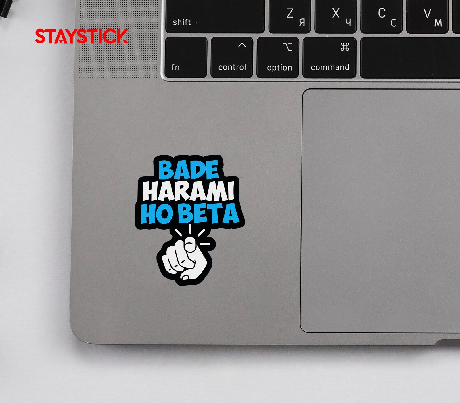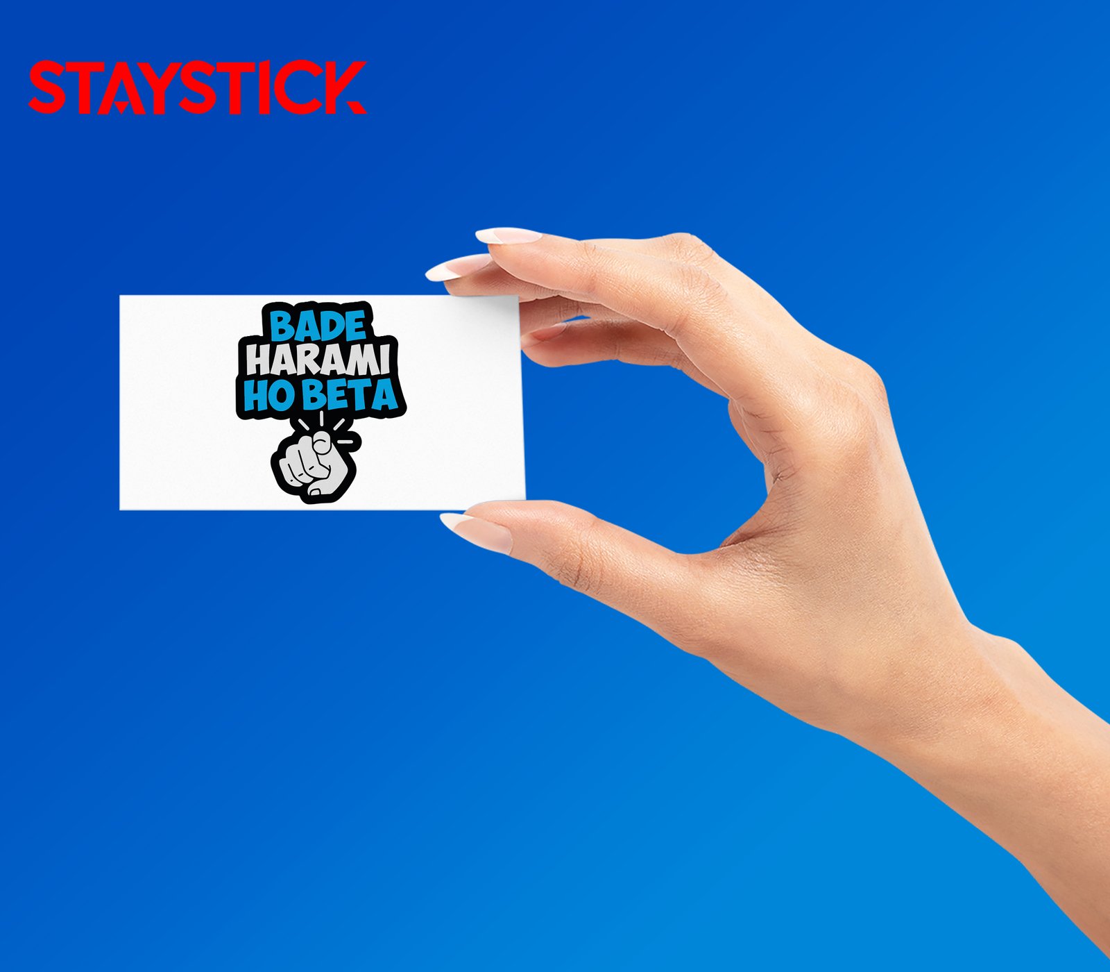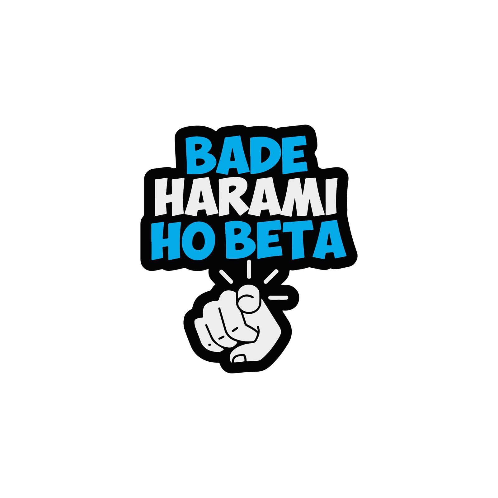 Hand-lettered typographic sticker with chunky, irregular letters in bright cyan and white, framed by a heavy black outline; a cartoon pointing fist beneath adds cheeky, direct address. Readable at small sizes and ideal for vinyl prints.