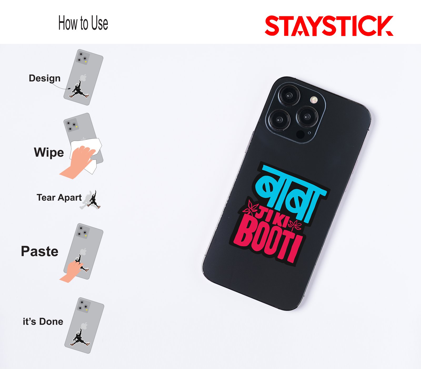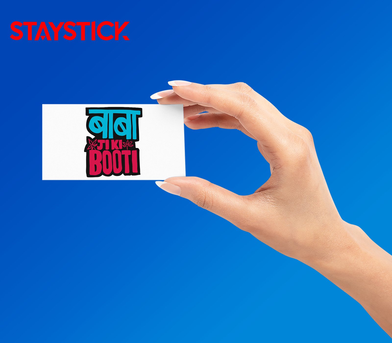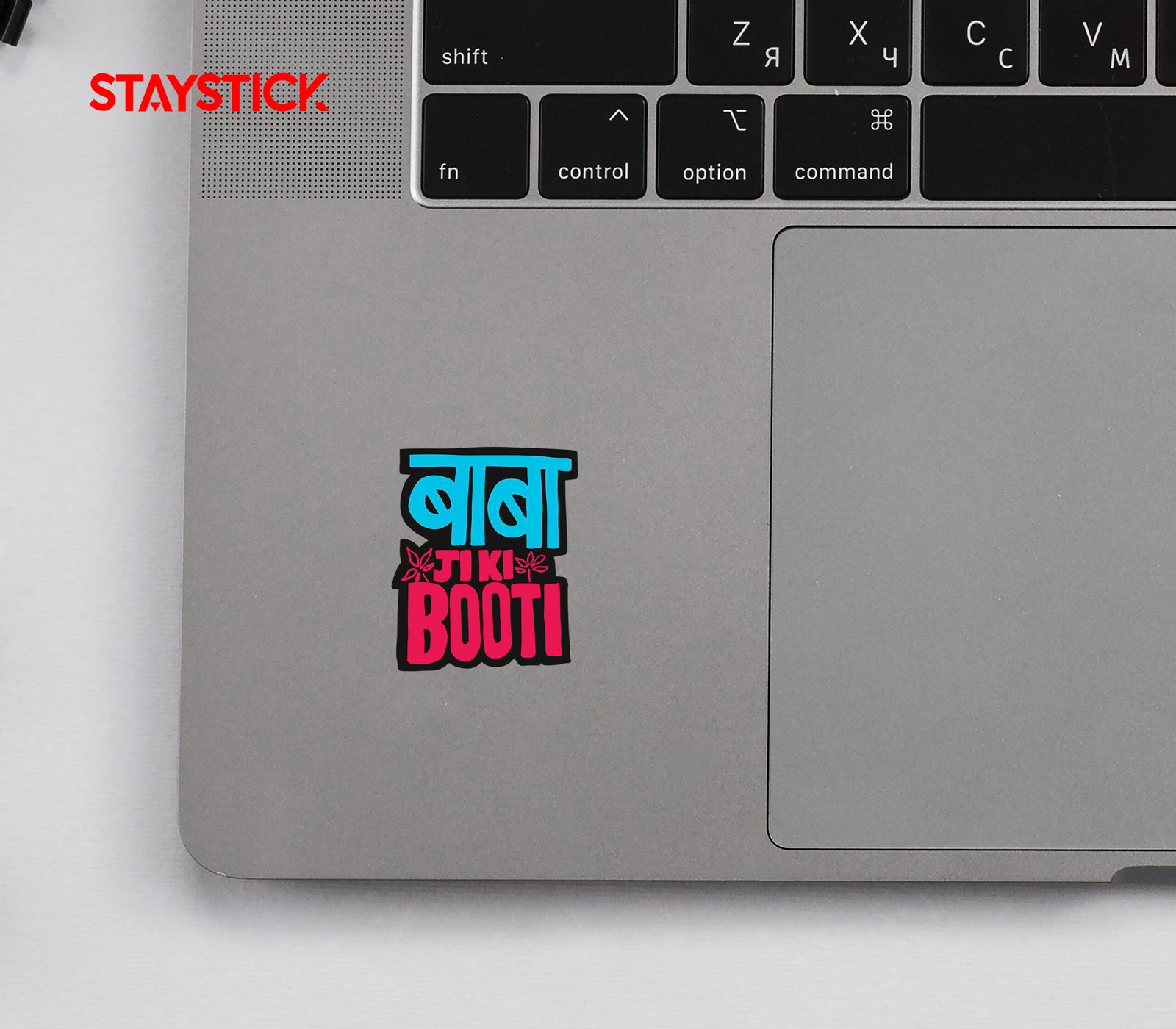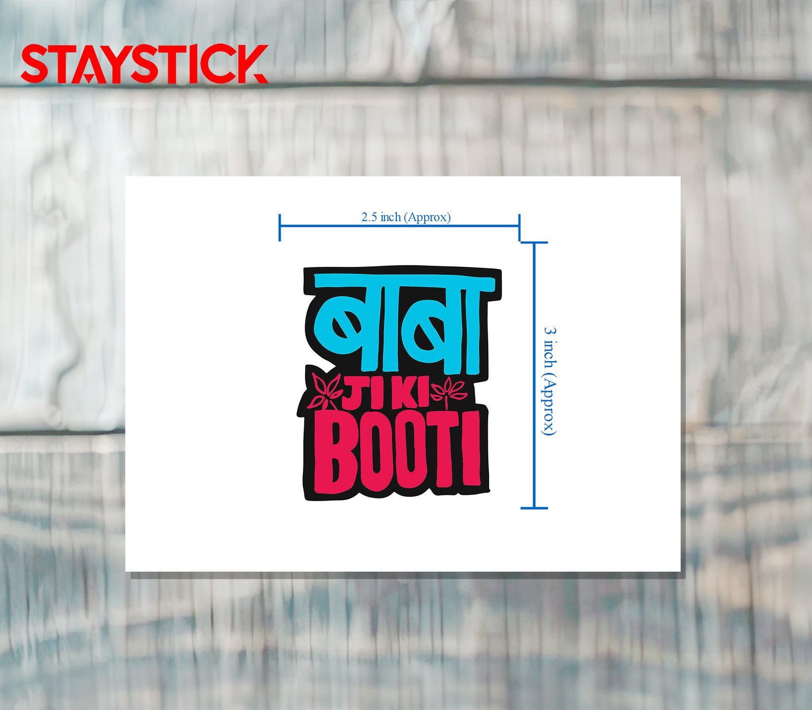 Energetic, hand-drawn sticker combining Devanagari and Roman scripts: chunky cyan “stacked over smaller pink “JI KI” and large pink “BOOTI.” Two simple leaf motifs flank the middle line, adding a herbal/folklore touch. A heavy dark outline creates a strong die-cut silhouette that reads well on dark surfaces.