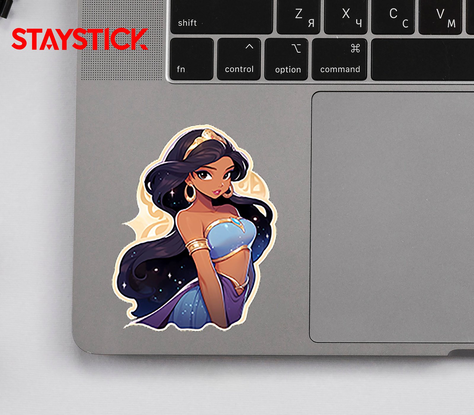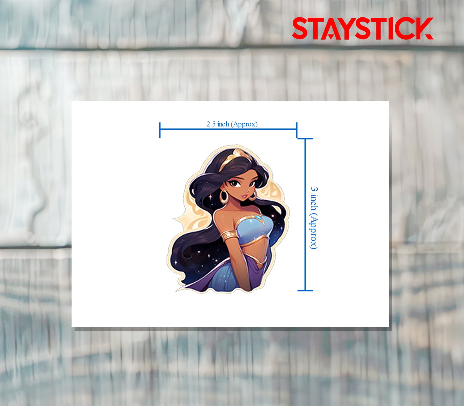 This enchanting sticker features Princess Jasmine in a stunning artistic style that highlights her grace, beauty, and strength. Dressed in her iconic turquoise outfit adorned with golden accents and a radiant gemstone, she stands out as a true symbol of royalty and independence. Her long, flowing hair and golden tiara add a majestic touch, while the soft starry background creates a dreamy and magical atmosphere. Perfect for fans of fairytales and Disney classics, this sticker brings a touch of elegance, fantasy, and inspiration to laptops, notebooks, phone cases, or any surface you want to brighten with a royal sparkle.