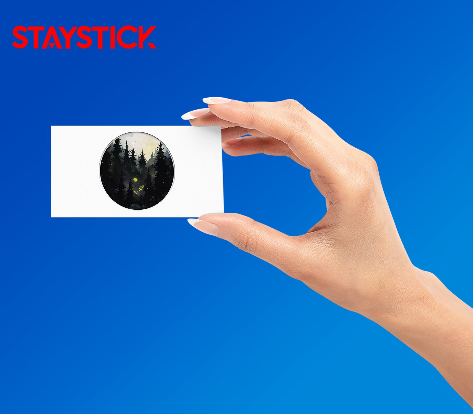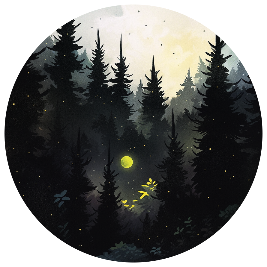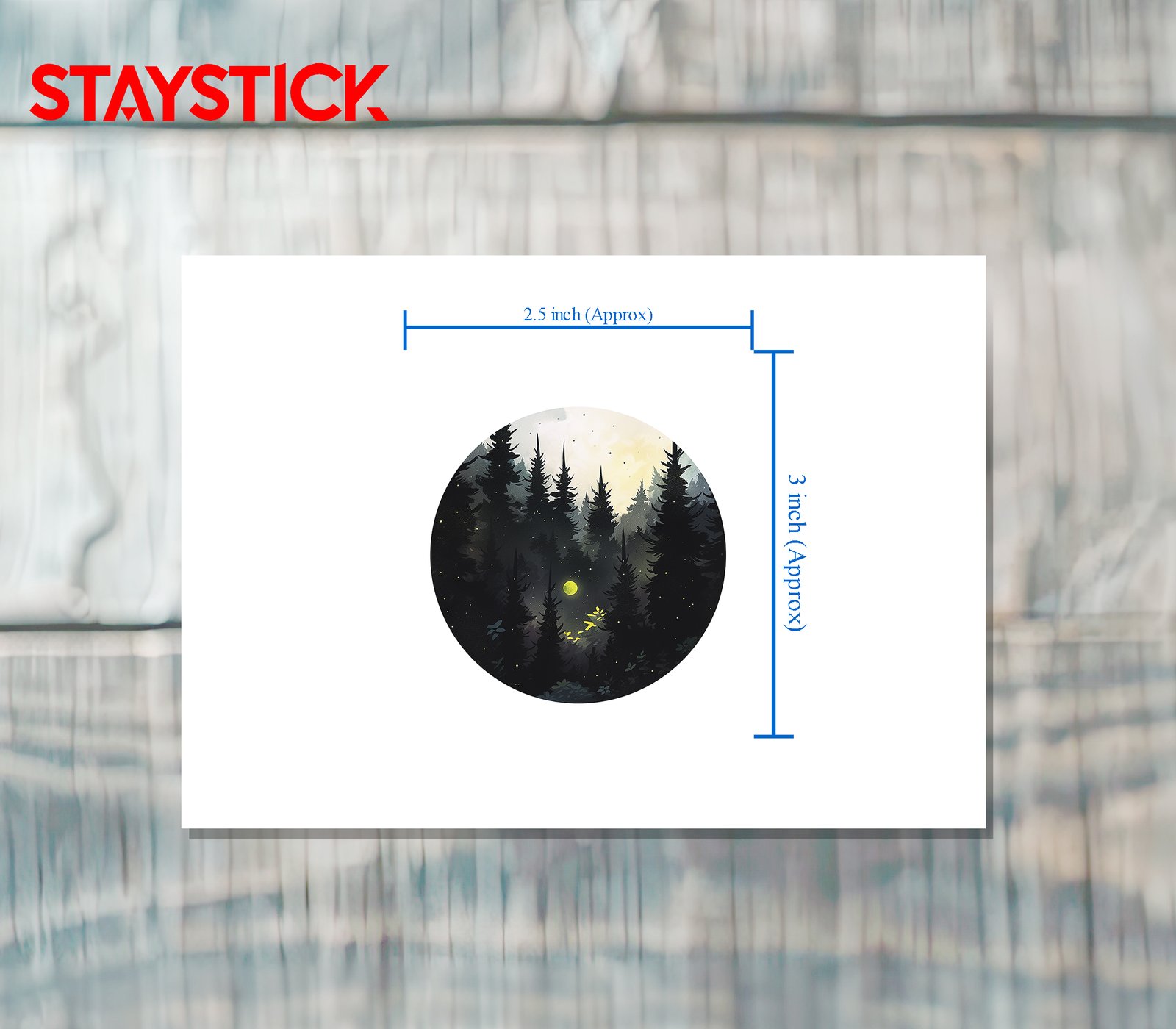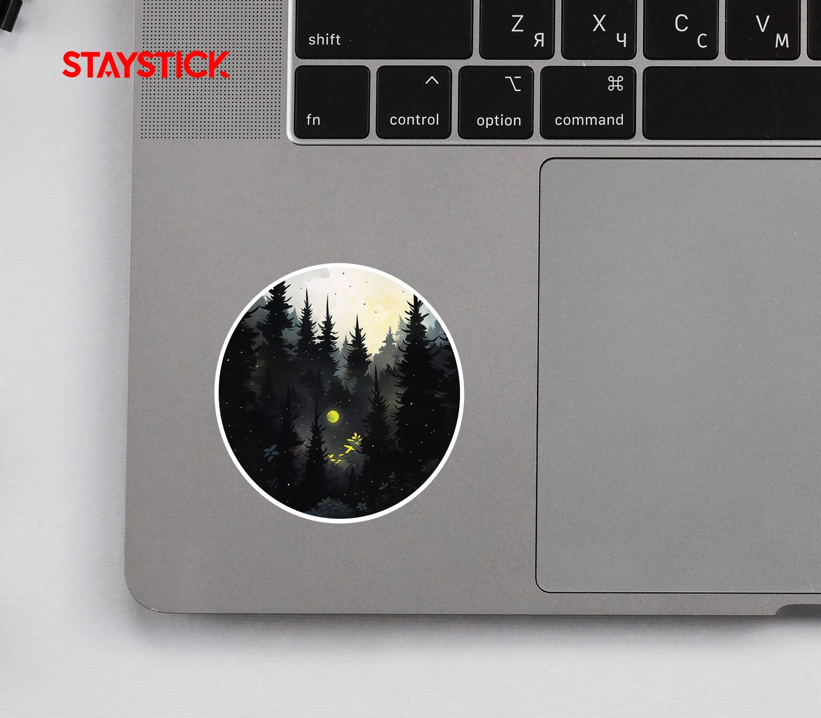 This sticker features a beautifully illustrated circular design of a dark, coniferous forest under a glowing night sky. A soft greenish-yellow moon shines through the tall pine trees, while tiny fireflies scatter like stars, adding a sense of magic and wonder to the scene.