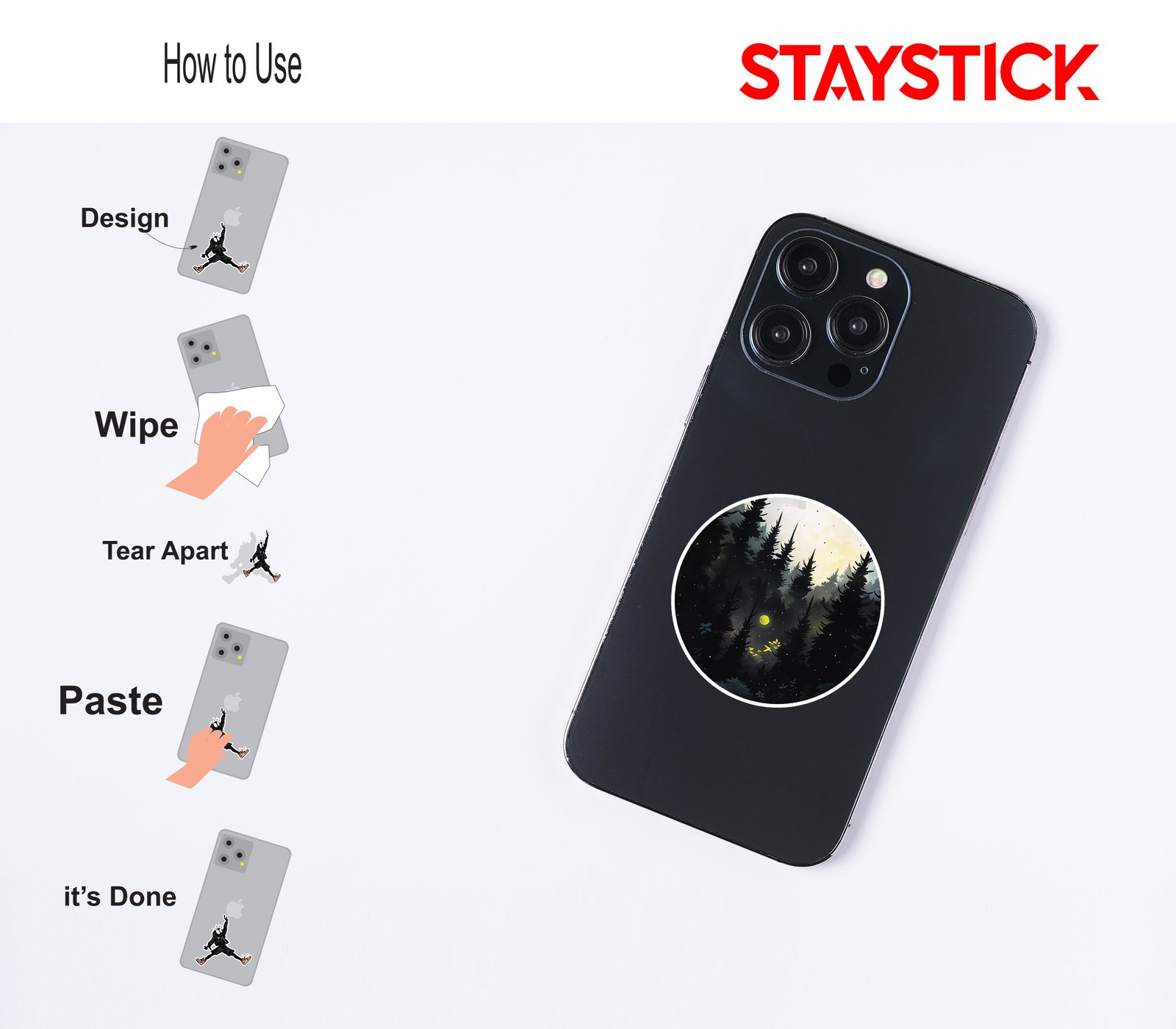 A dreamy, nature-inspired sticker showing the silhouette of dense pine trees bathed in moonlight. The glowing orbs of fireflies illuminate the shadows, creating a tranquil yet mysterious atmosphere that feels both calming and enchanting.