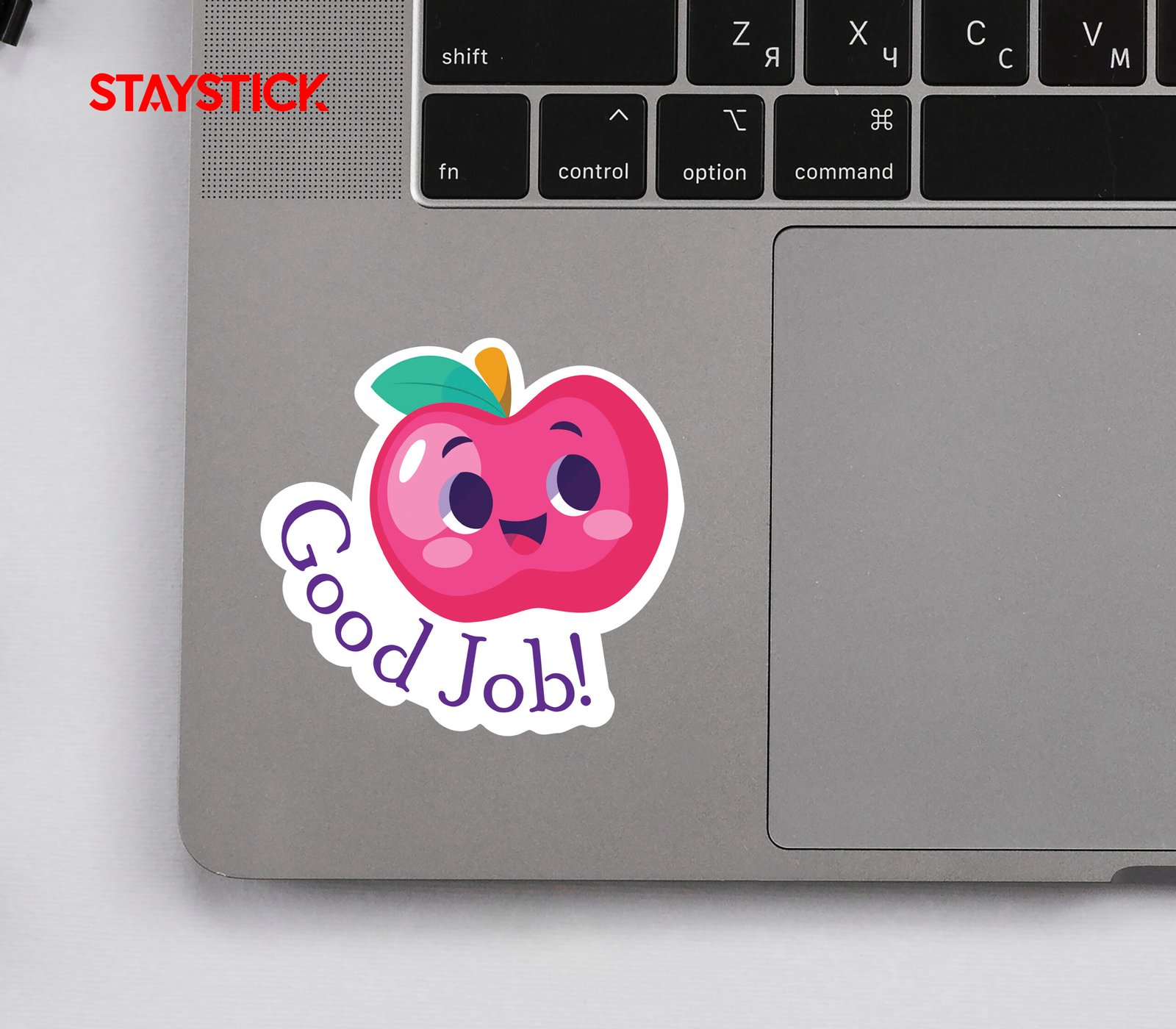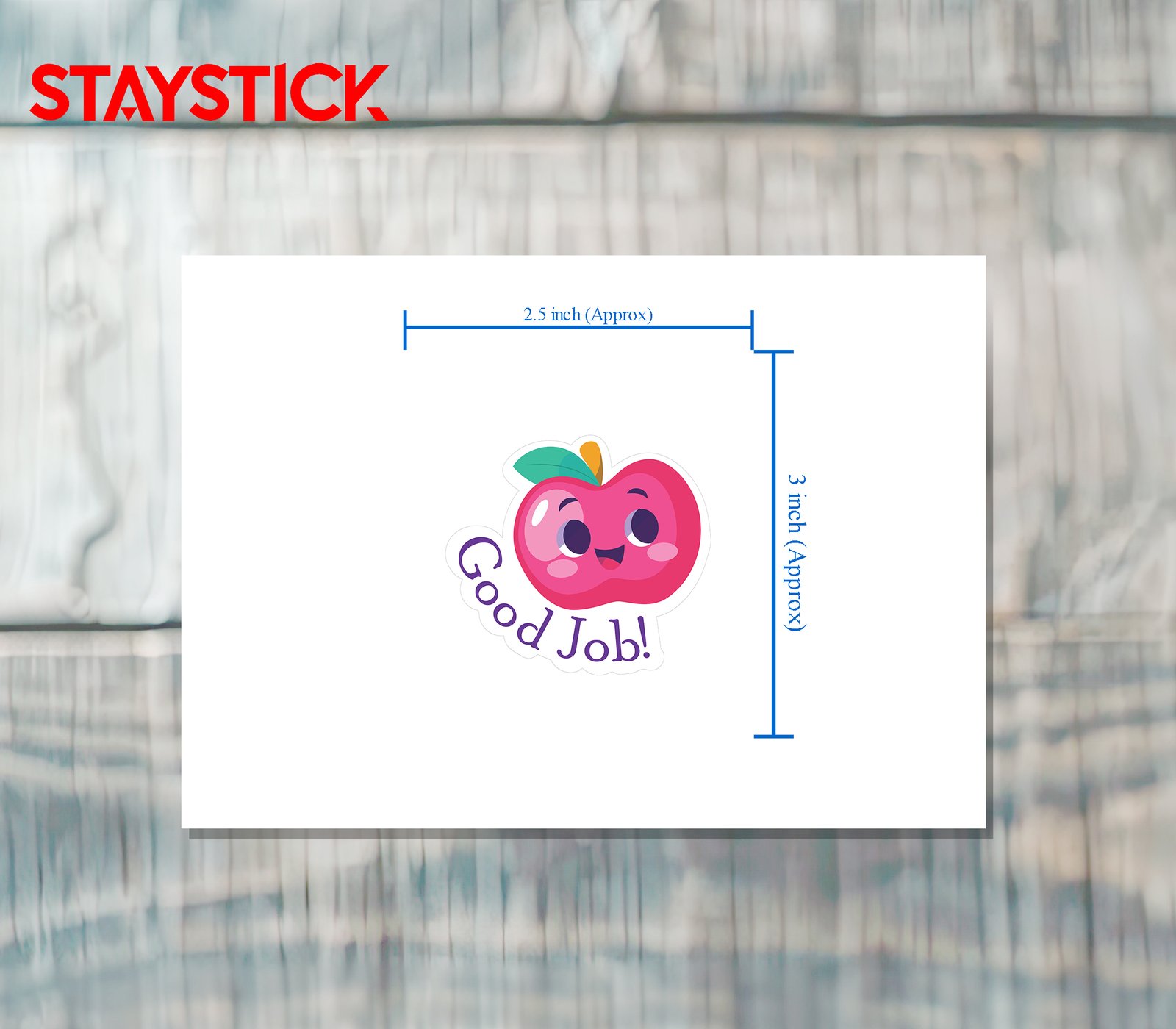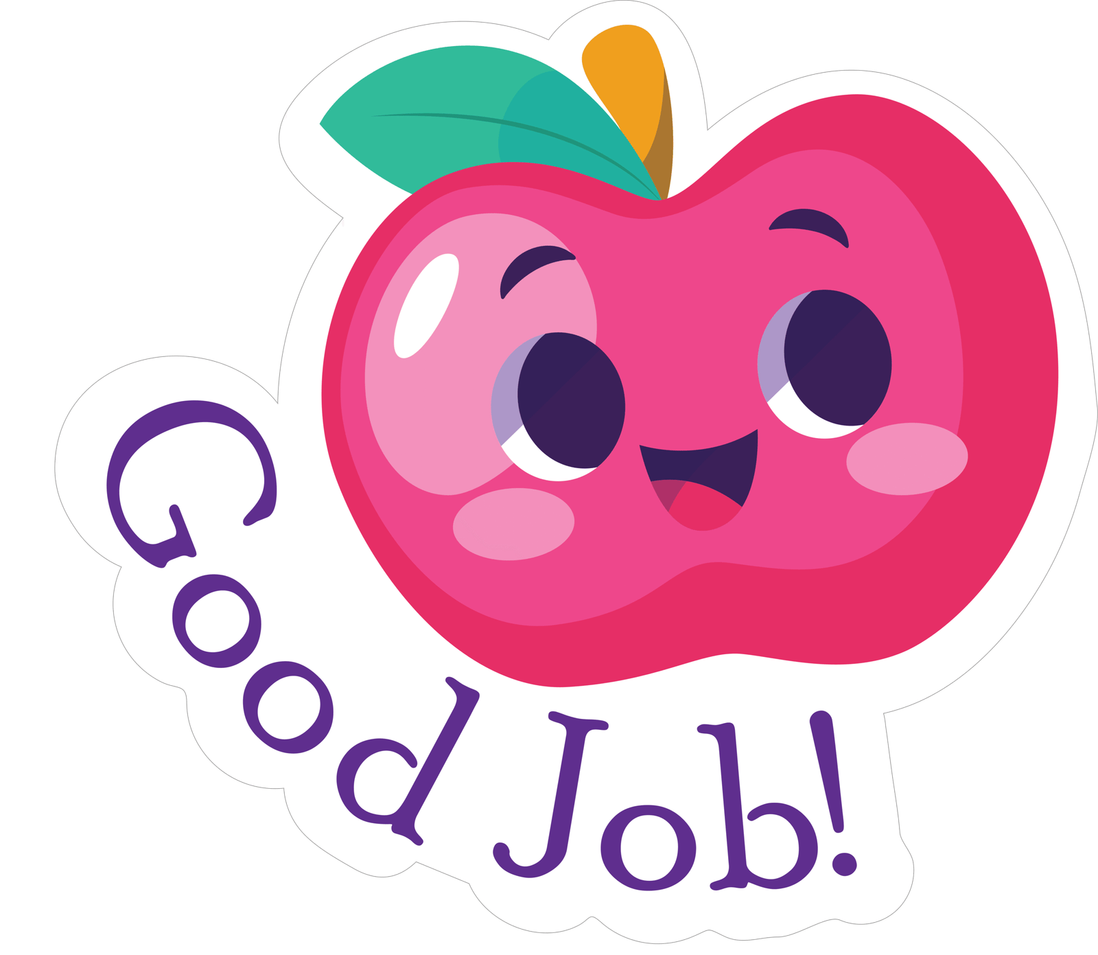 Motivational “Good Job!” sticker featuring a cute apple character. Perfect for students, teachers, and rewards.
