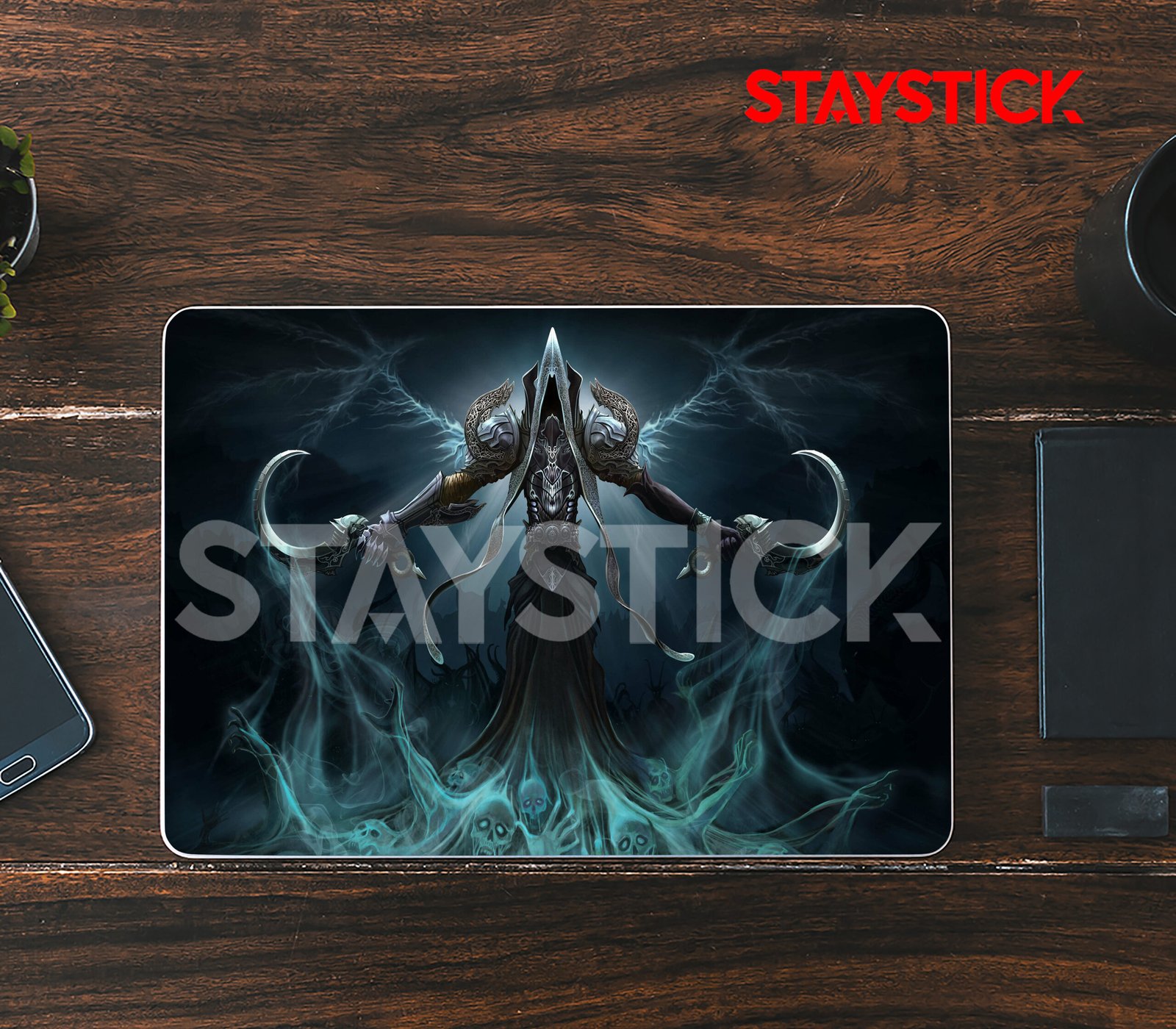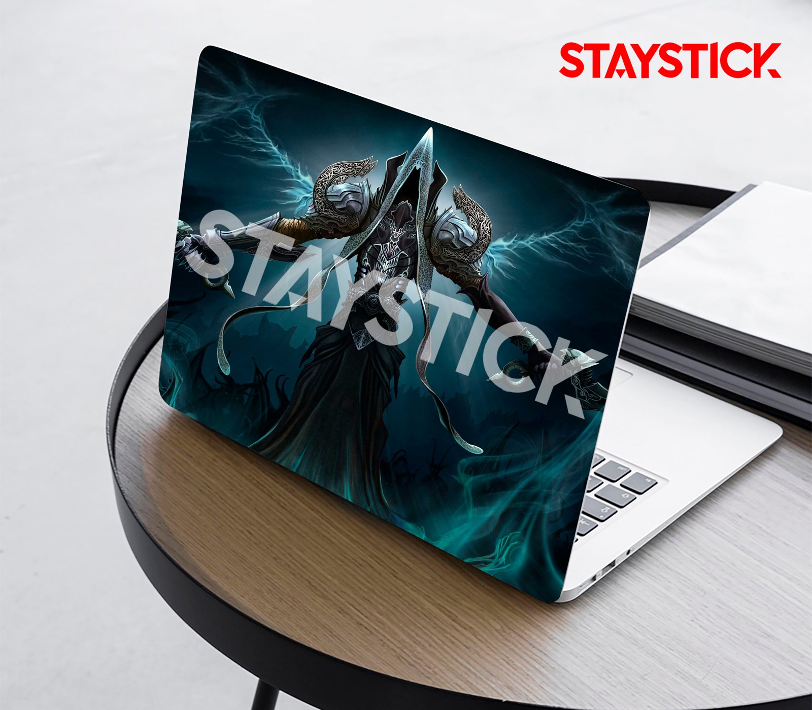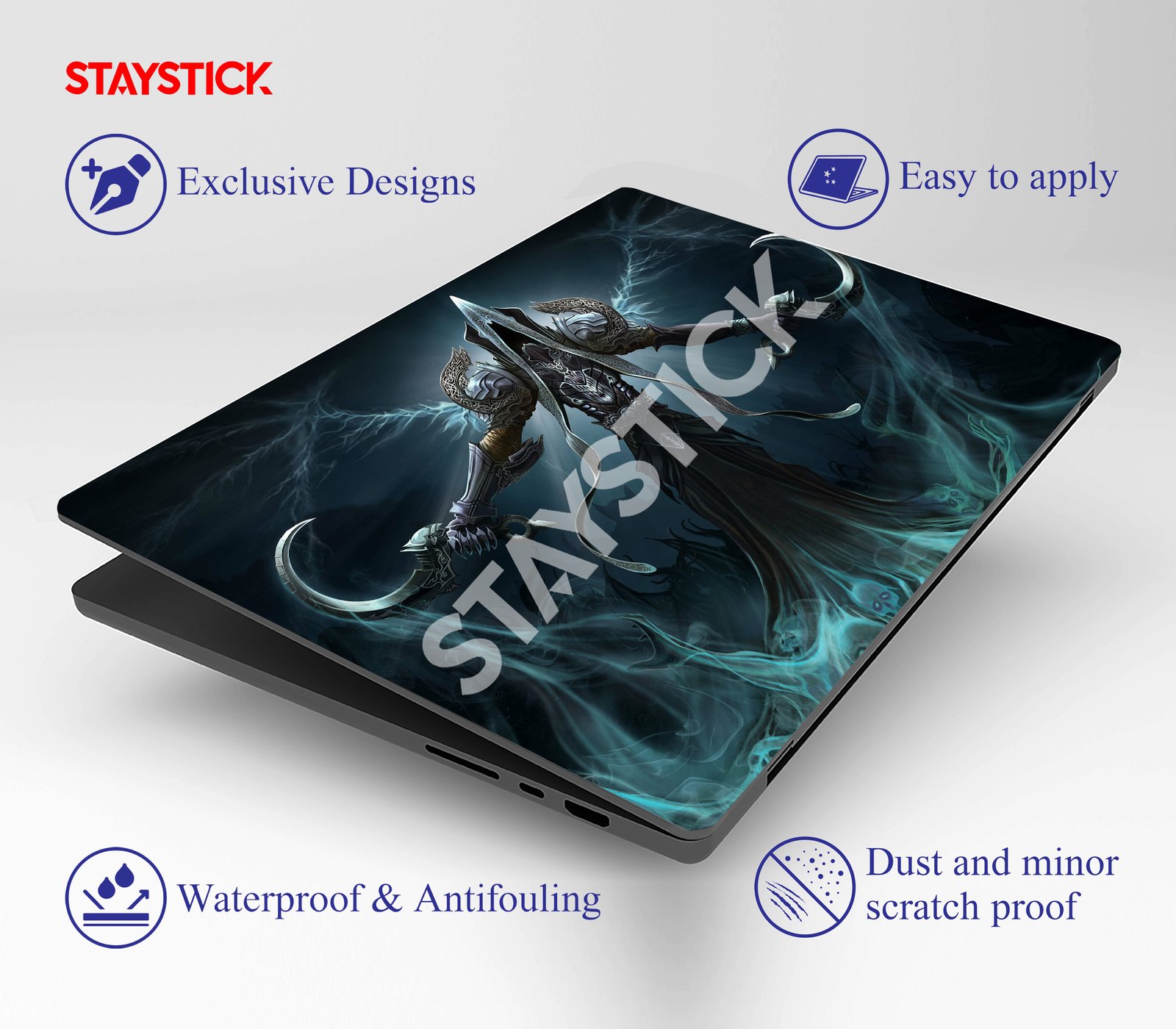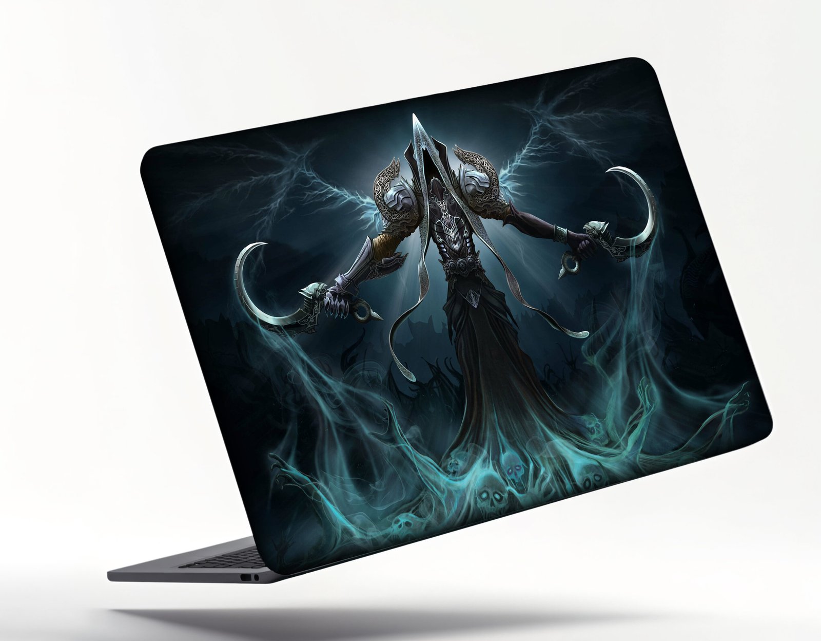 This laptop skin sticker features a dark fantasy warrior design with glowing scythes and ghostly effects, giving your laptop a bold, gothic, and gaming-inspired look while protecting it from scratches and dust.