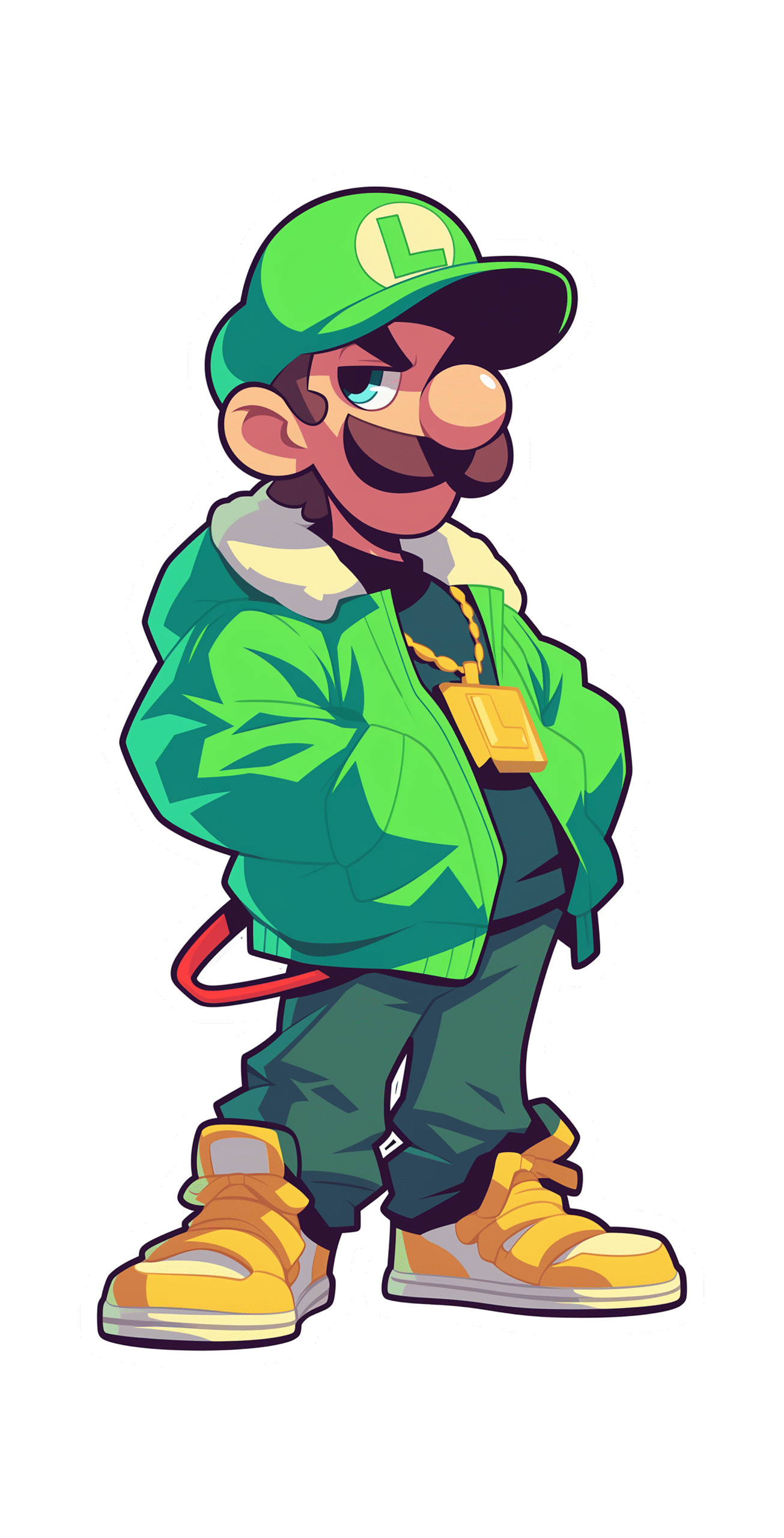 Stylized cartoon of a mustached hero wearing a bright green cap and oversized puffer jacket, hands in pockets, sporting a chunky gold pendant and yellow high-top sneakers. Clean linework, bold shadows, and a white cutline make it pop on laptops, bottles, and planners.