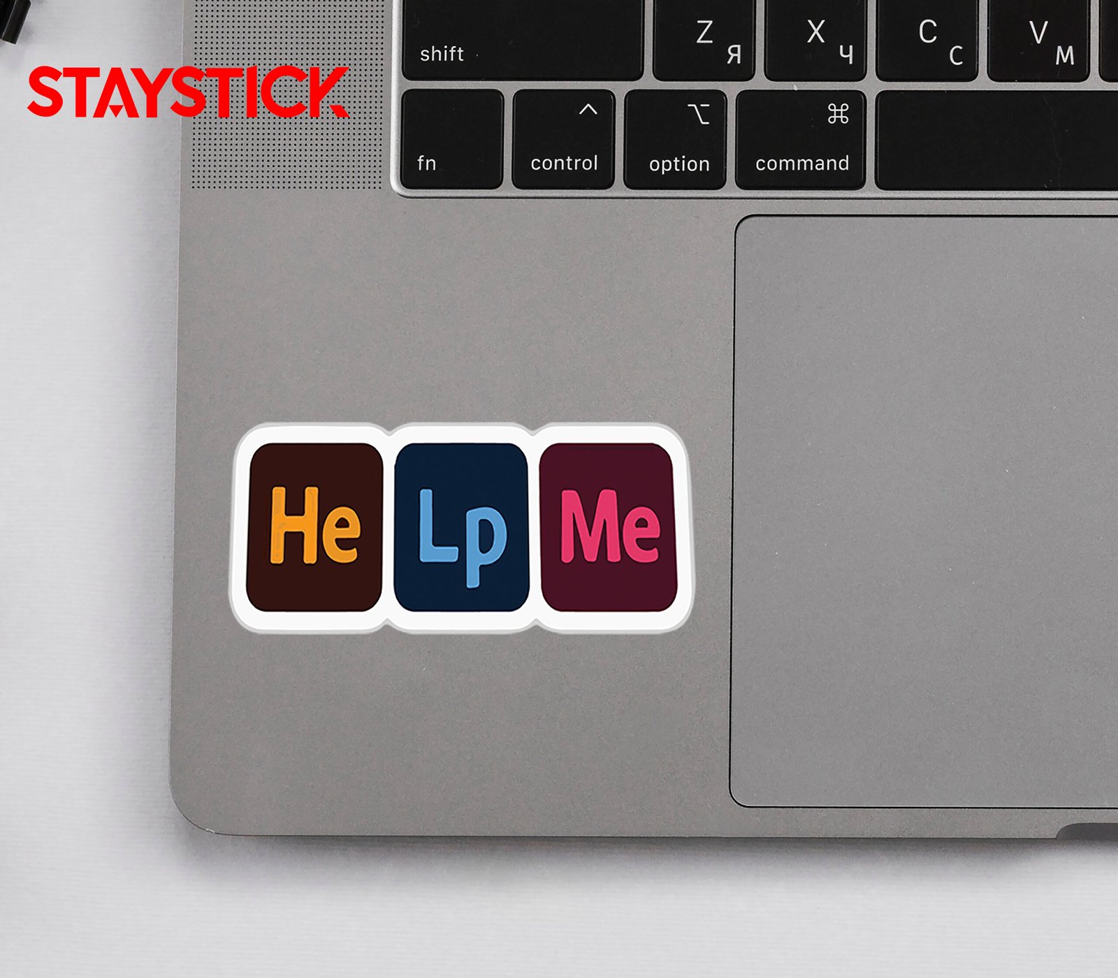 This sticker features the phrase “Help Me” written in colorful block-style letters, each inside a rounded square with different background colors, giving it a playful yet expressive design.