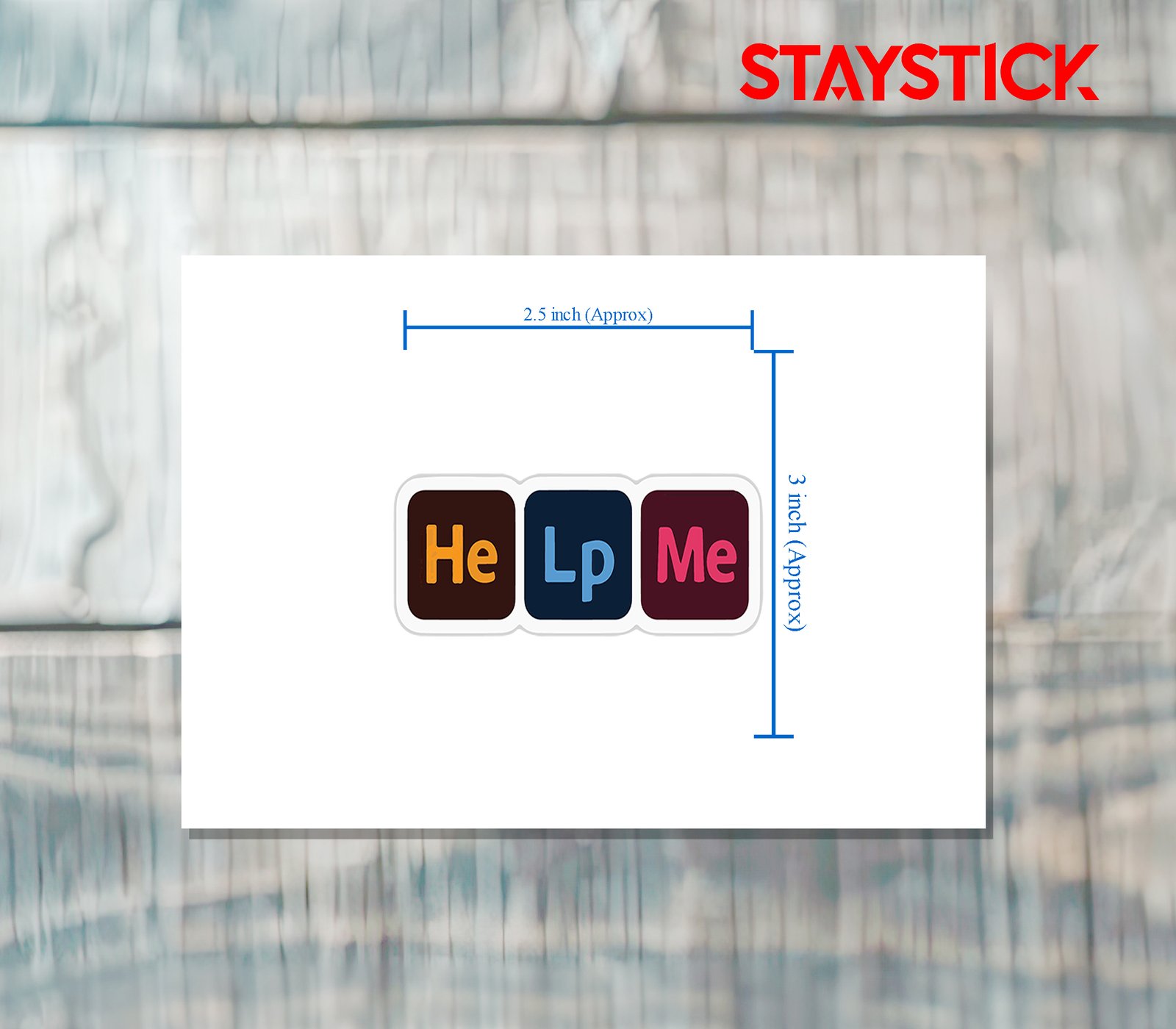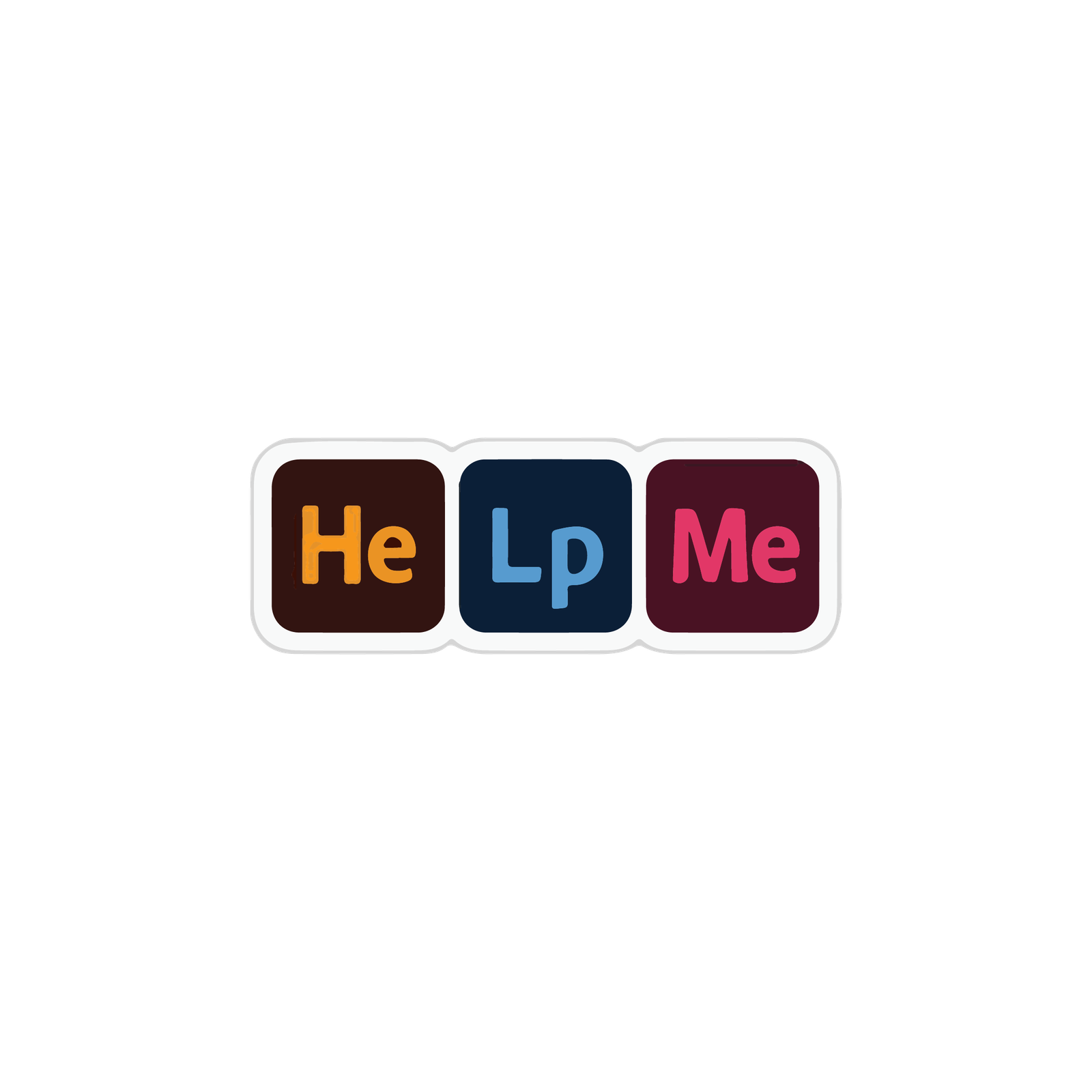 This sticker displays the phrase “Help Me” in a creative and eye-catching block-style design. The words are split into three separate rounded squares, each with its own distinct color scheme that makes the text stand out. The first block has a dark brown background with the letters “He” in bright orange, the second block has a navy-blue background with the letters “Lp” in light blue, and the third block has a maroon background with the letters “Me” in pink. The combination of vibrant colors and bold typography gives the sticker a modern, playful, and slightly retro look. Its simple yet powerful message, “Help Me,” can be interpreted in a humorous, casual, or even meaningful way depending on the context in which it’s used, making it versatile for decoration on laptops, notebooks, water bottles, or other personal items. The white outline around the blocks enhances the visibility of the design, ensuring it stands out against any surface.