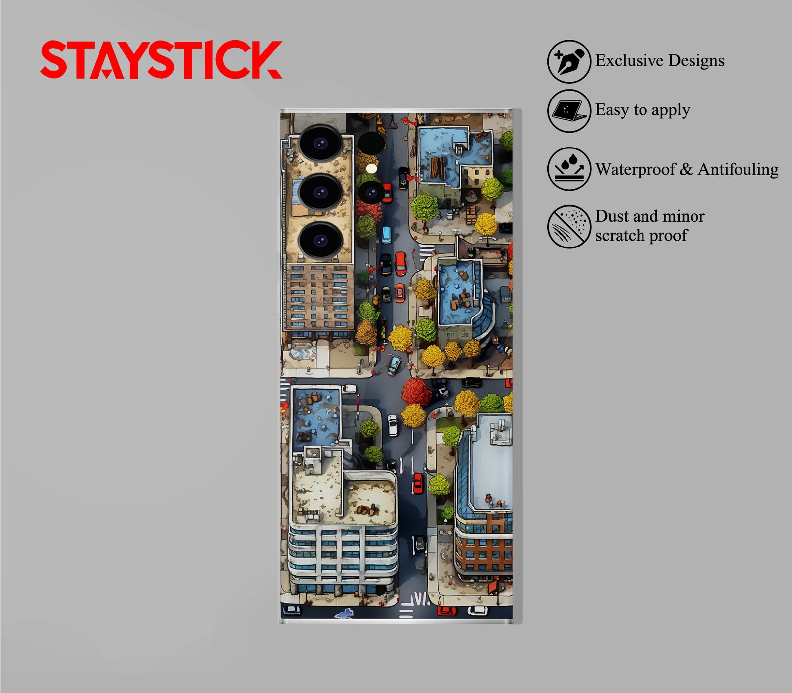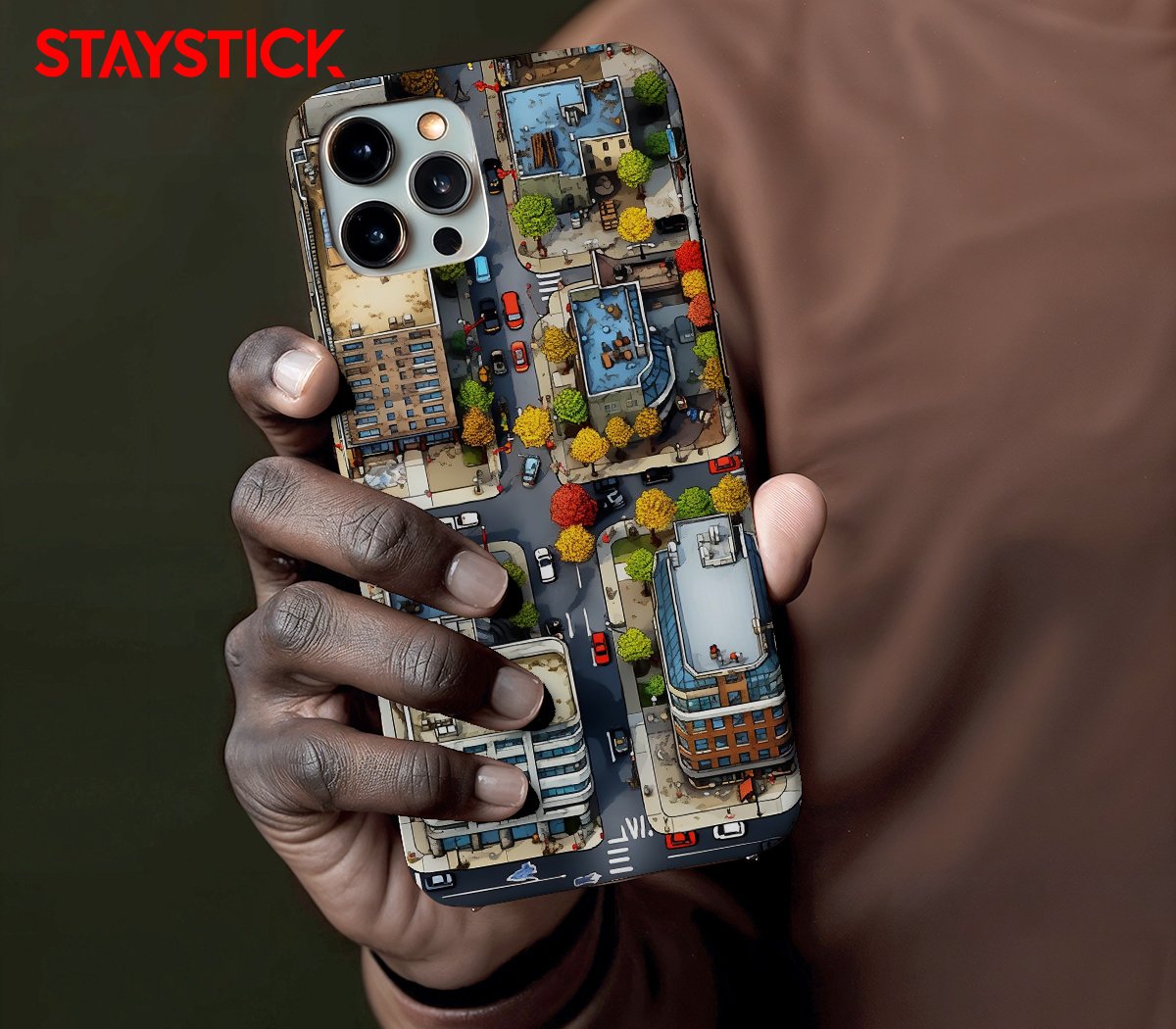 A richly illustrated mobile sticker showing a bird’s-eye view of a city grid in autumn. Details include rooftop debris, delivery crates, parked and moving cars, crosswalks, and trees in yellow, orange, and red—rendered with warm outlines and playful, hand-drawn shading that reads clearly at small sizes.