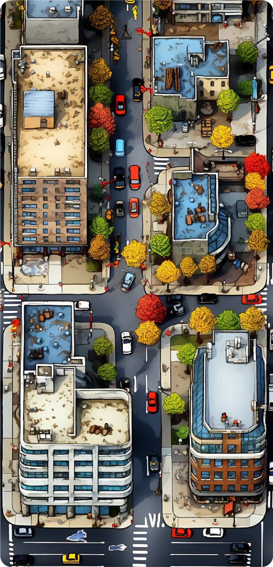 This piece balances map-like clarity and charming clutter: each corner hides miniature scenes (sidewalk activity, street lamps, parked bikes) while the saturated tree colors create seasonal contrast against cool rooftops and asphalt. Ideal for phone wallpapers, game UI backgrounds, or stickers that need high visual interest when viewed up close.