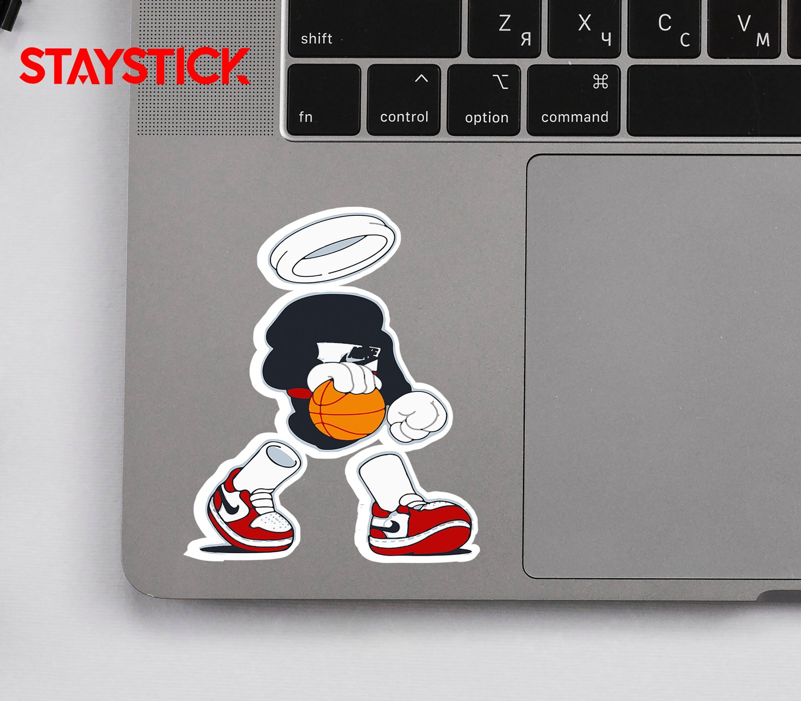 This sticker features a unique and eye-catching cartoon character designed with a playful, streetwear-inspired style. The figure has no visible head or face, but instead sports a floating halo above, giving it a fun and mysterious personality. Dressed in a black outfit, the character confidently grips an orange basketball, showcasing its sporty energy. The bold red-and-white sneakers with black swooshes add a fashionable touch, blending basketball culture with sneakerhead style. Perfect for decorating laptops, water bottles, skateboards, or notebooks, this sticker gives off a cool urban vibe while combining elements of sports, fashion, and creativity.