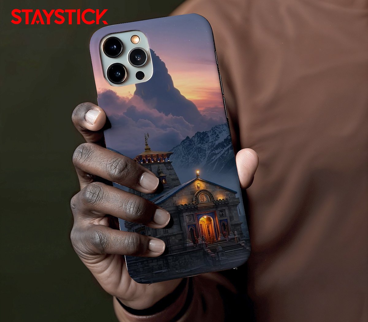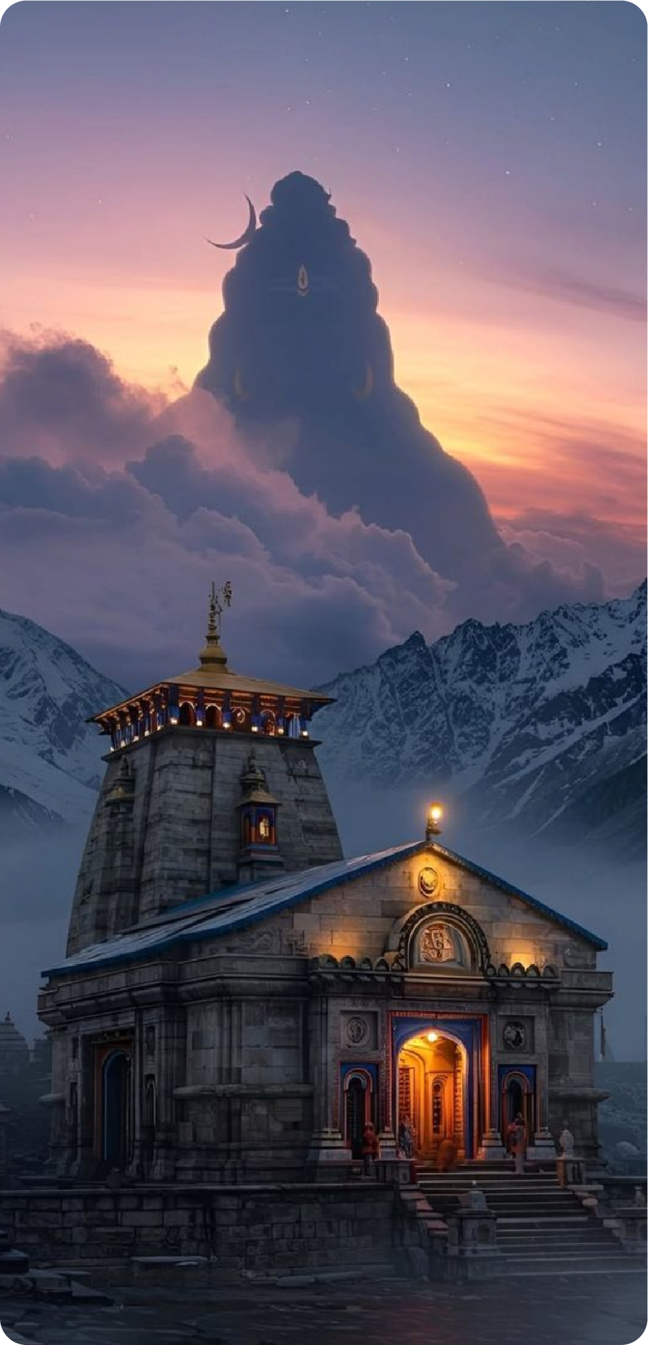 Cinematic devotional vista: detailed temple architecture illuminated at twilight, soft fog in the valley, and a towering cloud-monolith with subtle symbols—evoking awe, pilgrimage, and celestial guardianship.