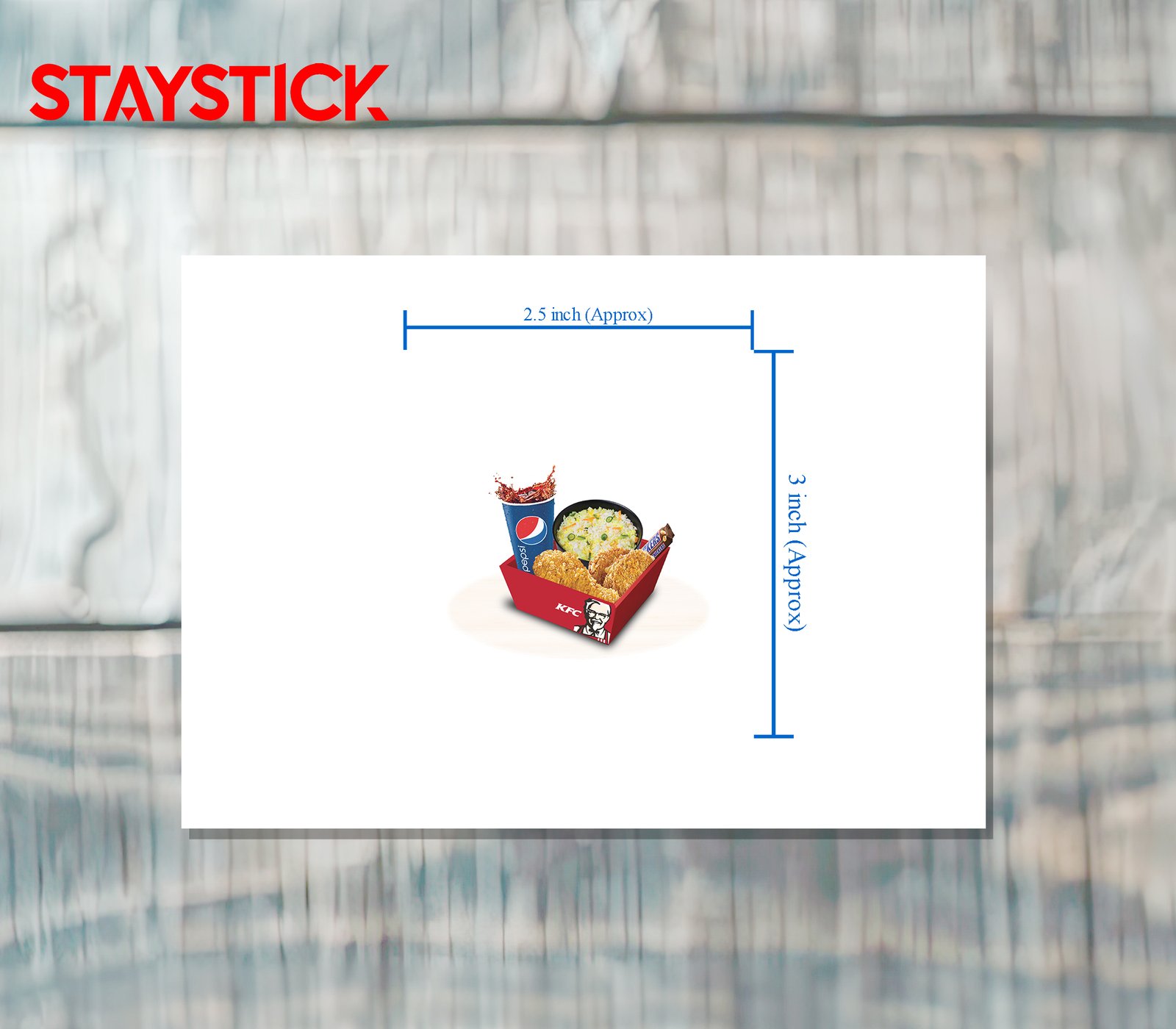 This vibrant sticker showcases a complete KFC meal, including crispy fried chicken pieces in a red KFC container, a serving of rice, a refreshing Pepsi drink with a splash, and a tasty Snickers bar. Perfect for decorating your laptop, notebook, or water bottle, this durable and eye-catching sticker is ideal for foodies and KFC enthusiasts alike. Show off your love for fast food with this high-quality vinyl sticker!