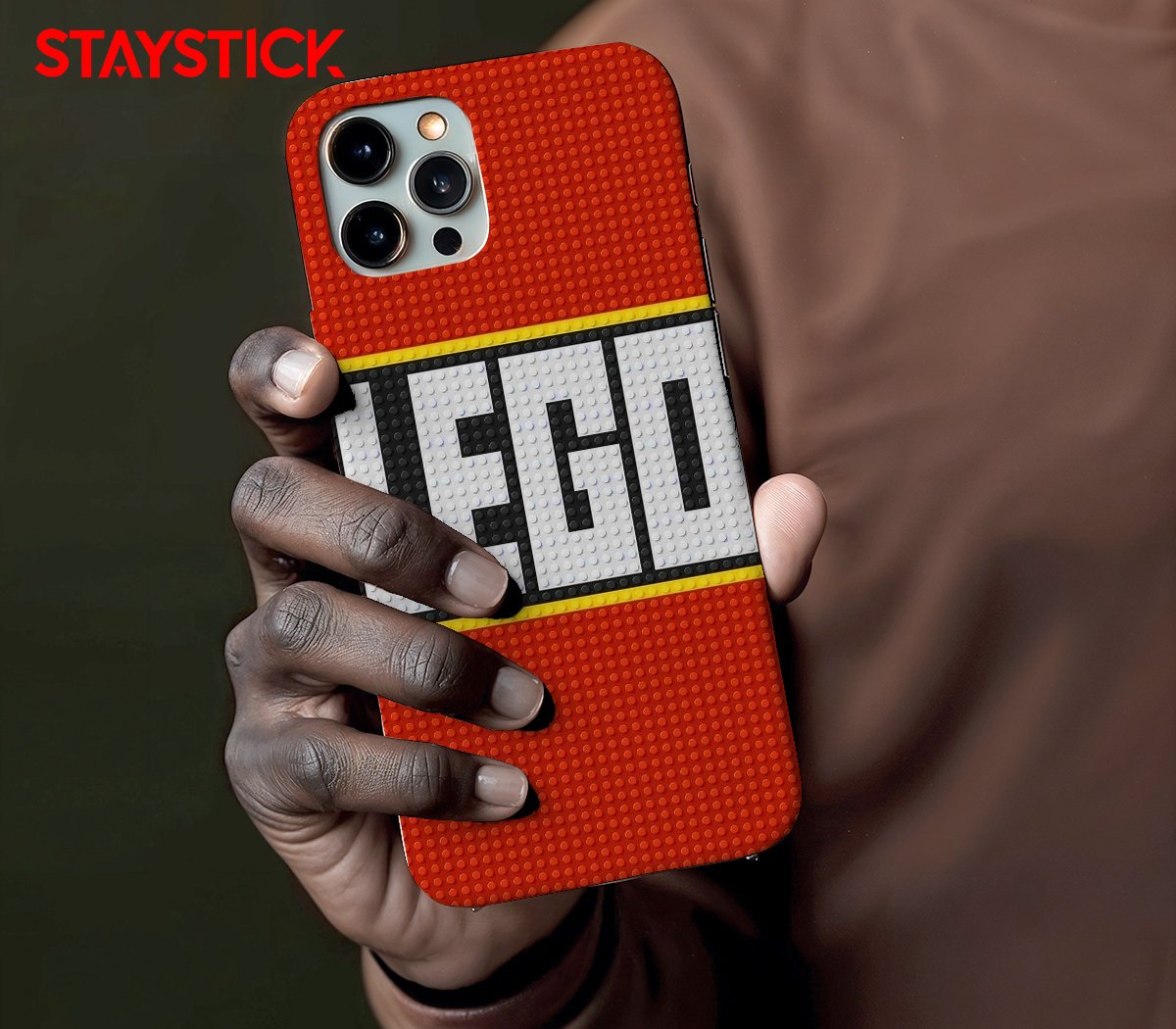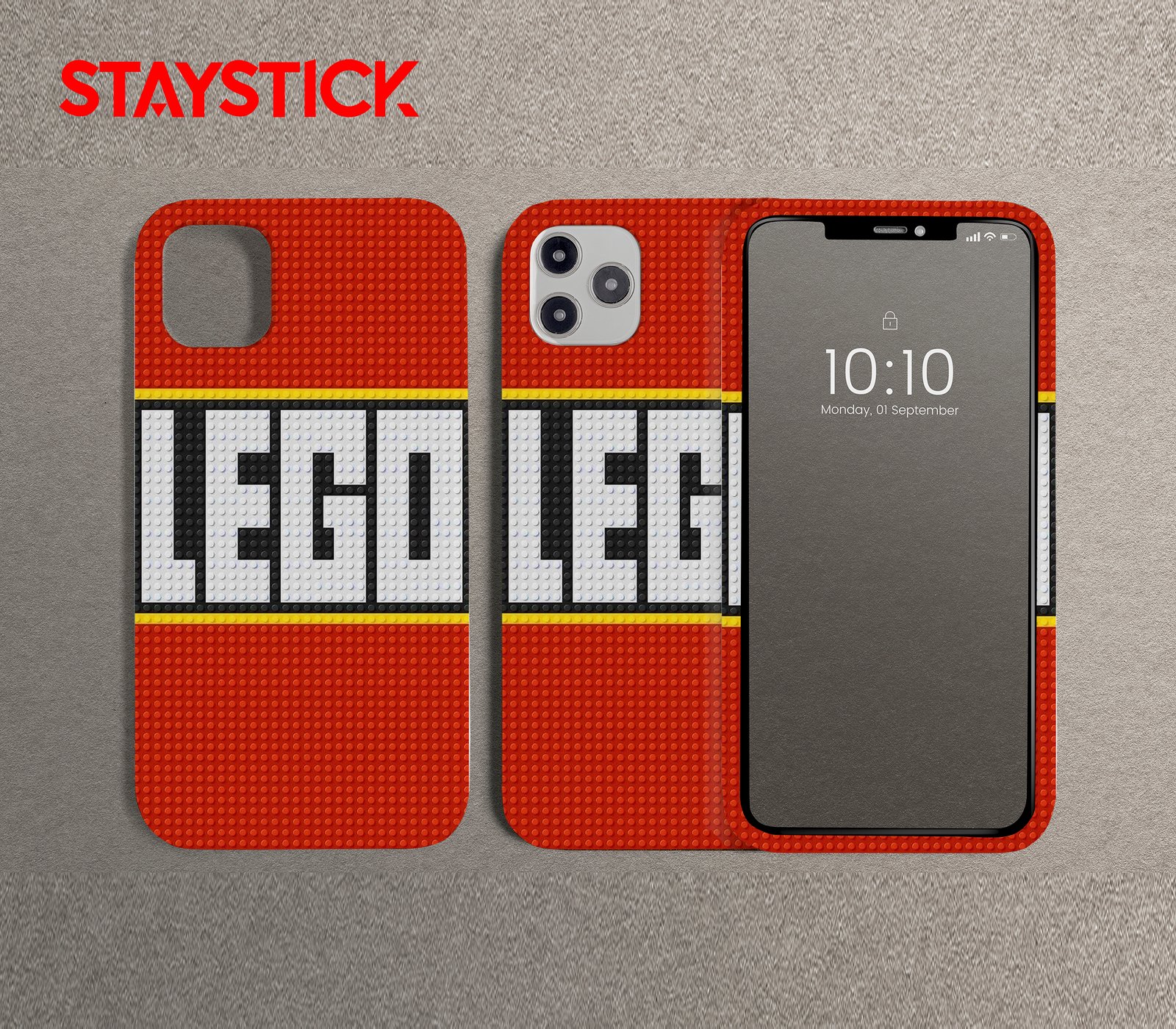 The composition emphasizes texture and tangibility—the raised stud pattern casts subtle highlights and shadows while the strict color blocks (red, white, yellow, black) keep the design bold and highly legible at phone scale. Ideal for playful wallpapers, kid‑friendly app art, or retro toy‑themed stickers.