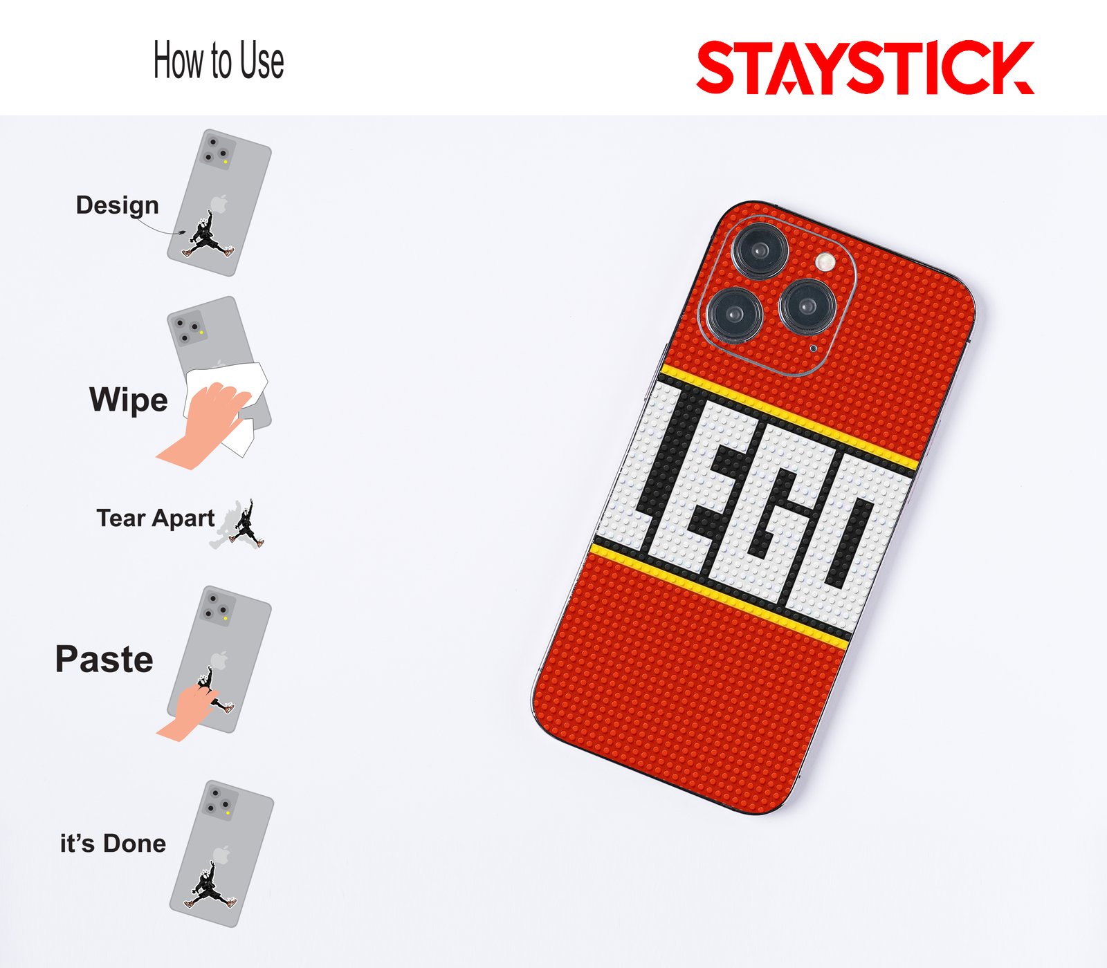 A vertical mobile sticker that mimics a studded construction‑brick base: a vivid red field top and bottom frames a central white panel edged in yellow and black. The white panel is built from circular studs and forms chunky, black‑outlined letters, giving a handcrafted, pixel‑like logo feel with strong contrast and retro toy charm.