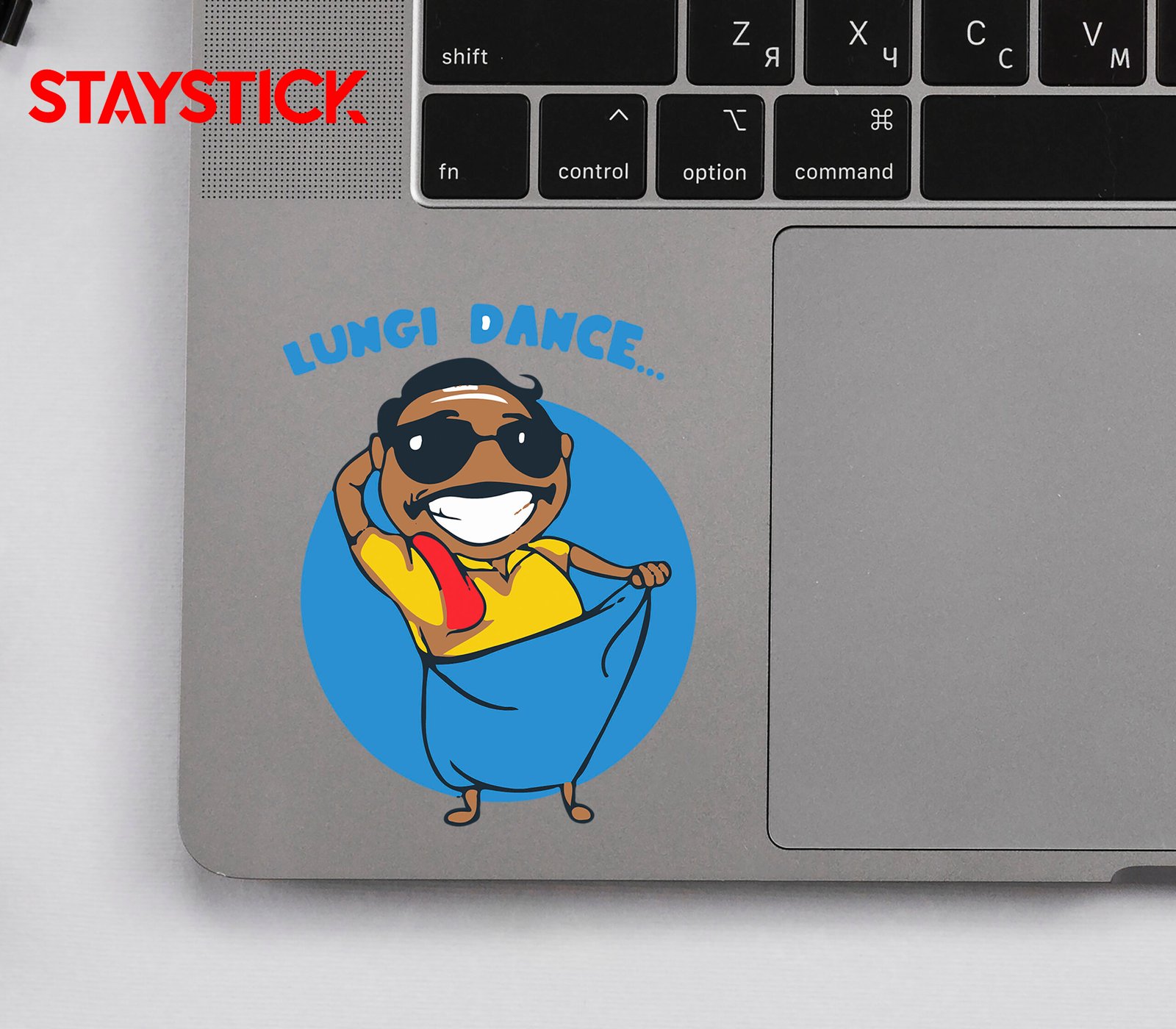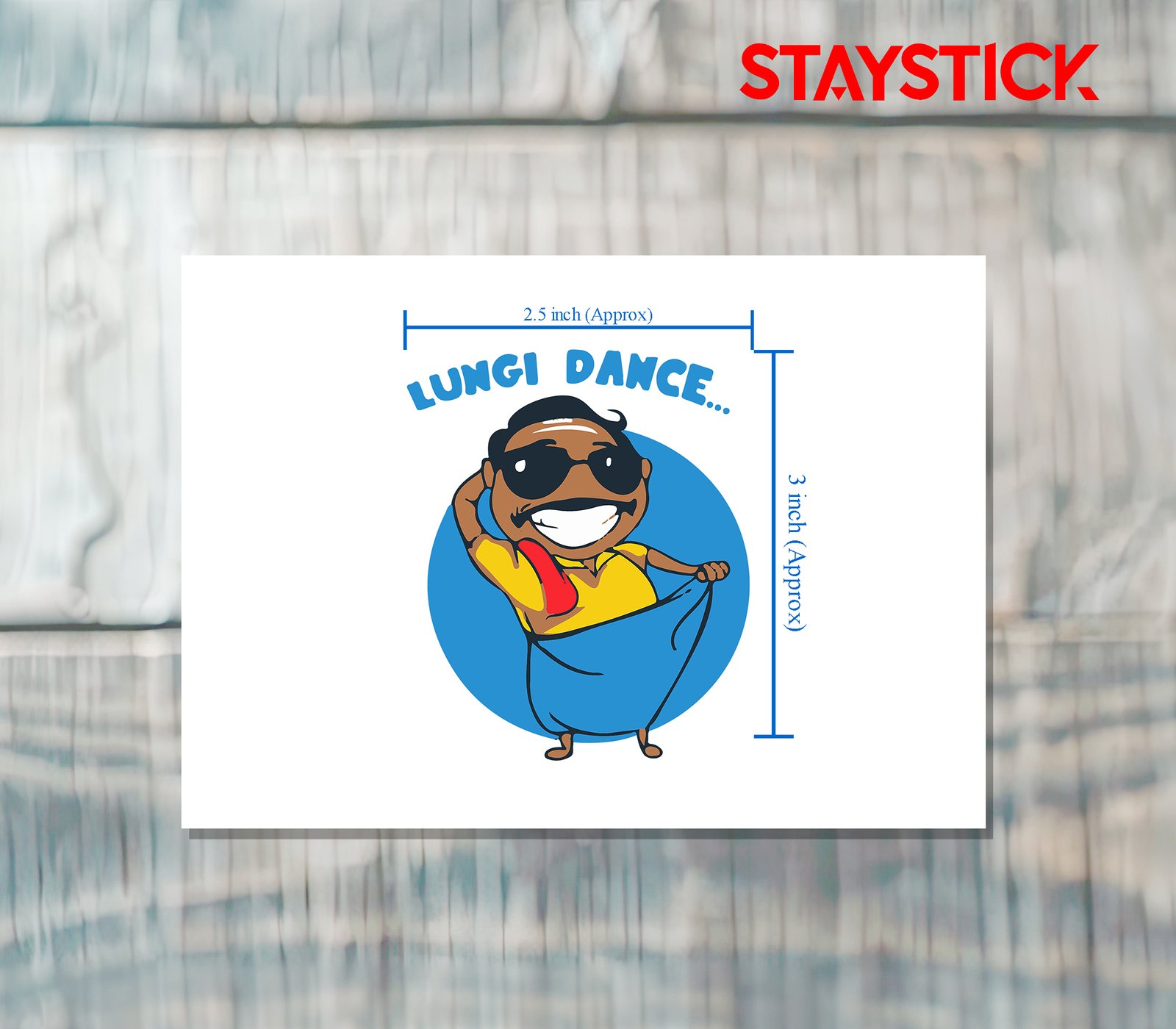 This sticker is a humorous and energetic cartoon representation inspired by South Indian culture and the popular “Lungi Dance” vibe. At the center of the image is a cheerful, dark-skinned man with an exaggerated wide smile that instantly conveys joy and fun. He is wearing a bright yellow shirt, complemented by a red towel slung over his shoulder — a classic accessory often associated with casual, everyday South Indian attire.