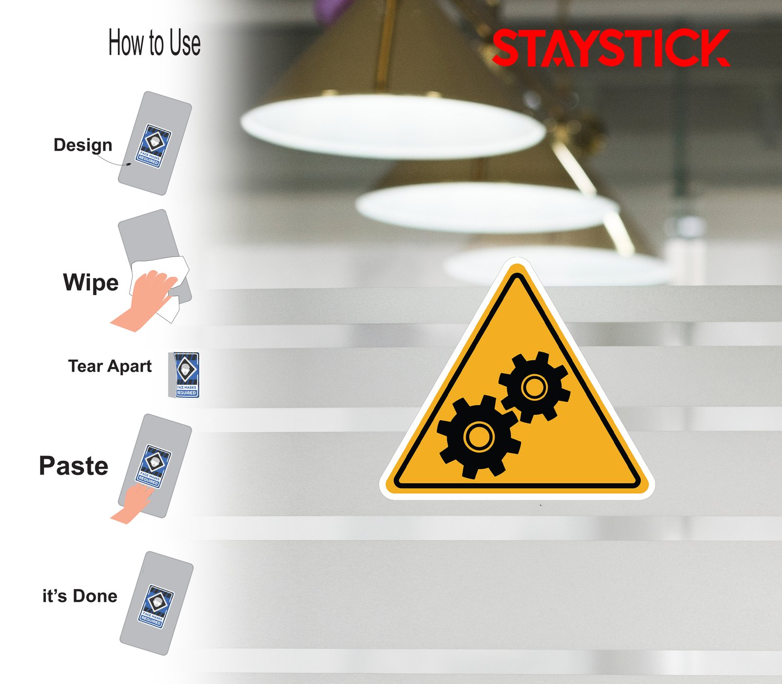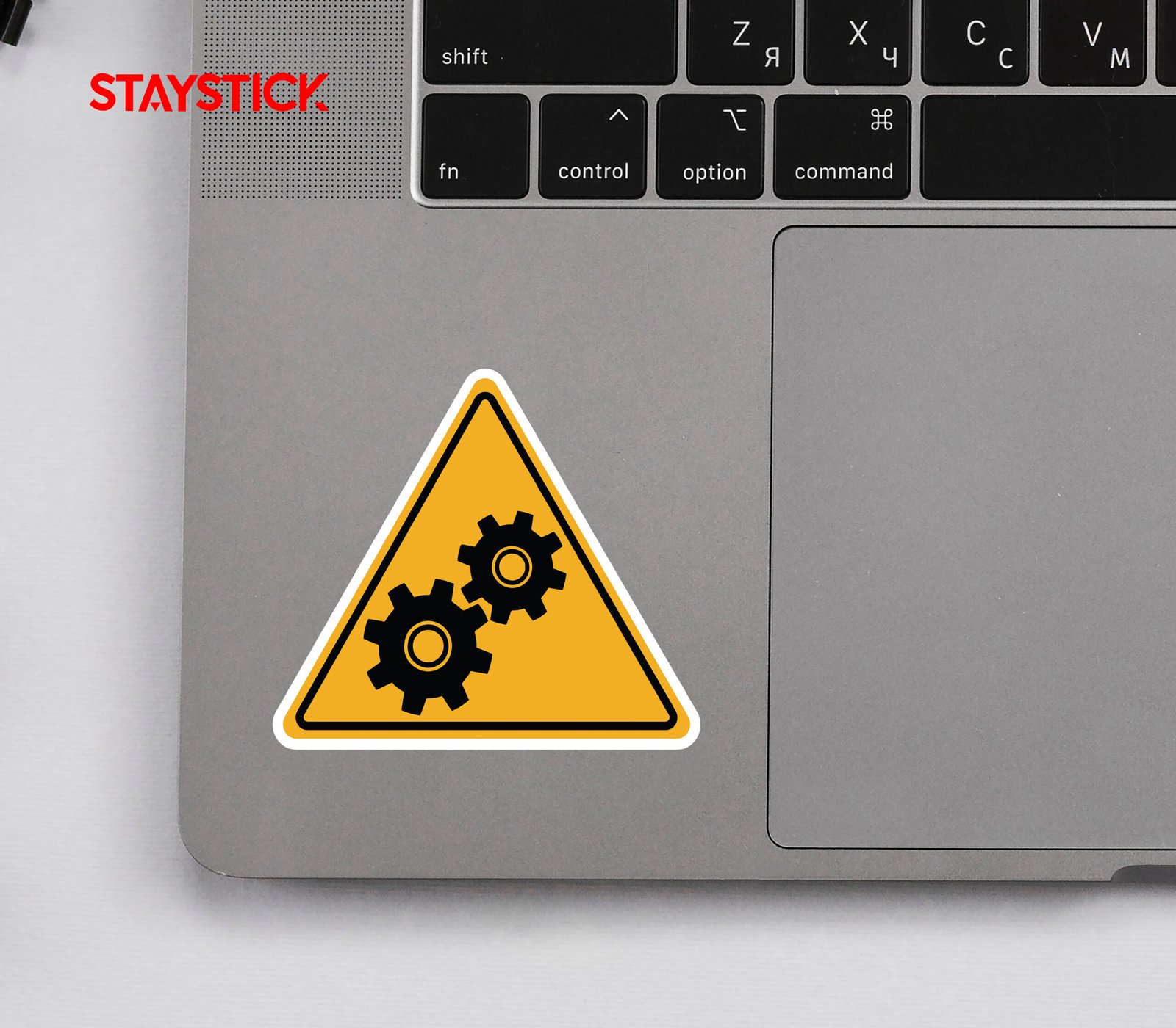 A yellow triangular warning sticker with two black gears, indicating machinery hazard or moving parts risk.