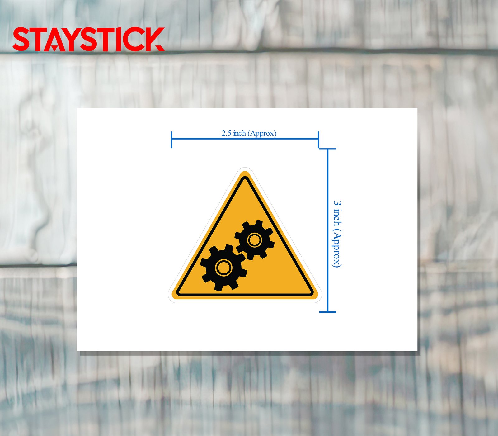 This warning sticker features a yellow triangular background with a bold black border and two interlocking gear symbols in the center. It is commonly used to indicate the presence of machinery with rotating or moving parts that may pose a danger of entanglement, crushing, or injury if not handled carefully. The design serves as a clear visual warning for workers and visitors to stay cautious around mechanical equipment, reminding them to follow safety measures such as keeping hands, clothing, and tools away from gears. Frequently used in factories, workshops, and industrial sites, this sticker is essential for promoting workplace safety and preventing accidents.