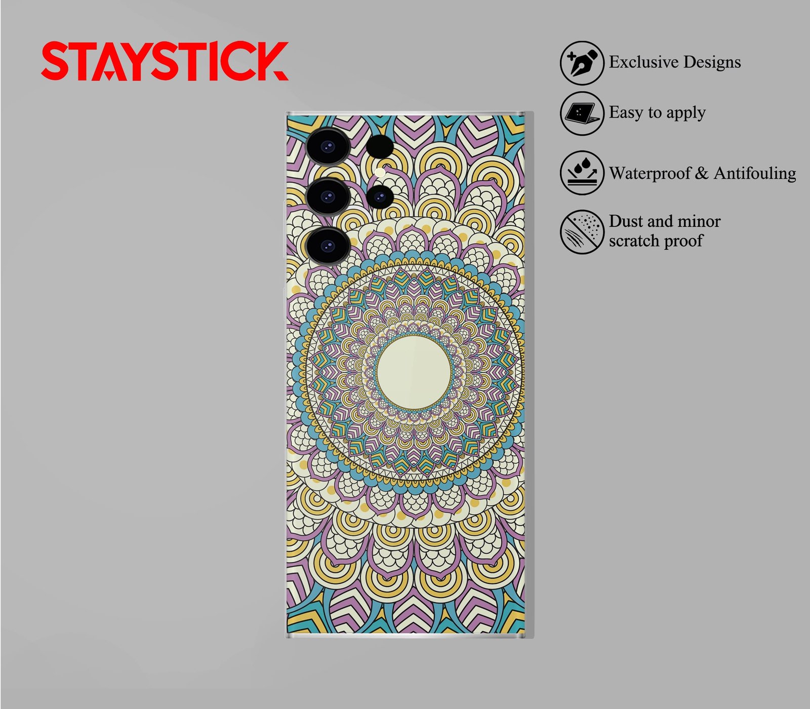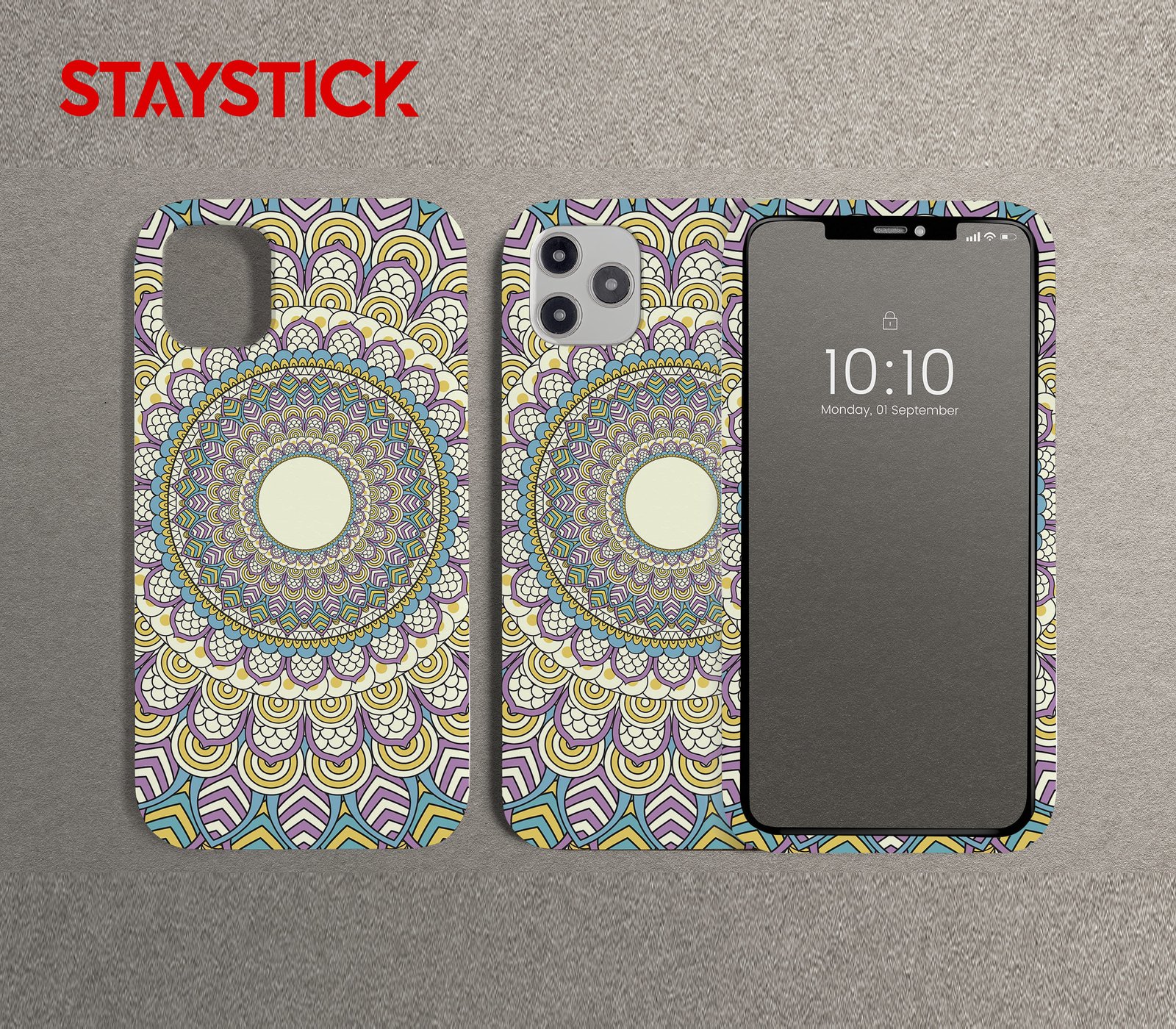 This beautifully crafted mobile back skin sticker showcases a stunning mandala-inspired design, blending traditional artistry with a modern color palette. The detailed circular patterns are arranged in multiple floral and geometric layers, highlighted with soft pastel shades of lavender, turquoise, golden yellow, and cream. Not only does this skin enhance the visual appeal of your device, but it also protects it from scratches and fingerprints while keeping the phone slim and smooth. Perfect for those who appreciate unique, boho, or artistic accessories, this sticker turns any phone into a piece of handheld art.