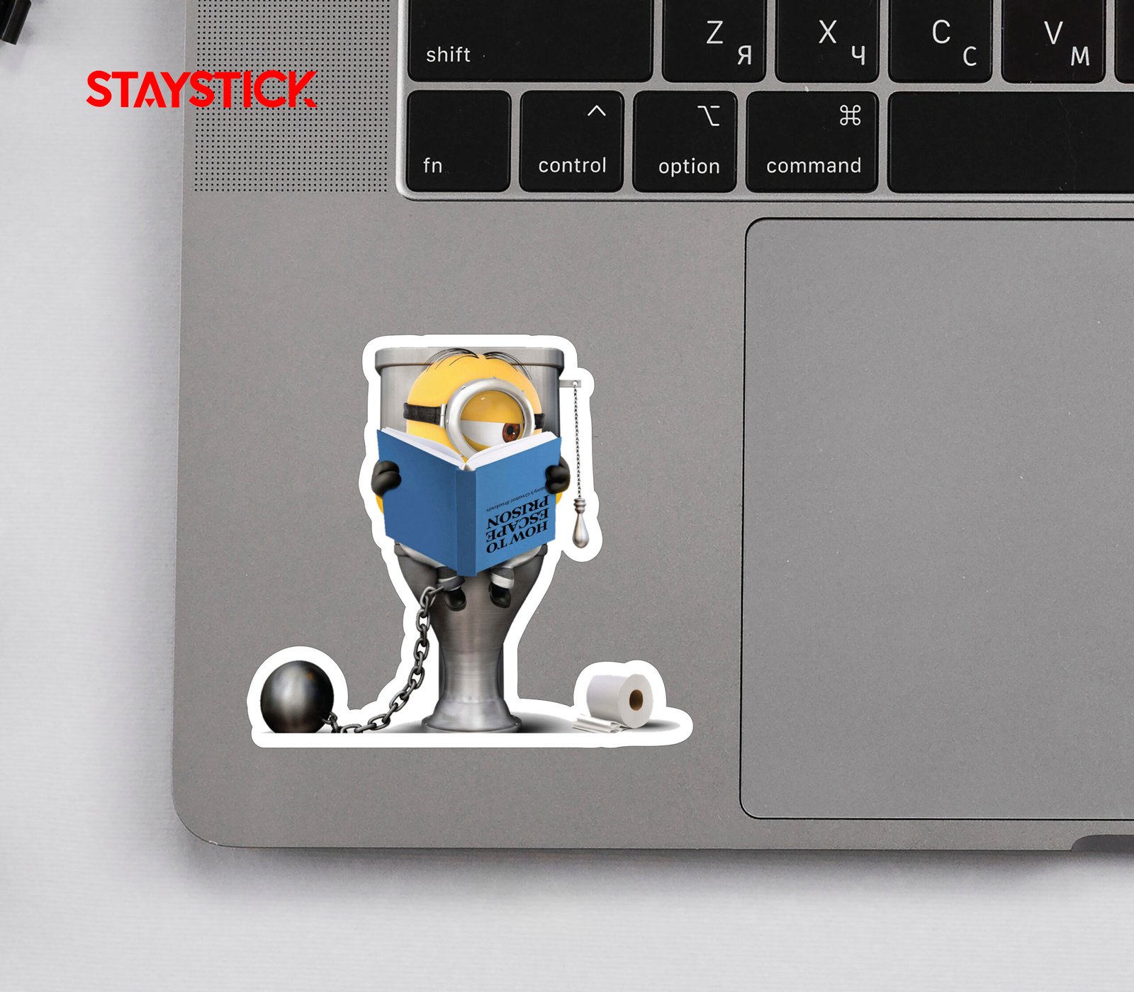 This funny 3D sticker captures the ultimate bathroom humor moment — a yellow minion chained to a toilet, studying his way to freedom! It’s bold, goofy, and perfect for fans who love a mix of silliness and creativity.