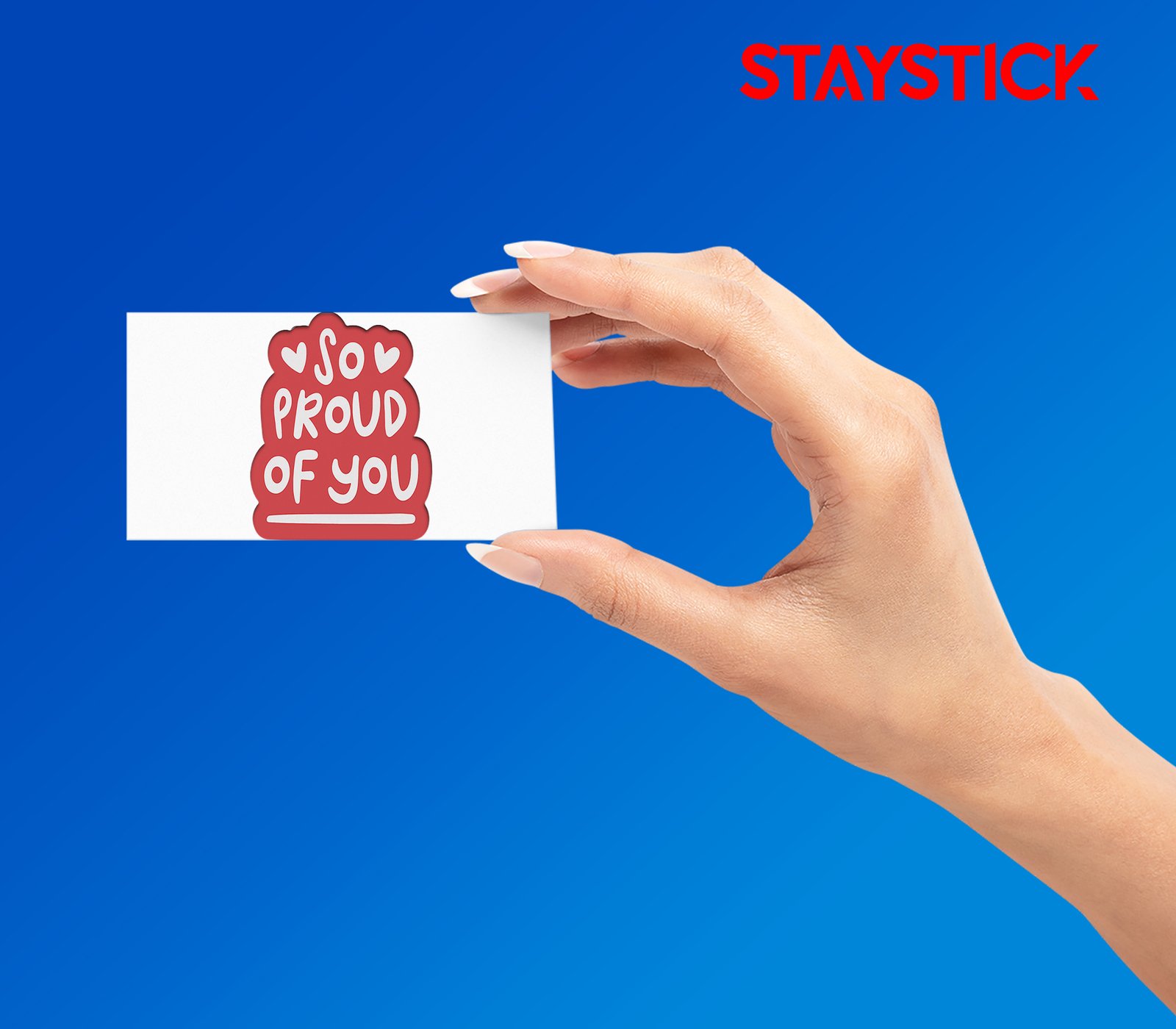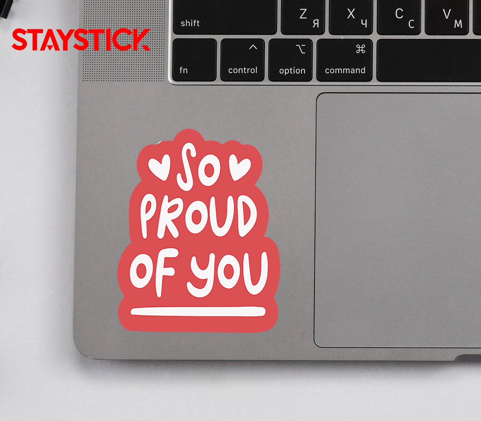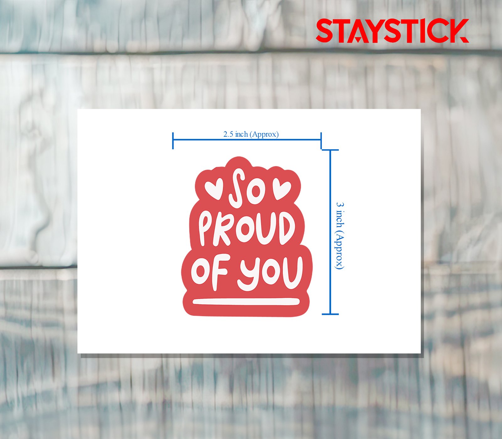 A motivational sticker with the words “So Proud of You” in playful white text on a red background, decorated with small heart icons.