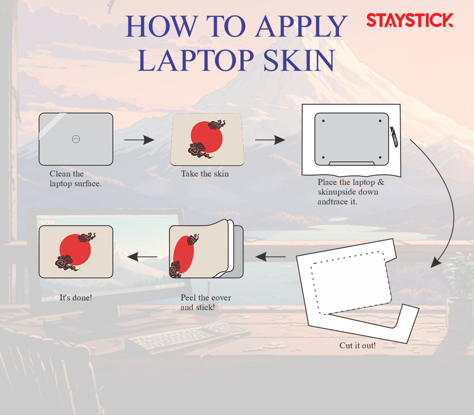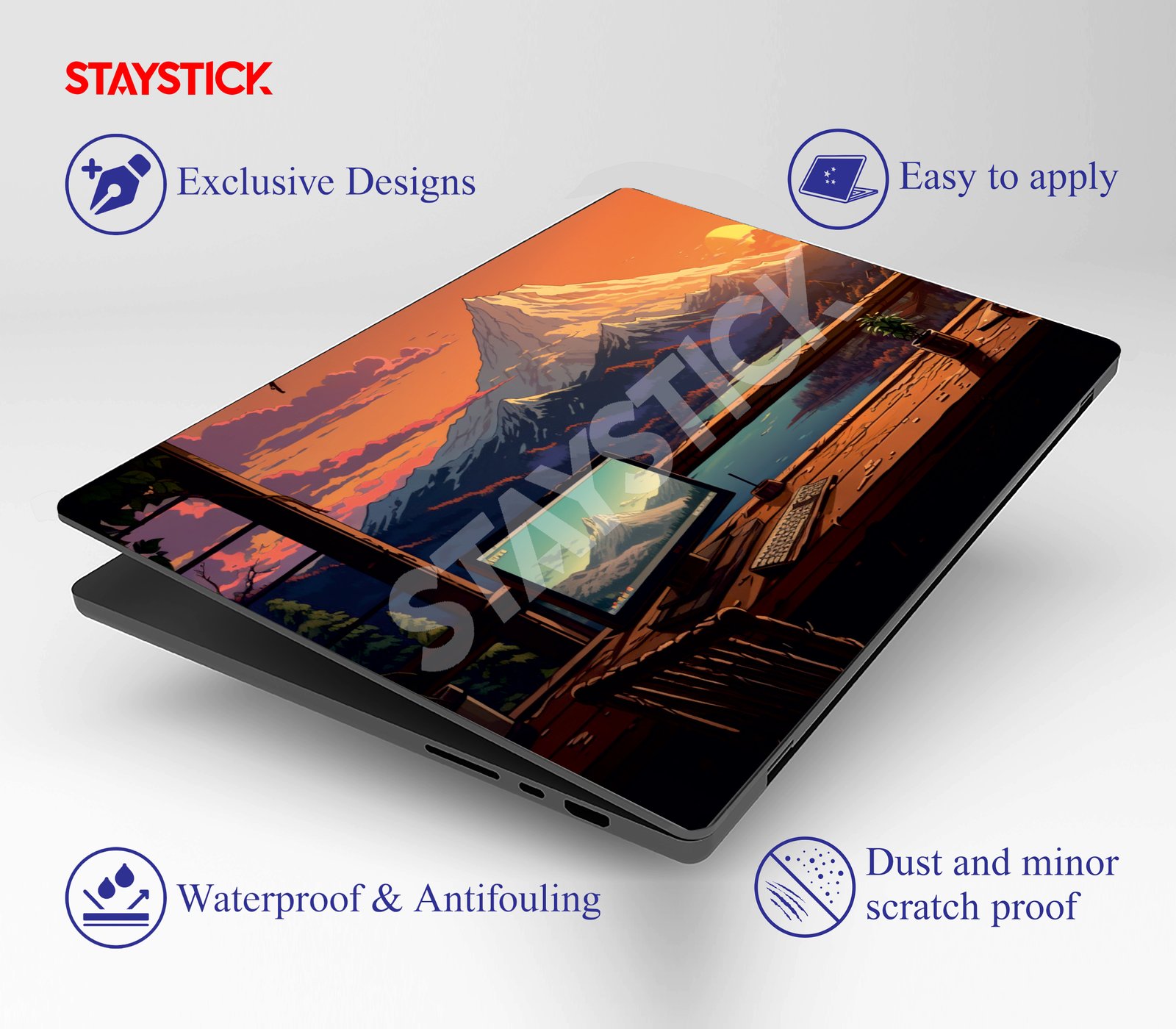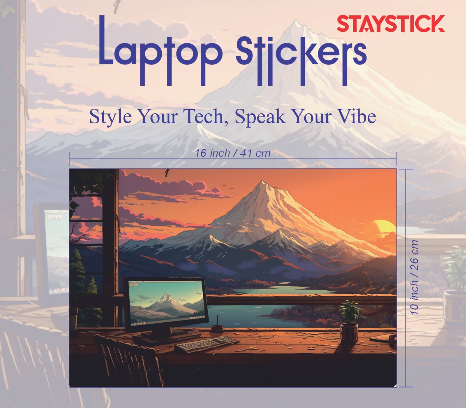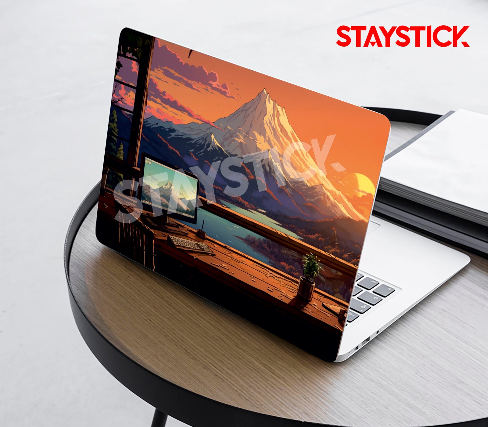 Bring the beauty of the great outdoors to your everyday workspace with our Mountain Sunset View Laptop Skin. This premium-quality laptop skin showcases a breathtaking illustrated landscape of a glowing sunset behind a majestic snow-capped mountain, calm blue waters, and a cozy wooden desk view. It creates a sense of peace, creativity, and inspiration—perfect for those who love nature and want their device to reflect their unique personality.
