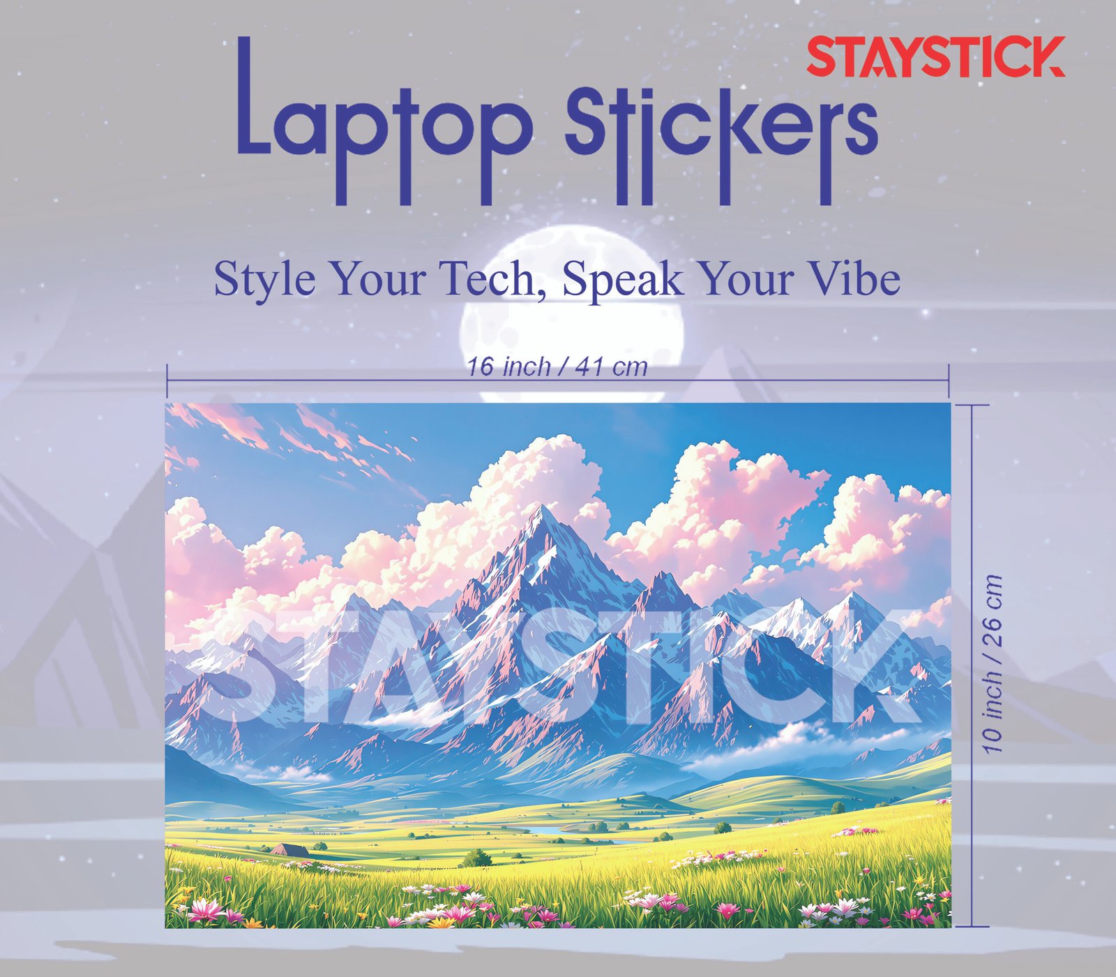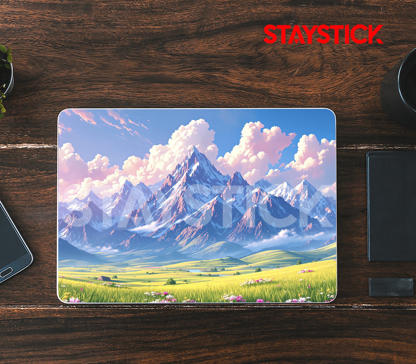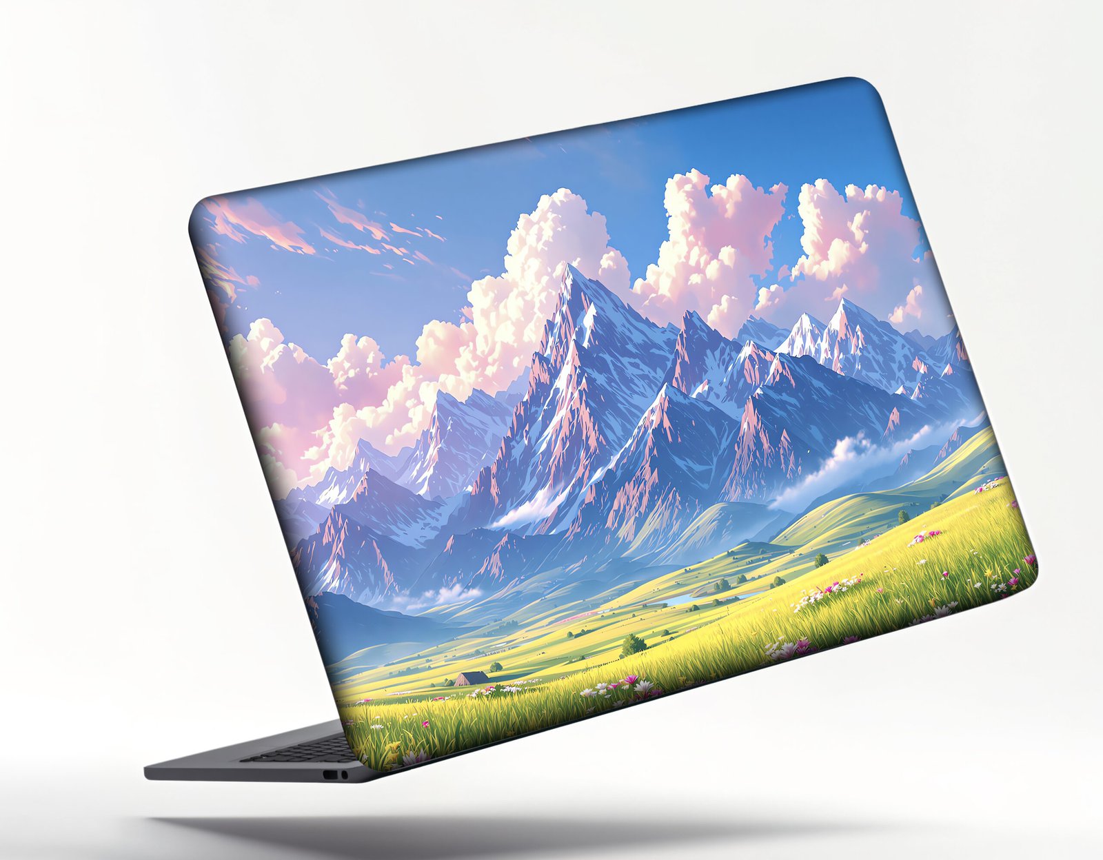 “This stunning laptop sticker transports you to a peaceful mountain valley, where towering snow-capped peaks meet rolling green meadows adorned with delicate wildflowers. The design captures the beauty of nature, with a vibrant sky painted in soft shades of pink, purple, and blue, featuring fluffy clouds drifting lazily across the horizon. The rich green grass and distant trees add depth to the scene, creating a tranquil and inspiring atmosphere. Perfect for those who appreciate nature’s beauty and wish to carry a bit of calm and serenity wherever they go, this sticker transforms your laptop into a picturesque window to the outdoors.