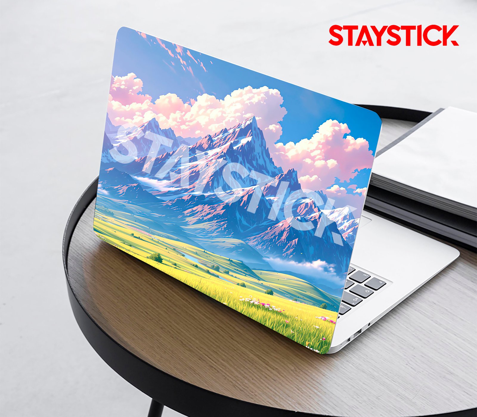 “A scenic laptop sticker with snow-capped mountains, rolling meadows, and a vibrant sky filled with clouds.