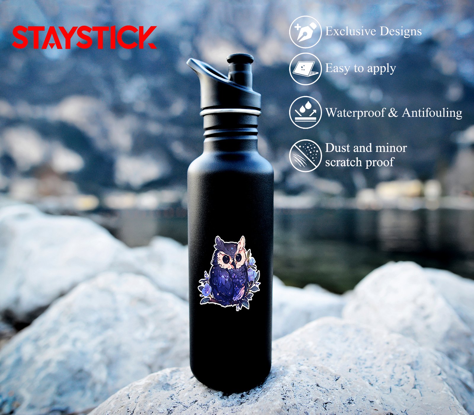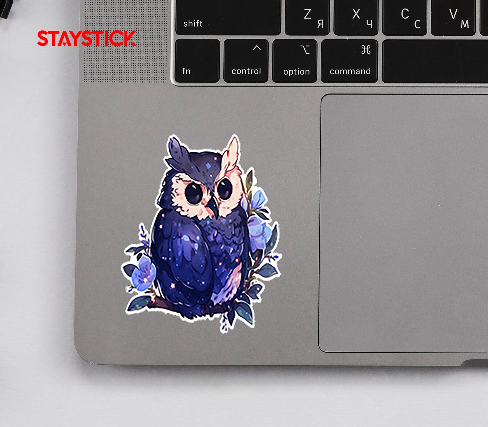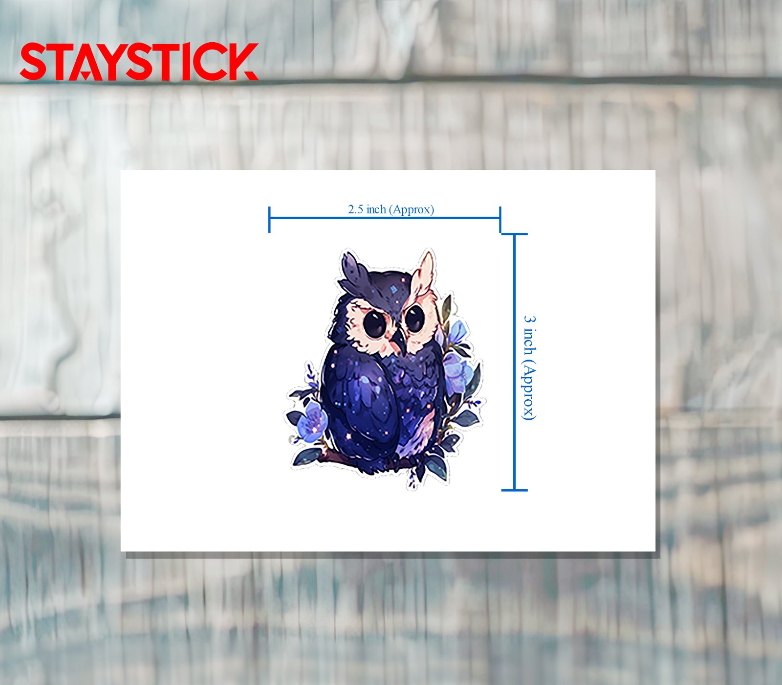 Soft, collectible decal showing the owl perched on a floral branch, rendered in pastel blues and violet highlights with a prismatic sheen that shifts color when tilted—elegant, whimsical, and merch-ready.
