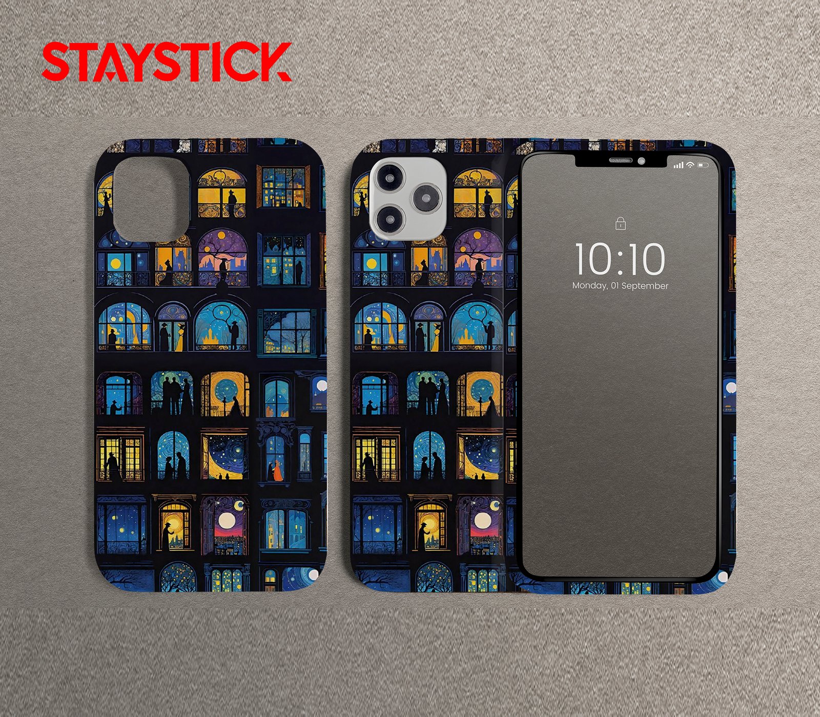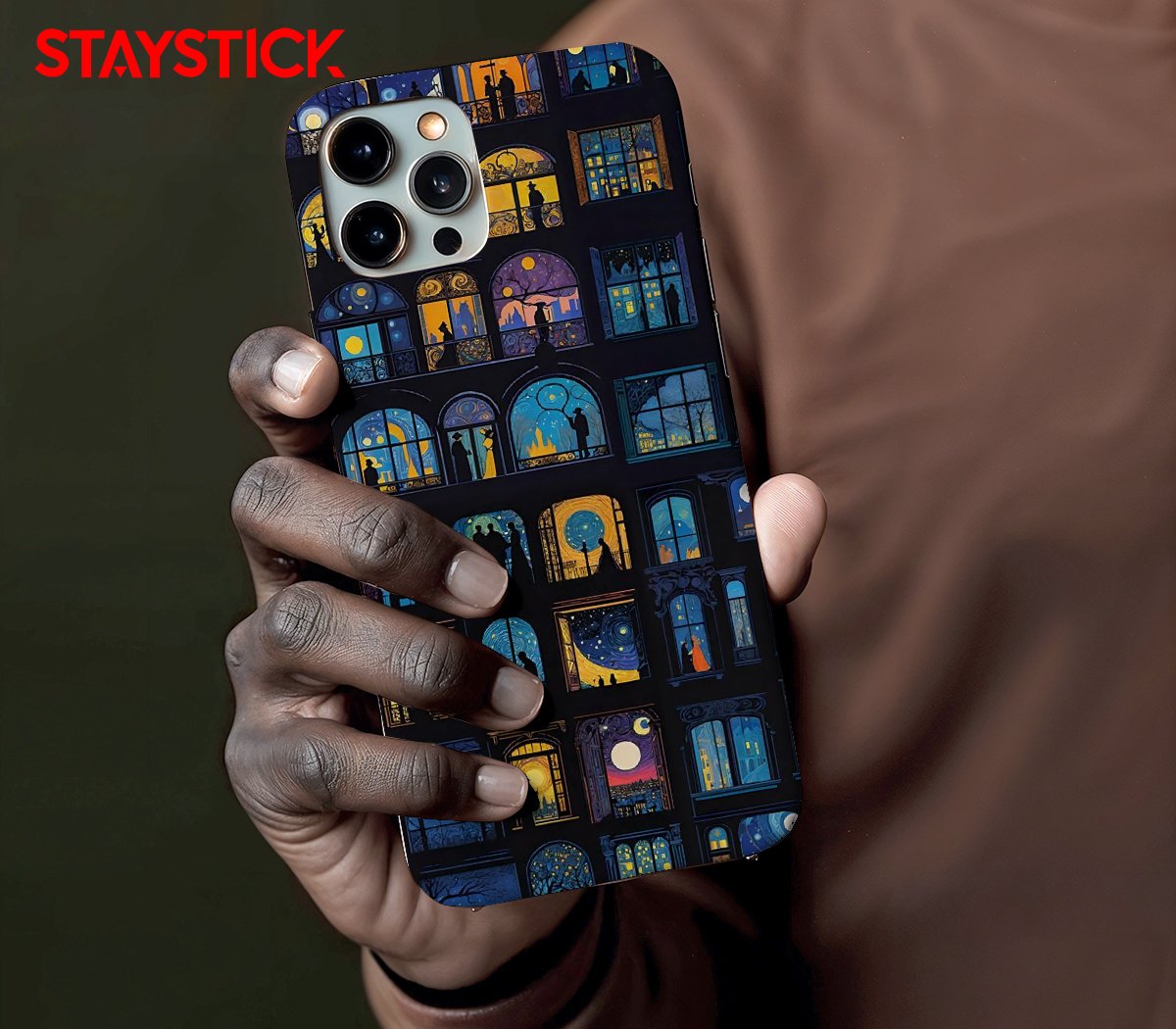 A vertical sticker of ornate windows, each a miniature nocturne blending Van Gogh–like swirls and warm lamp light; silhouetted people and city skylines create poetic, story-rich vignettes that reward close viewing.