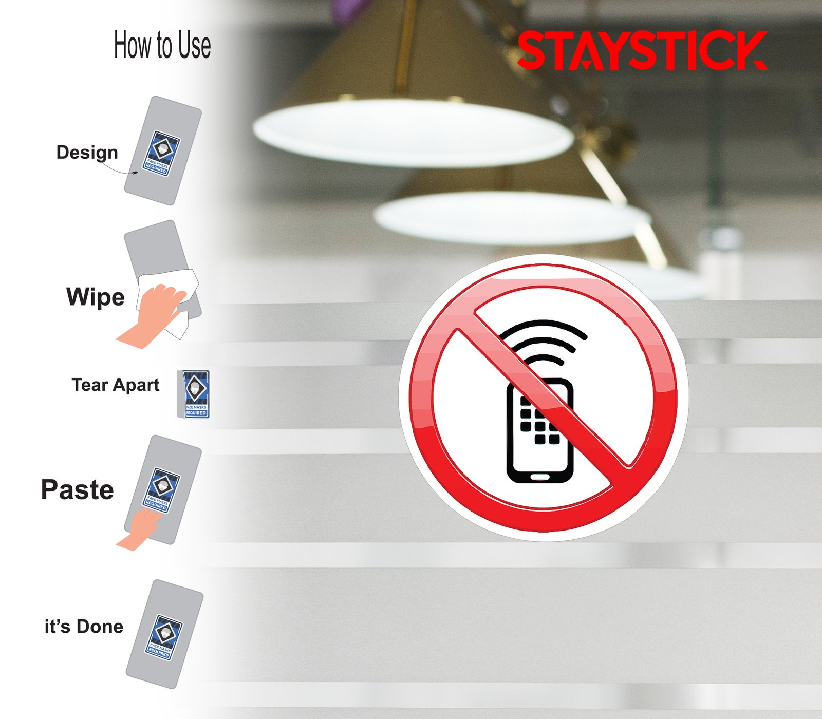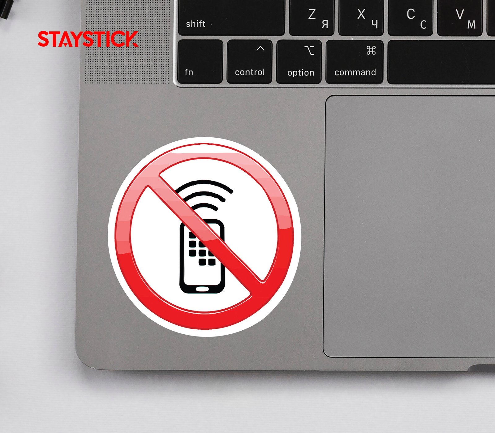 “Sticker with a phone symbol crossed out.No mobile phones allowed in this area.Prohibition sign showing cell phone with signals.”