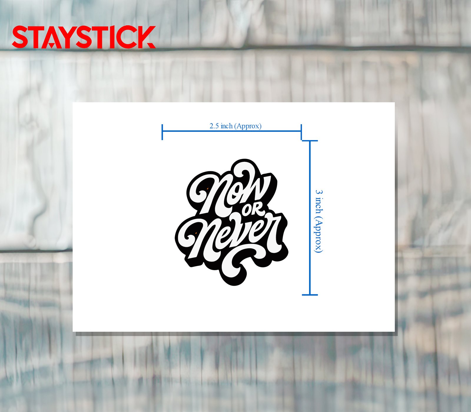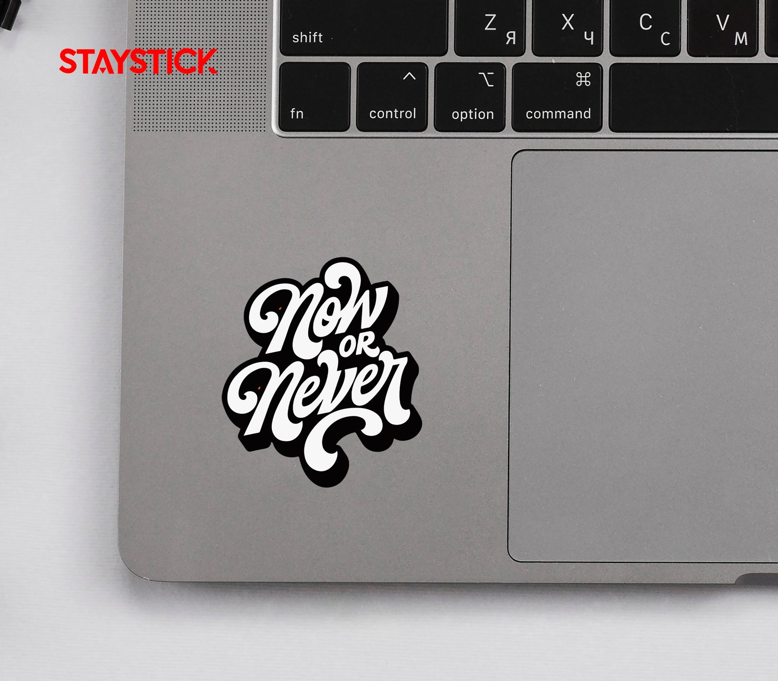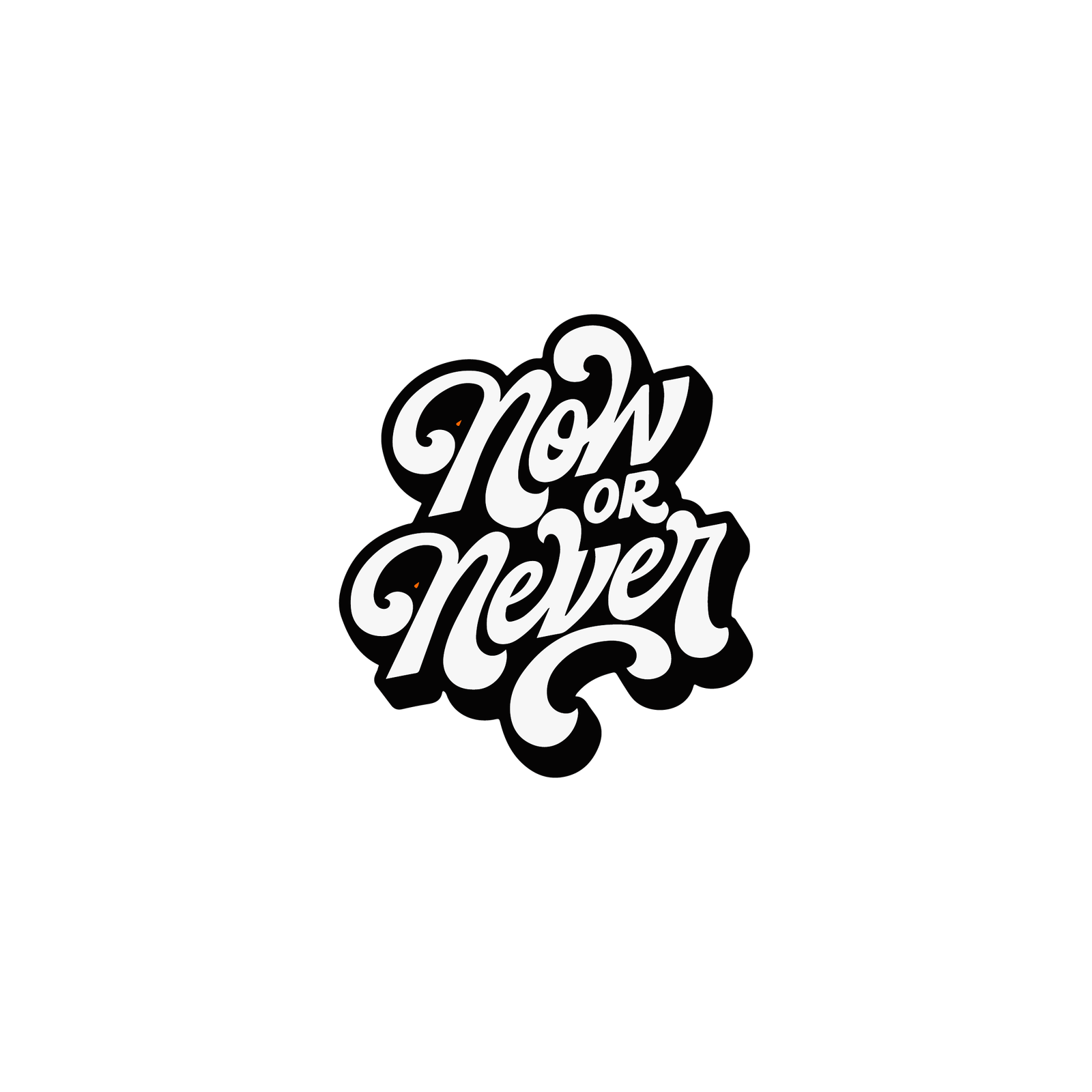 Hand-lettered sticker: “Now or Never” in flowing white script with bold white die-cut trim.