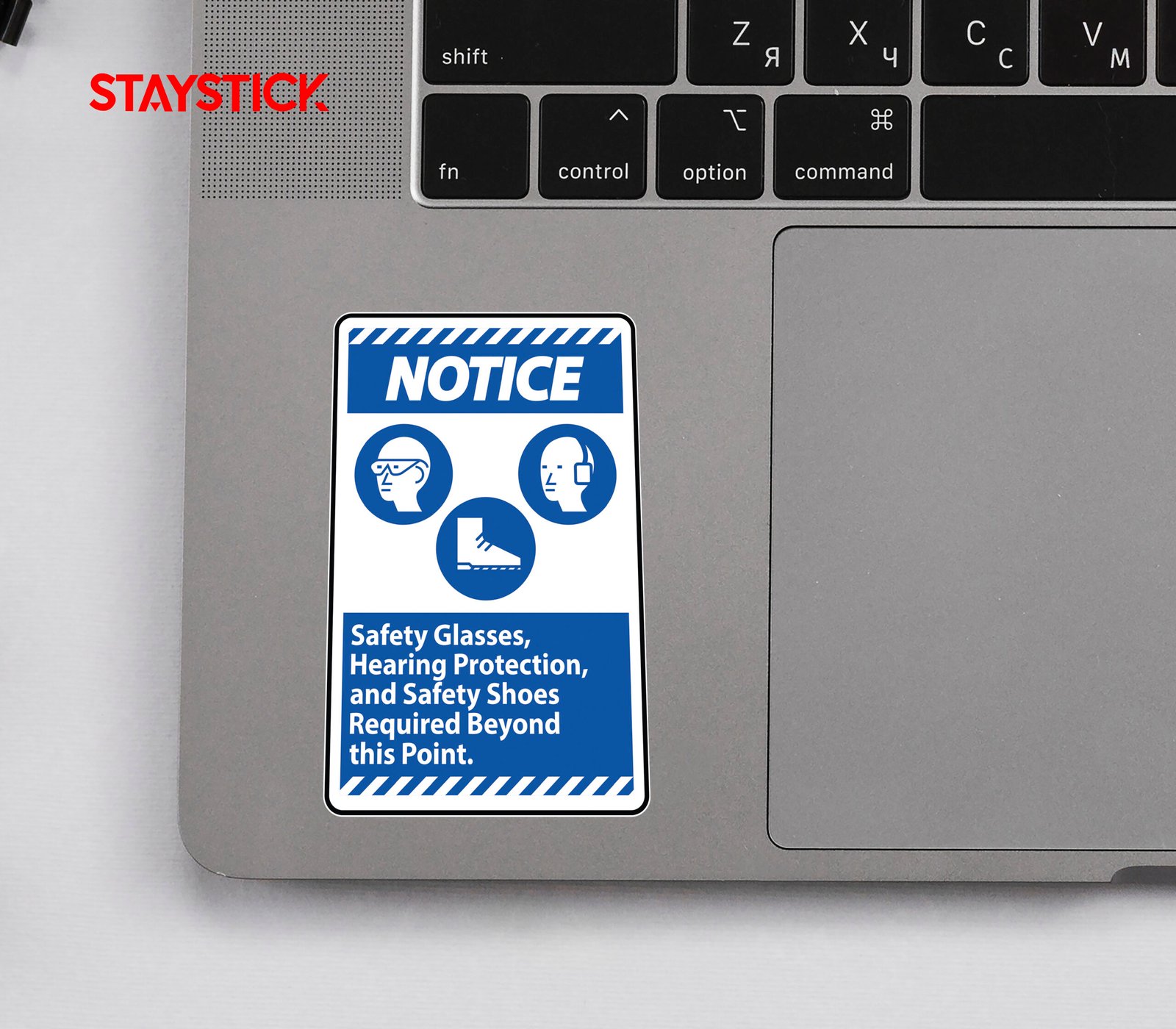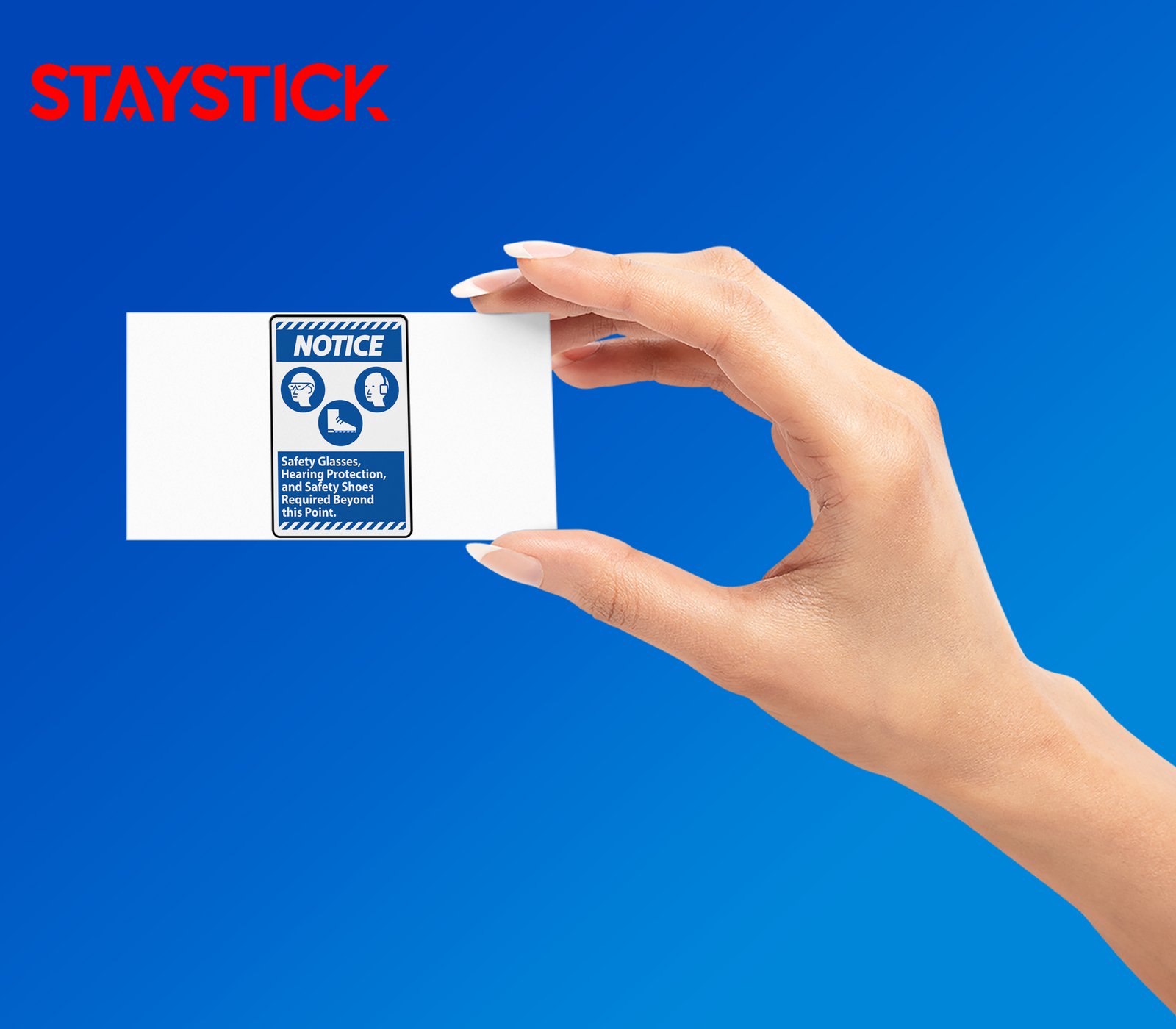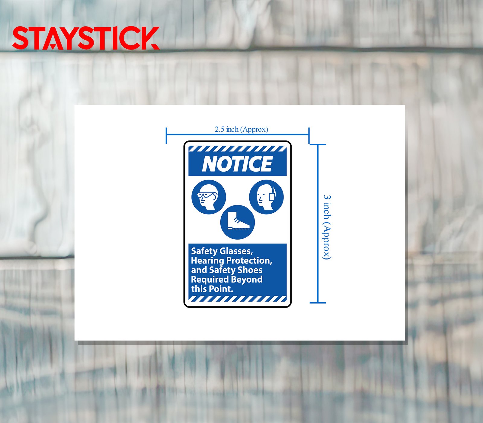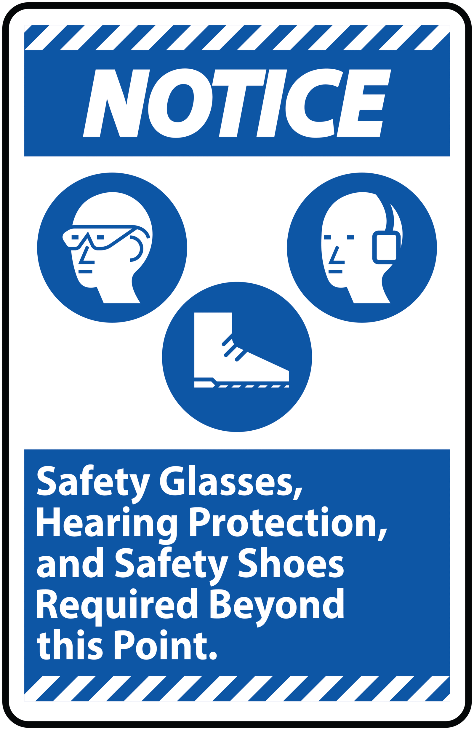 This safety notice sticker is designed to clearly communicate workplace protection requirements. It features a bold blue “NOTICE” header along with easy-to-recognize icons representing safety glasses, hearing protection, and safety shoes. The accompanying text, “Safety Glasses, Hearing Protection, and Safety Shoes Required Beyond this Point,” ensures that workers and visitors are immediately aware of the mandatory personal protective equipment (PPE) needed in the area. With its high-contrast blue and white design, the sticker is easily visible and effective in reminding individuals to comply with occupational safety regulations, making it an essential addition to factories, warehouses, construction zones, and other industrial environments.