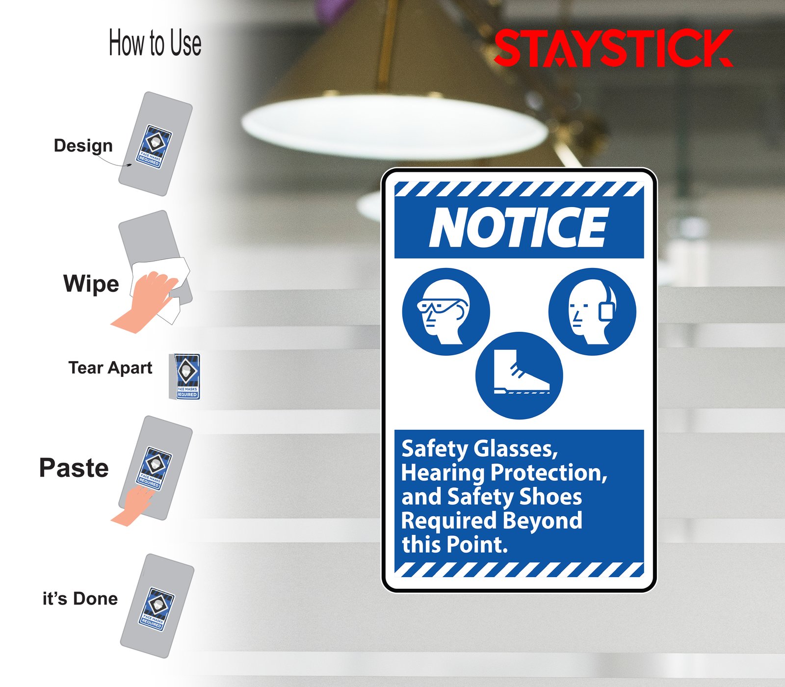 “Notice Sign – Safety Glasses, Hearing Protection, and Safety Shoes Required.Mandatory PPE Notice Sticker for Workplace Safety Compliance.”
