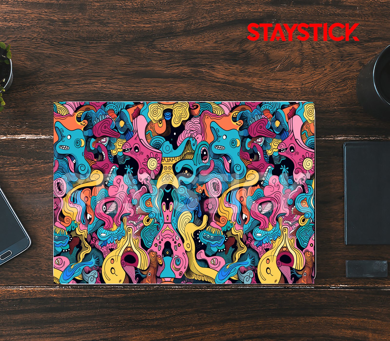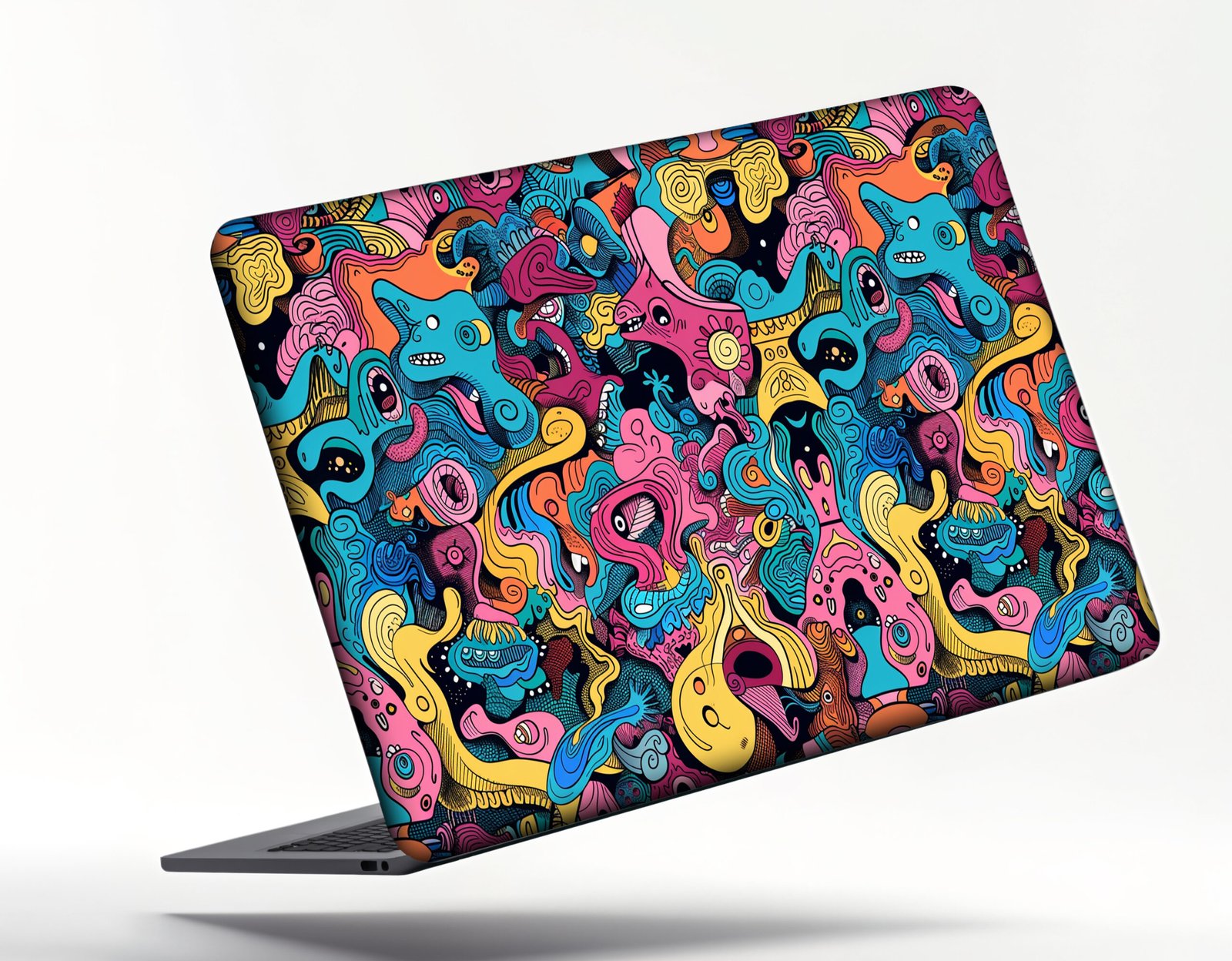 This laptop sticker showcases a stunningly intricate psychedelic design, packed with a variety of abstract shapes, fluid waves, and playful cartoon-like creatures. The artwork bursts with a vibrant color palette — including deep blues, hot pinks, sunny yellows, fiery oranges, and subtle black accents — creating a sense of energy and movement. The densely packed, swirling elements intertwine seamlessly, giving the sticker a chaotic yet harmonious look that’s perfect for those who enjoy bold, artistic, and eye-catching laptop decorations. It adds a unique personality to any device, transforming a plain laptop into a portable piece of modern pop-art.