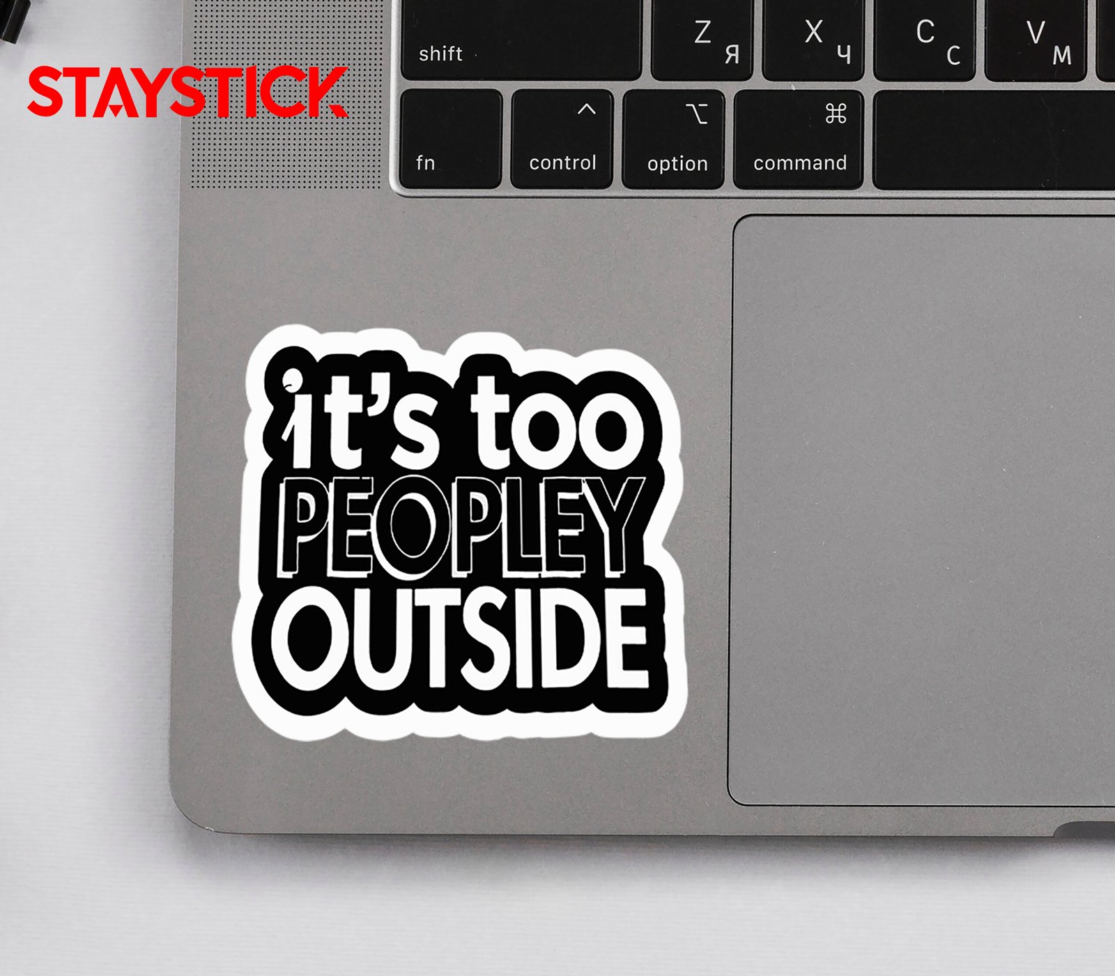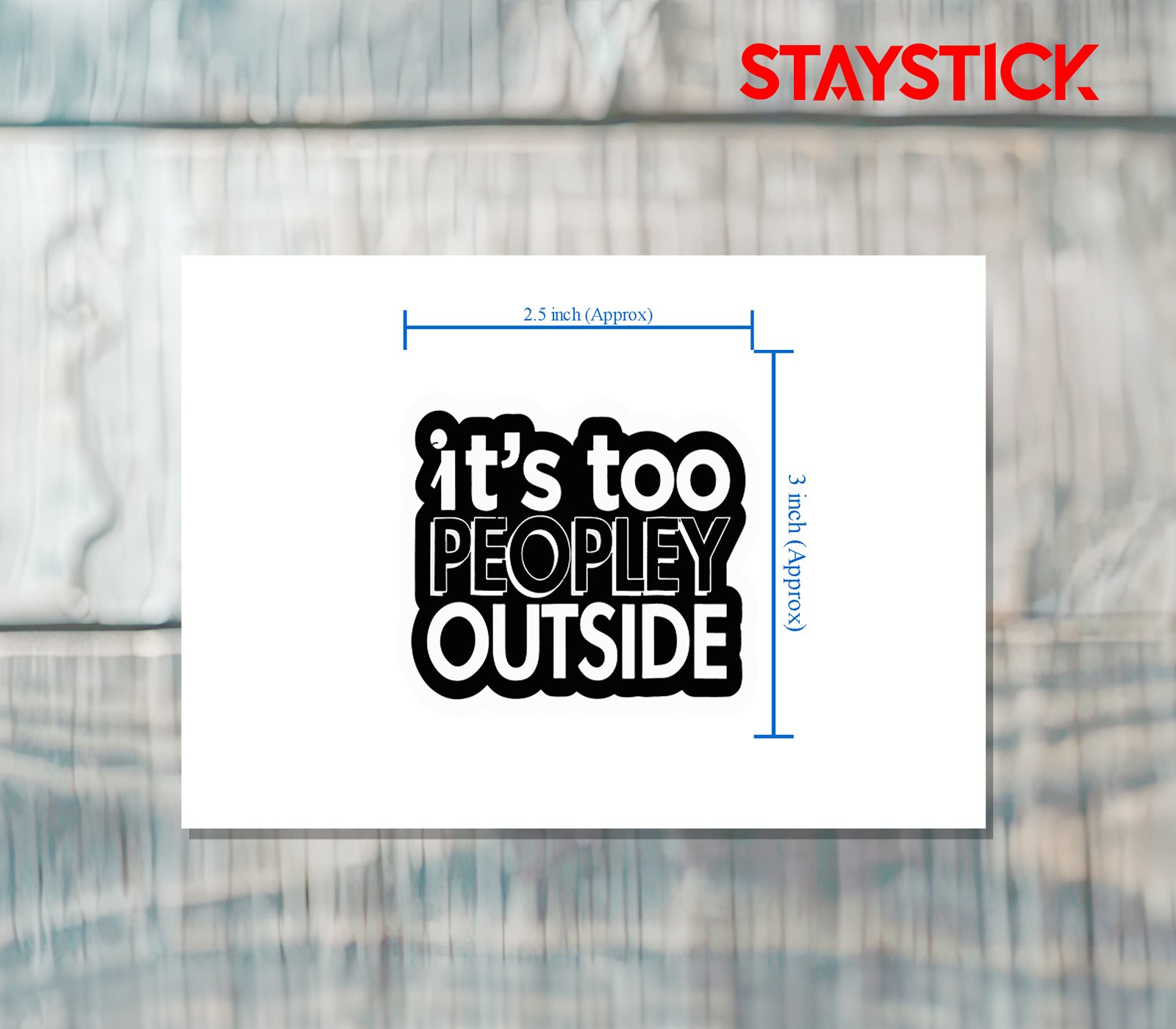 “A fun and relatable sticker that humorously says ‘It’s too peopley outside’, perfect for introverts and homebodies.”
