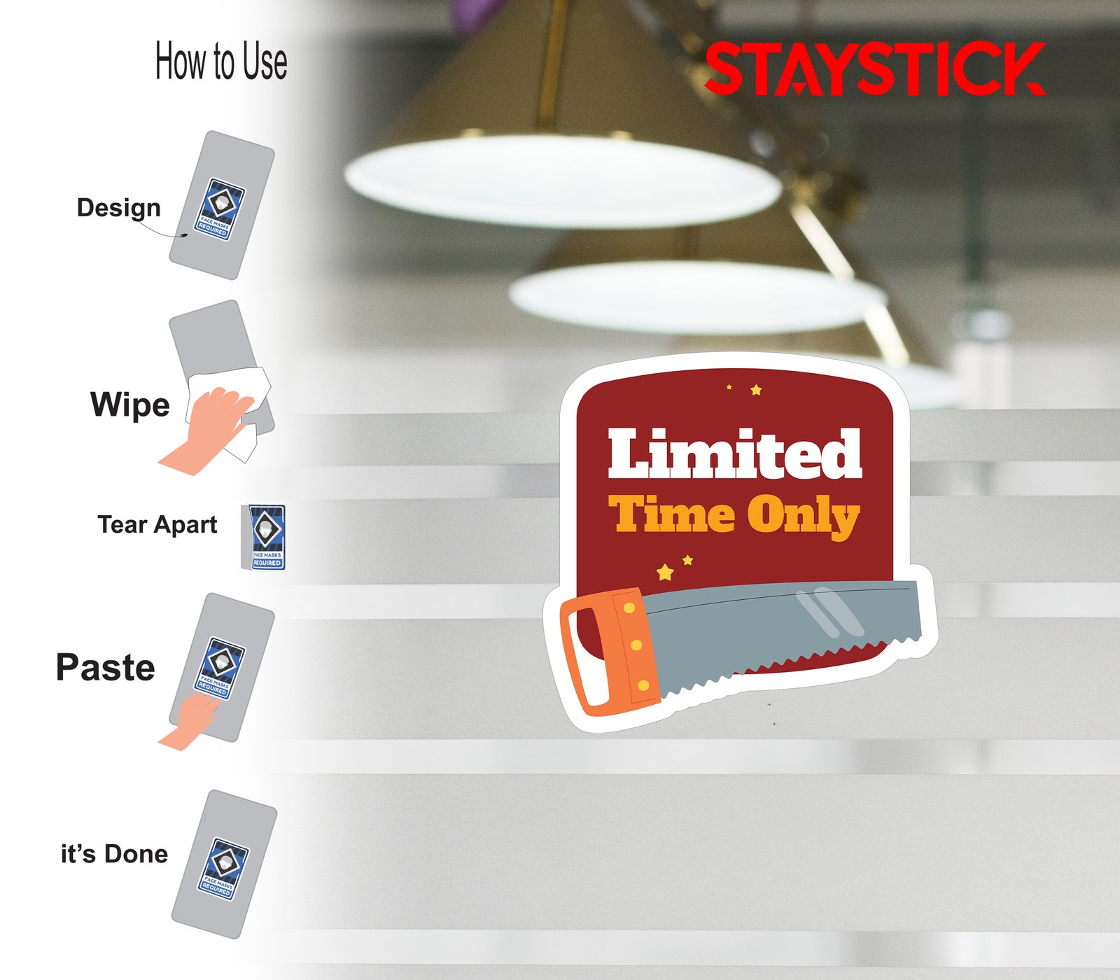 “This eye-catching promotional sticker is perfect for highlighting exclusive deals and time-sensitive offers. Featuring a striking red background with the bold text Limited Time Only, it instantly draws attention and creates urgency. The addition of a saw graphic gives it a creative, rugged touch, making it suitable for both retail promotions and construction or tool-related campaigns. Whether used in stores, product packaging, or online promotions, this sticker is designed to attract customers, encourage quick action, and emphasize the limited availability of special offers.”