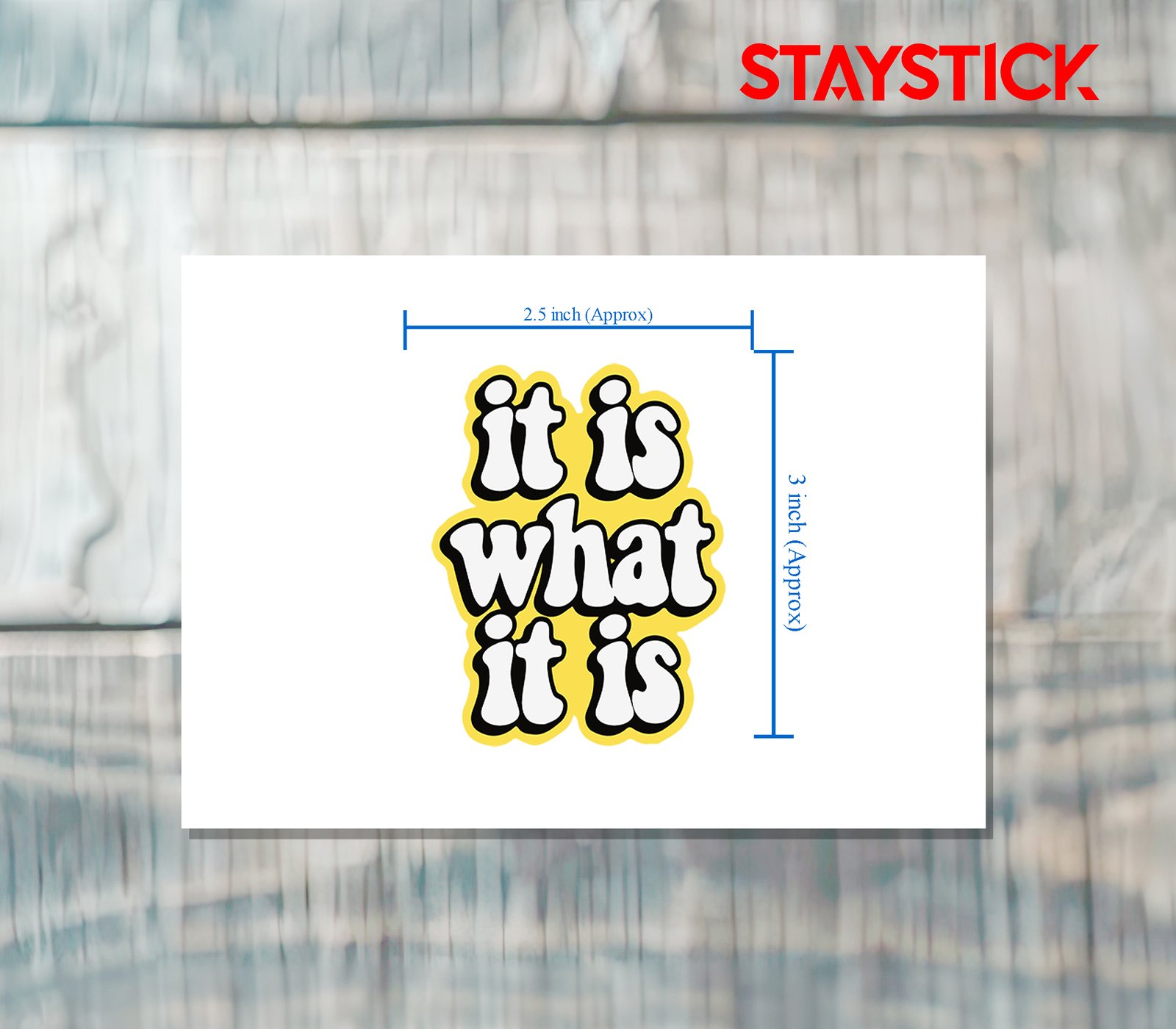 This sticker showcases the popular phrase “it is what it is” in a bold, retro-inspired font with a smooth white fill, outlined in black and accented by a bright yellow border. The design carries a relaxed, carefree energy, serving as a reminder to accept life as it comes and embrace situations without stress or overthinking. Its eye-catching style and vibrant colors make it perfect for decorating laptops, water bottles, notebooks, or any personal items, adding both aesthetic appeal and a touch of laid-back positivity to your everyday essentials.
